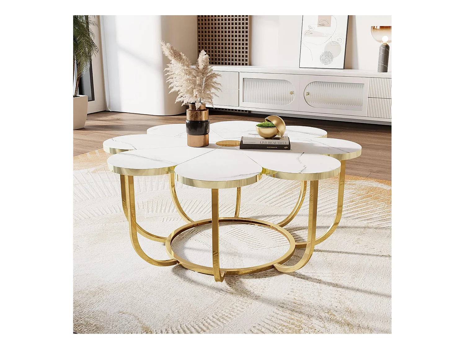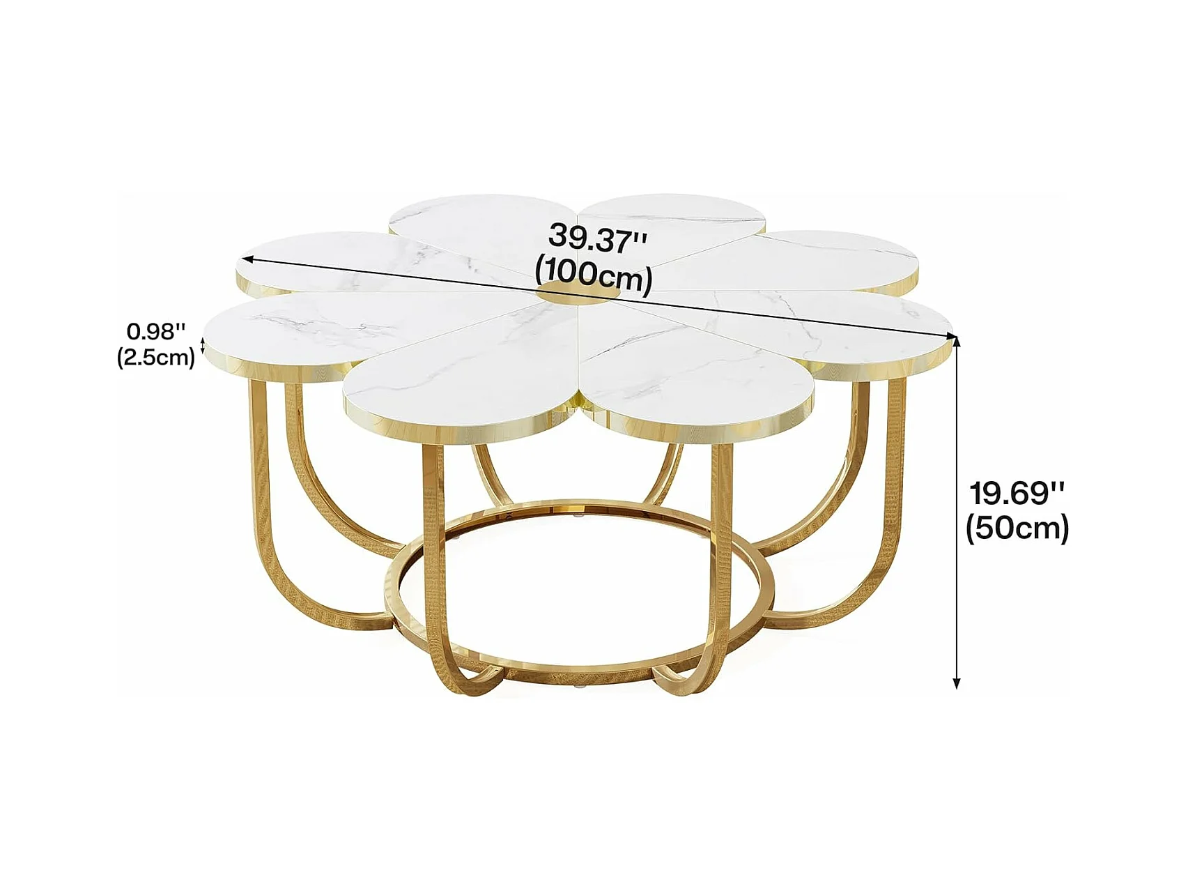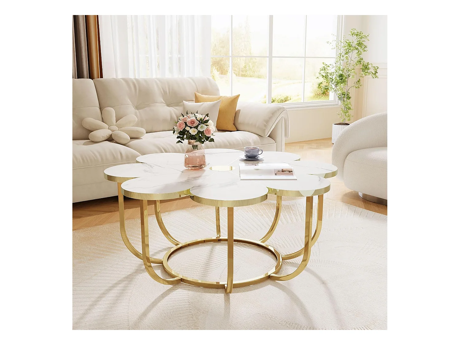 Weißer und goldener Couchtisch, 100 cm moderner Couchtisch in Blumenform mit Kunstmarmorplatte, floraler Akzenttisch in der Mitte mit Metallrahmen für Wohnzimmer, Schlafzimmer