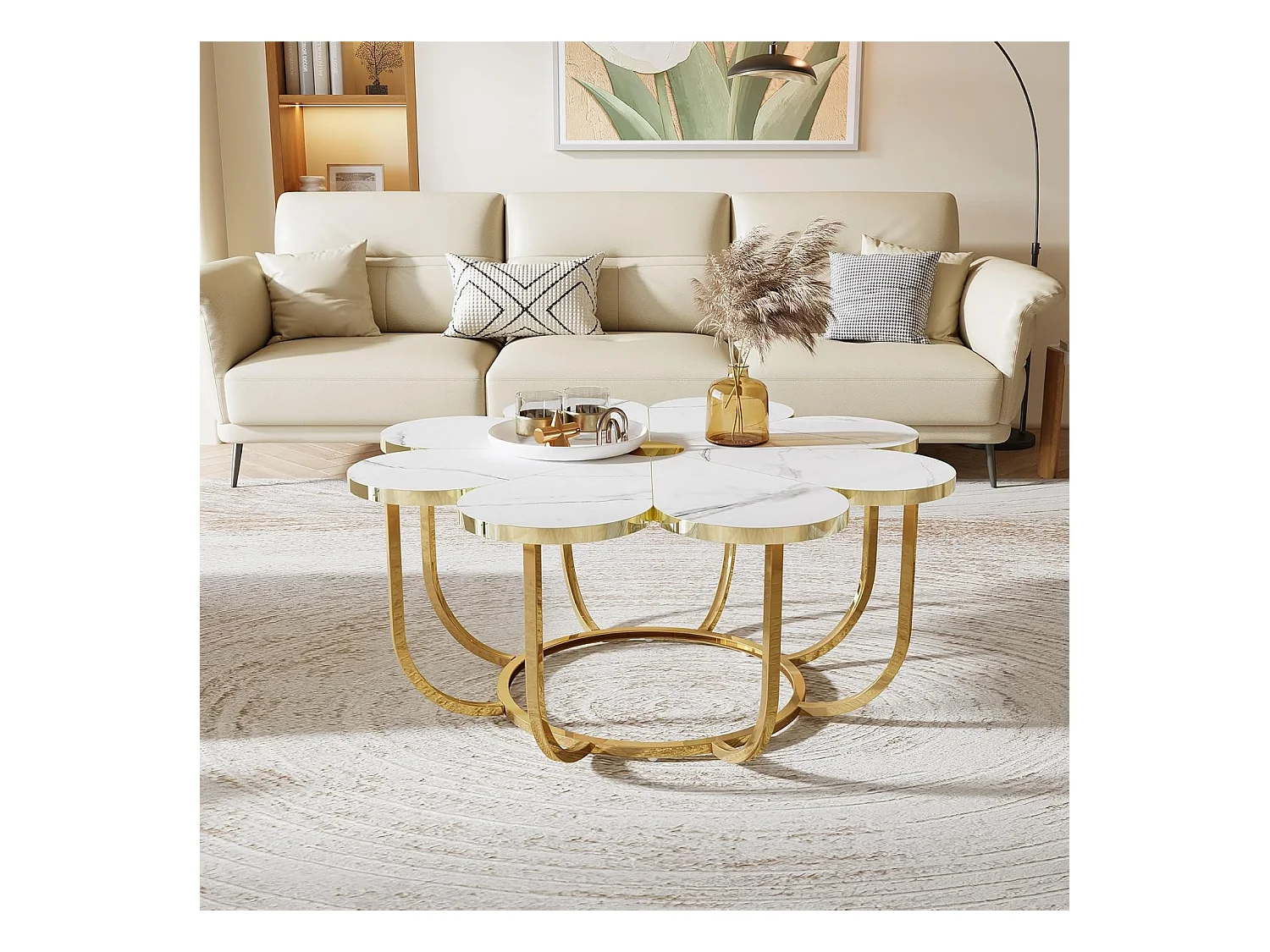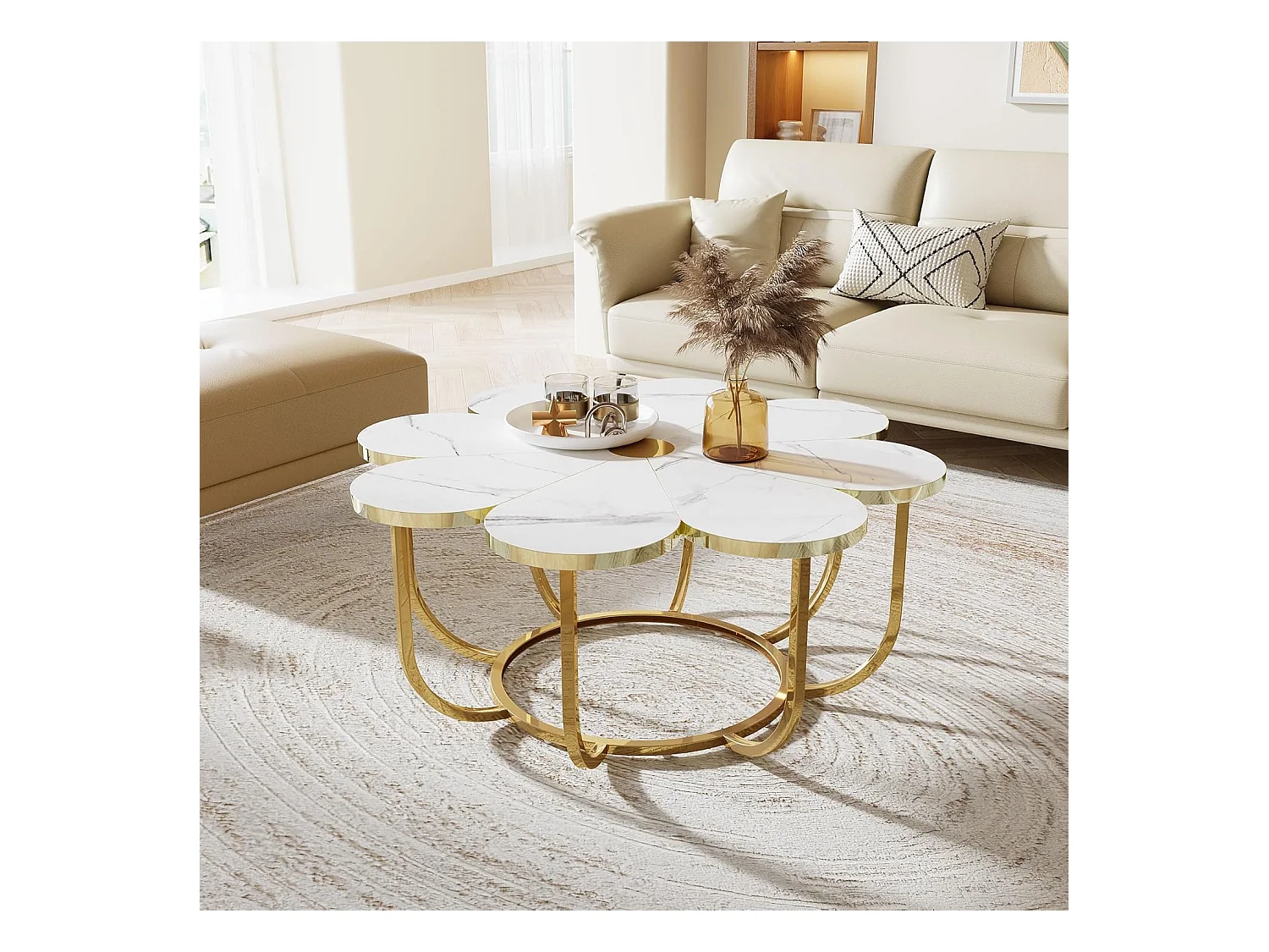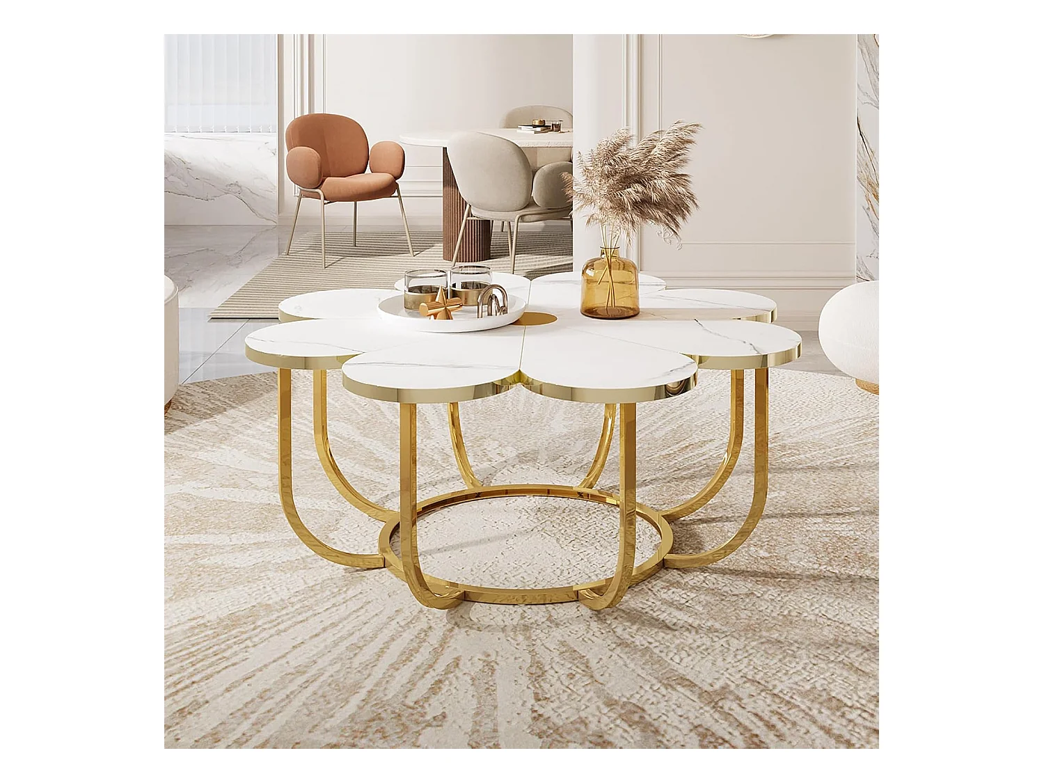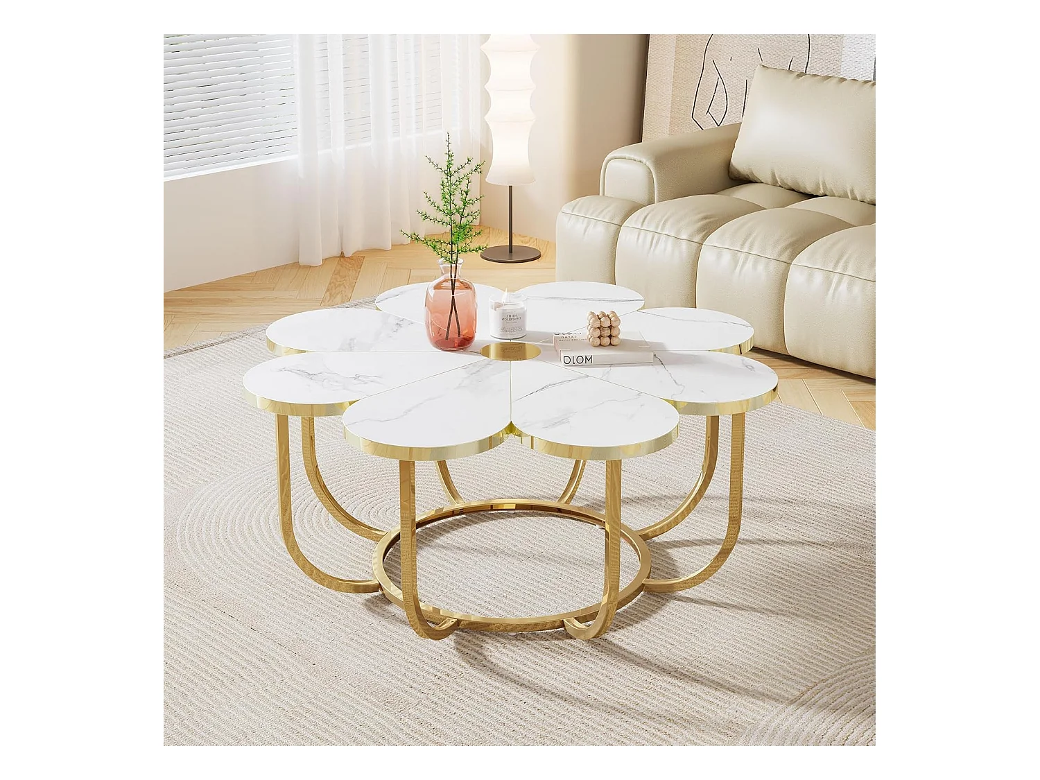 Weißer und goldener Couchtisch, 100 cm moderner Couchtisch in Blumenform mit Kunstmarmorplatte, floraler Akzenttisch in der Mitte mit Metallrahmen für Wohnzimmer, Schlafzimmer