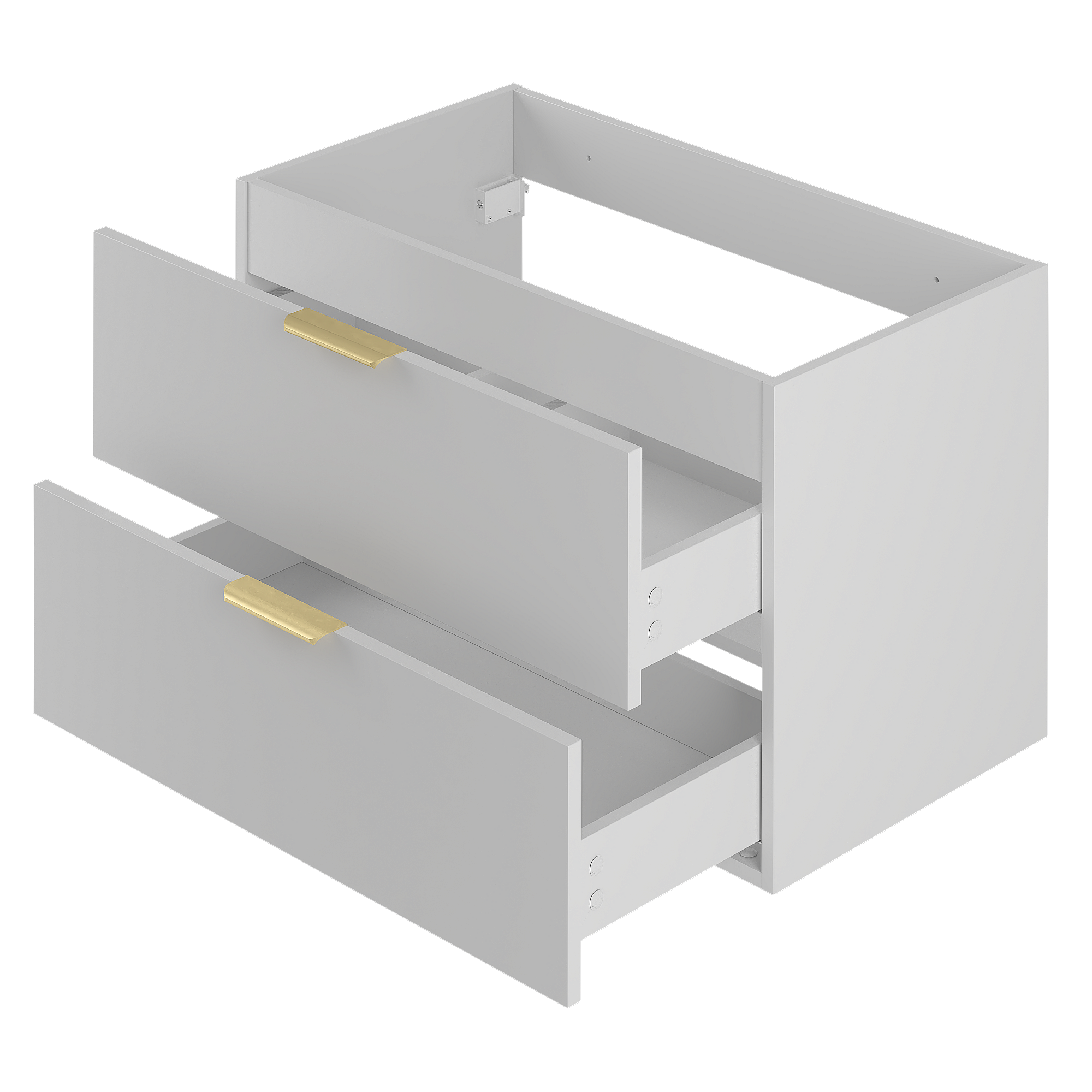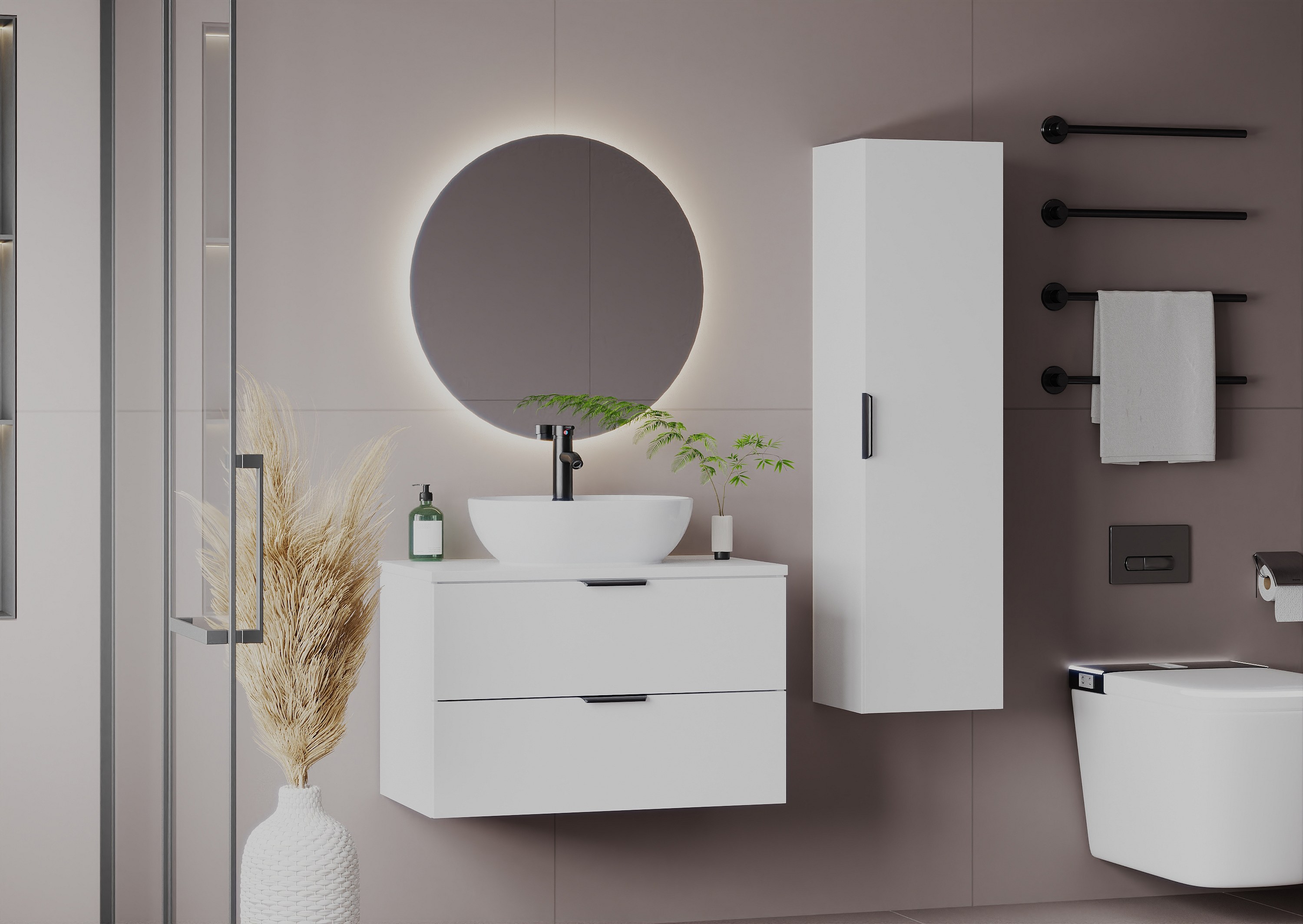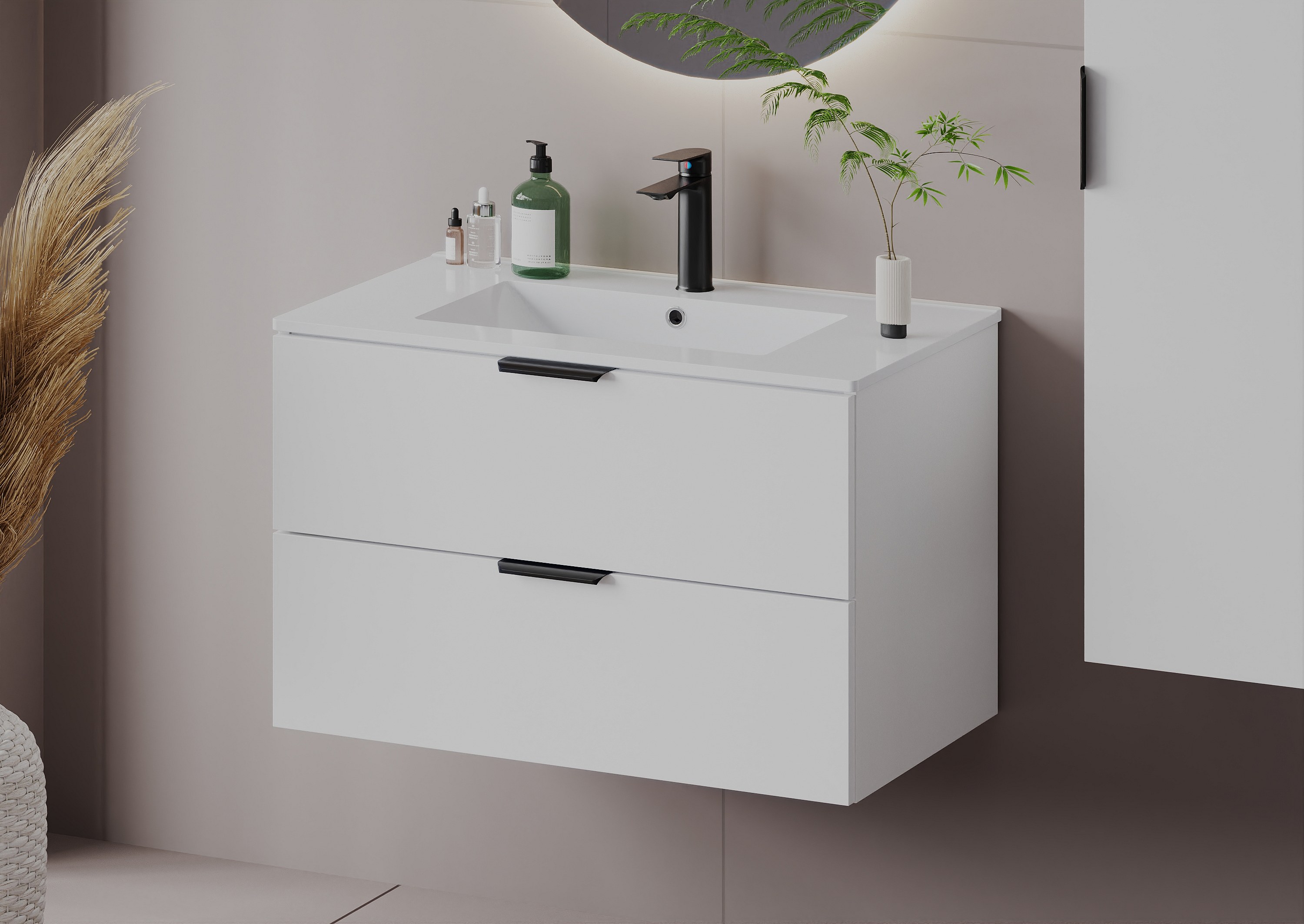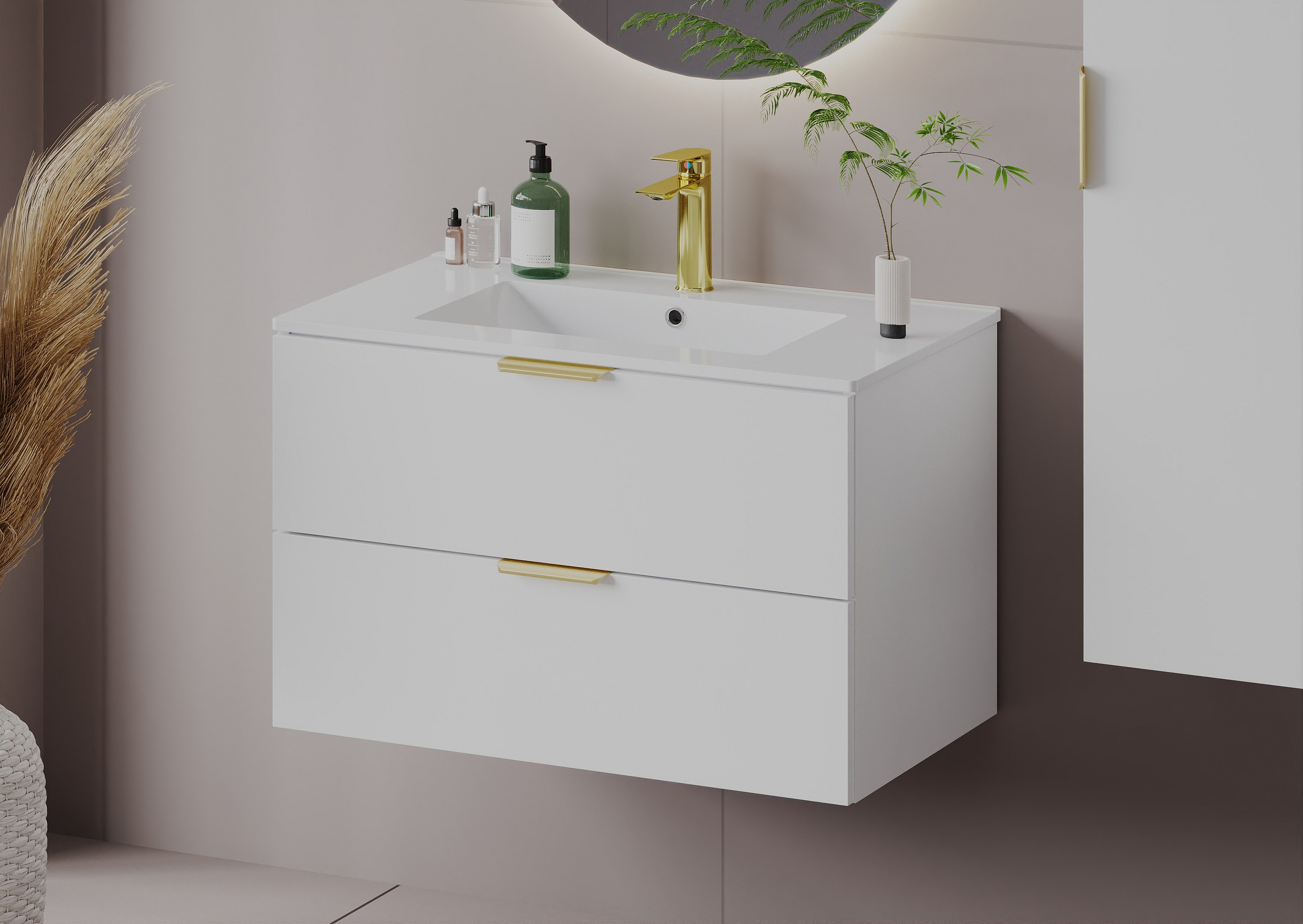 Auffällig sind die minimalistischen, glatten Fronten und die einzigartigen Akzente in Form von Griffen – zu jedem Schrank gehören drei verschiedene Farbvarianten: Schwarz, Gold und Chrom. Diese Lösung bietet volle Freiheit bei der Anpassung der Möbel an die gewählte Armatur und den Stil des Interieurs. Alle Elemente der Kollektion sind hängend und mit einem Soft-Close-System ausgestattet, was den Komfort im täglichen Gebrauch erhöht.