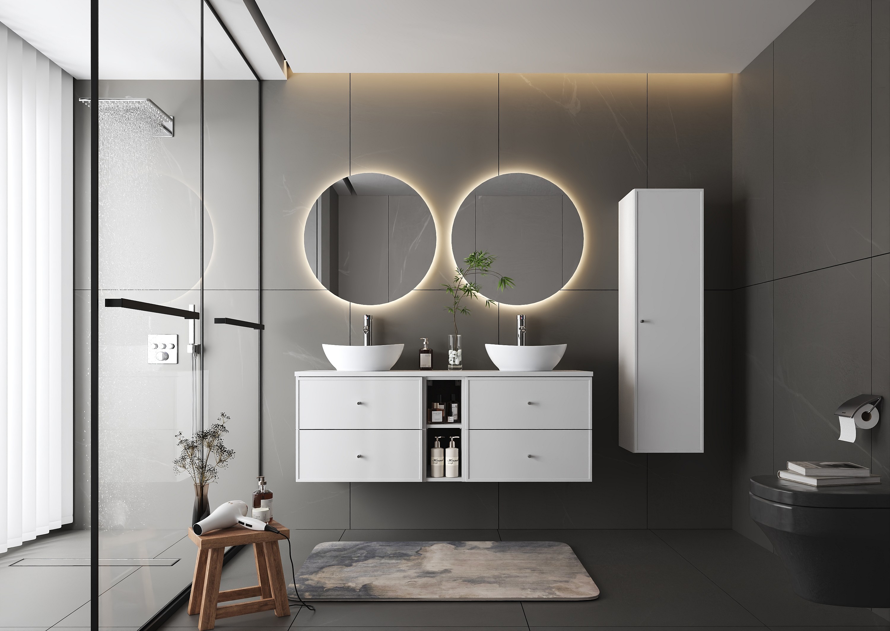 Weißes Badezimmer-Set 140 cm Schrank Regal Waschtischplatte Waschbecken Marco