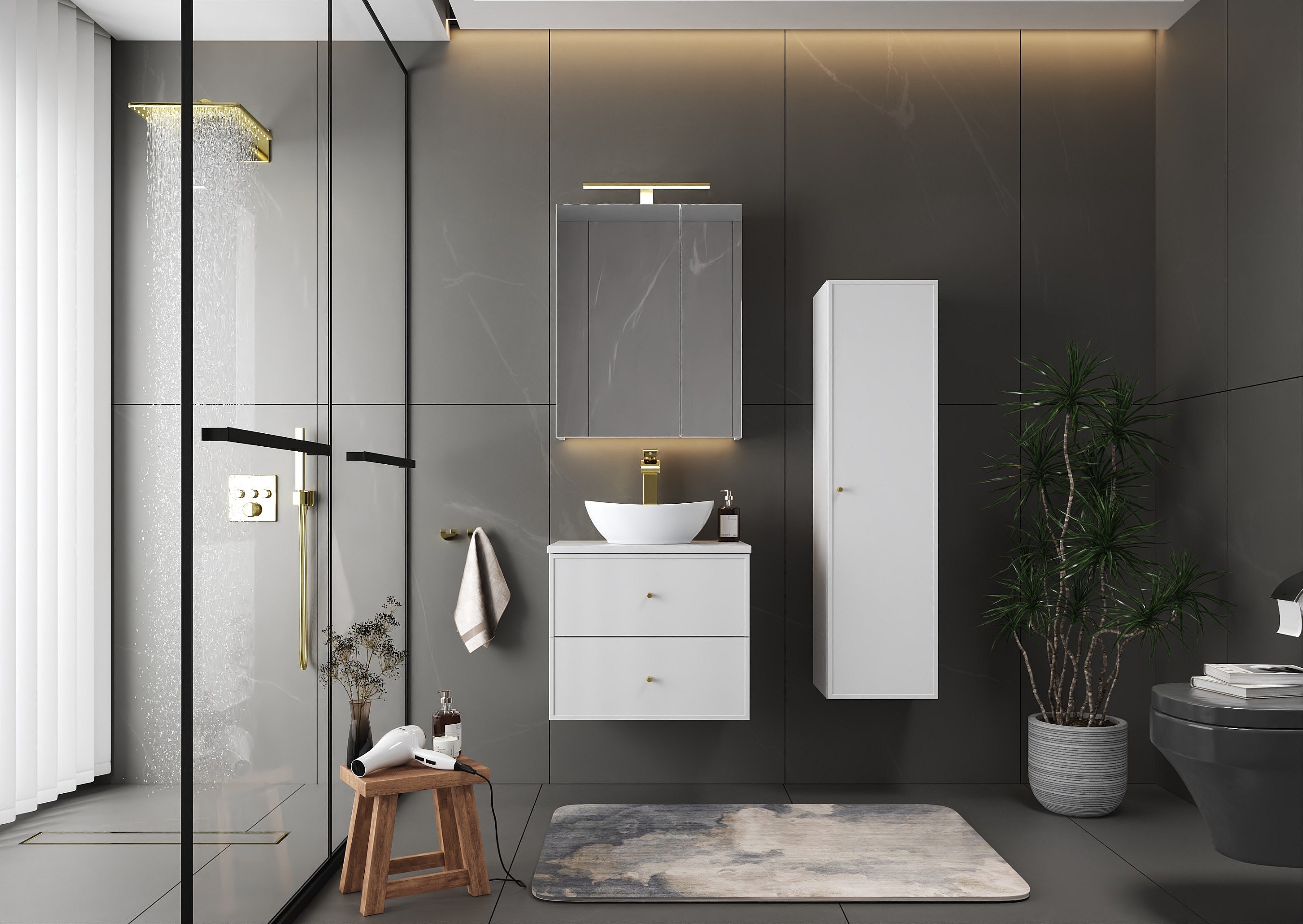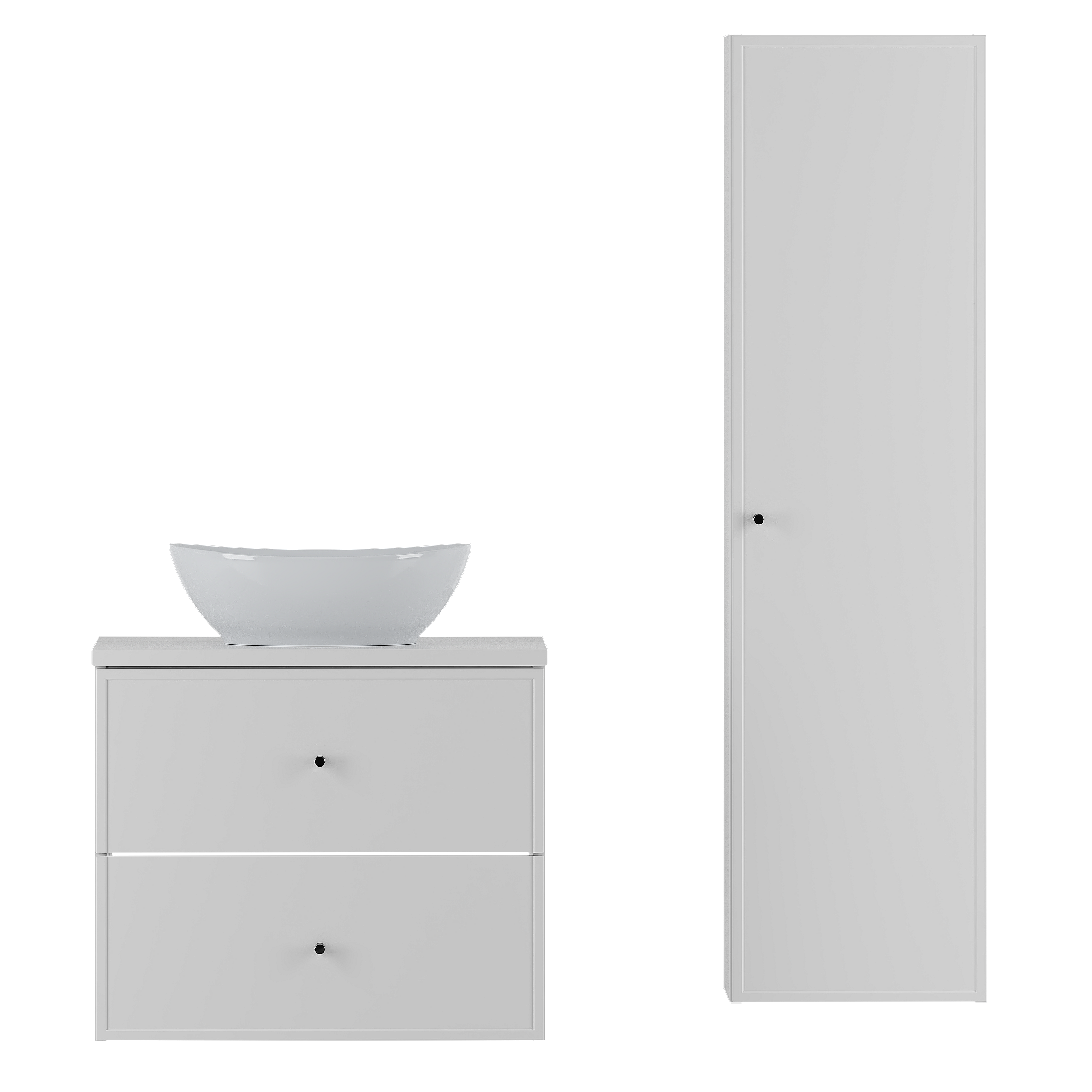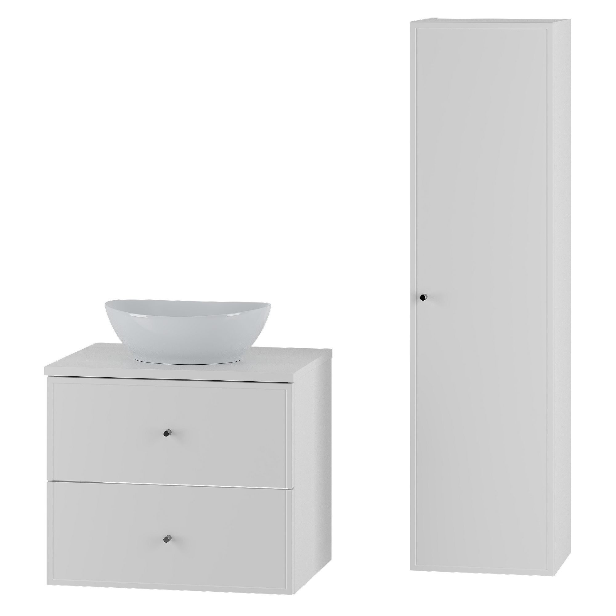 Weißes Badezimmer-Set 60 cm Schrank mit Arbeitsplatte und Waschbecken und Hochschrank Marco