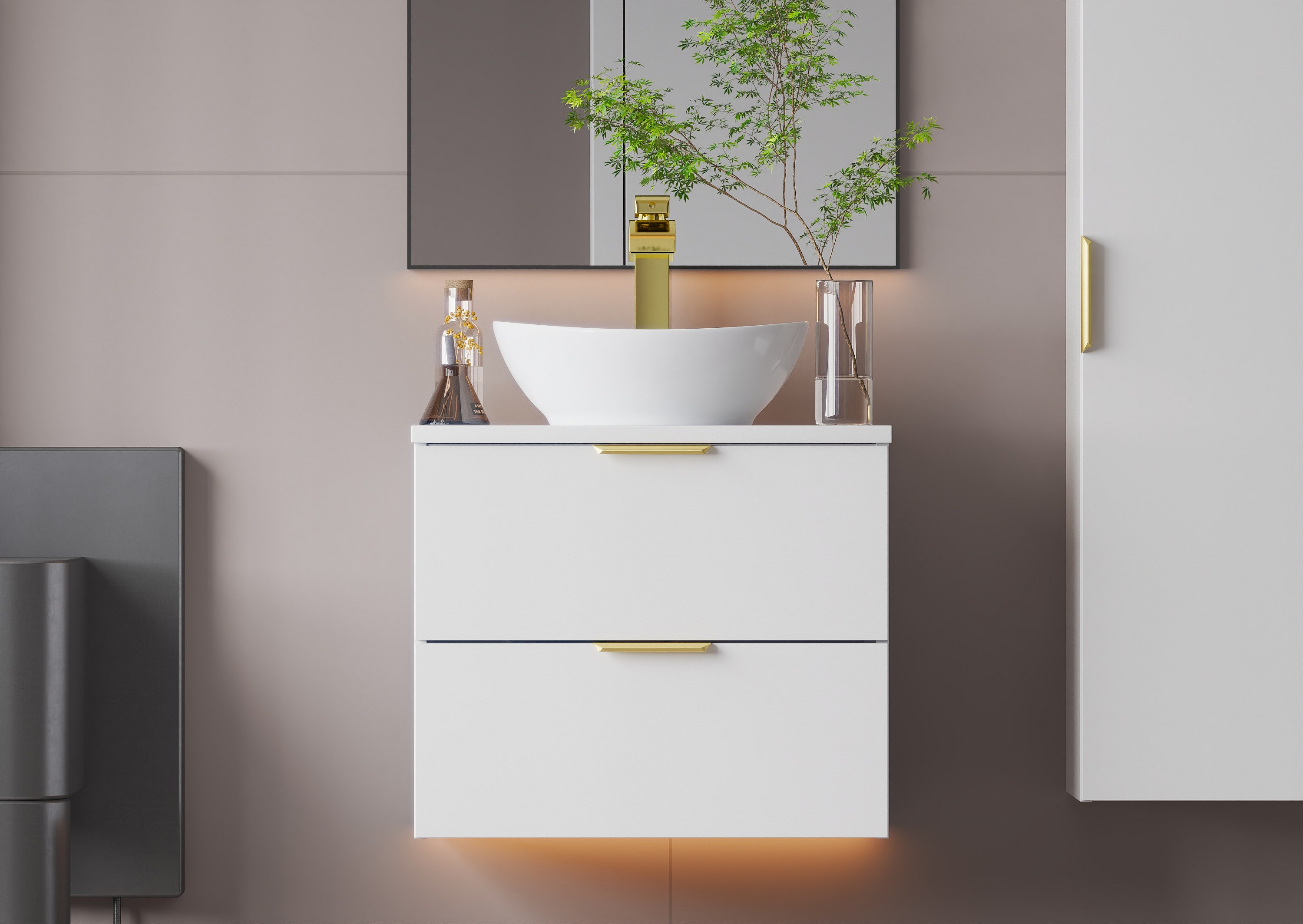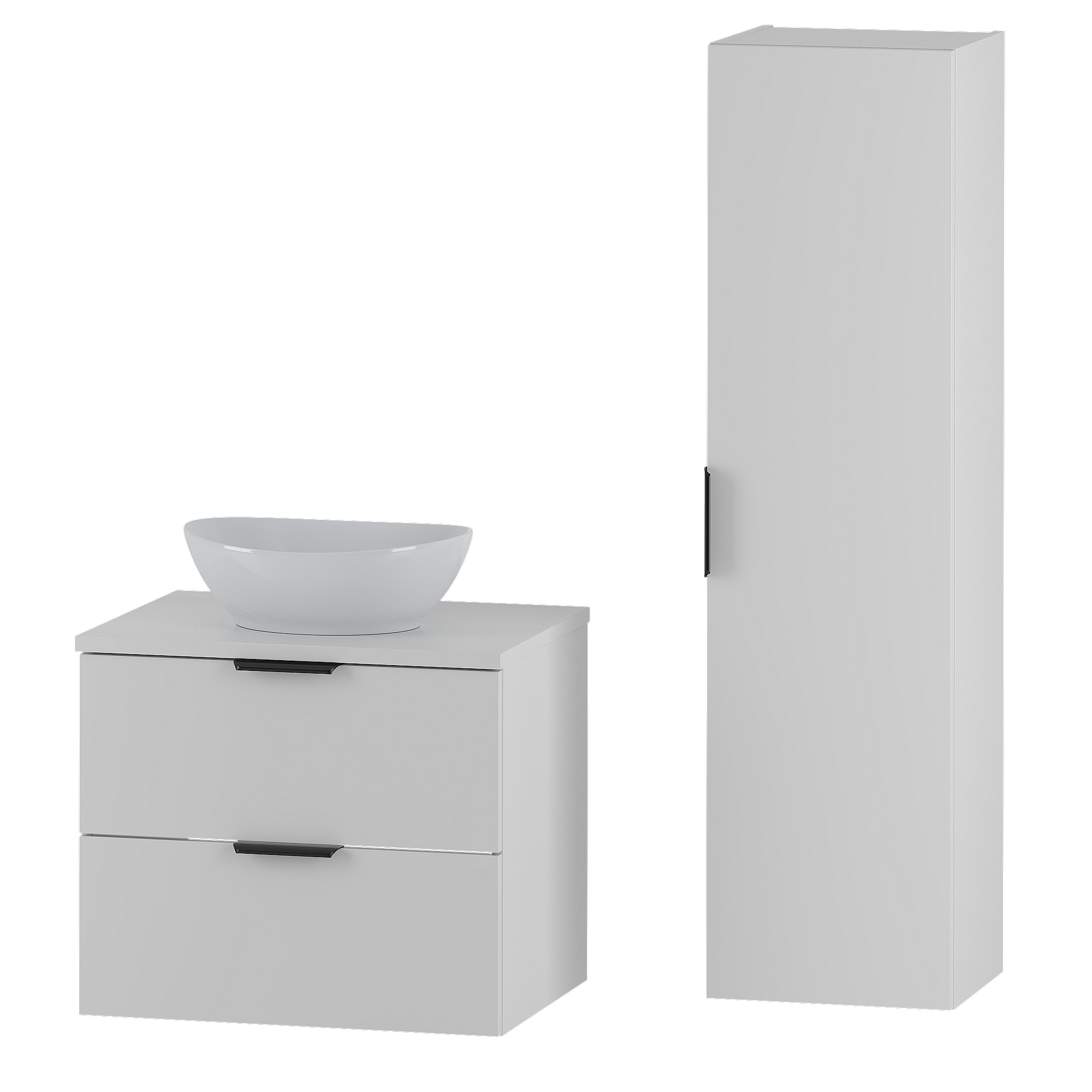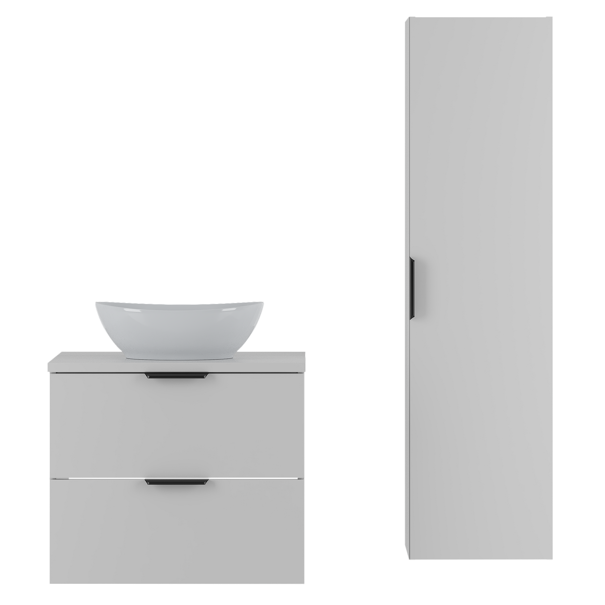 Weißes Badezimmer-Set 60 cm Schrank mit Arbeitsplatte und Waschbecken und Hochschrank Pile