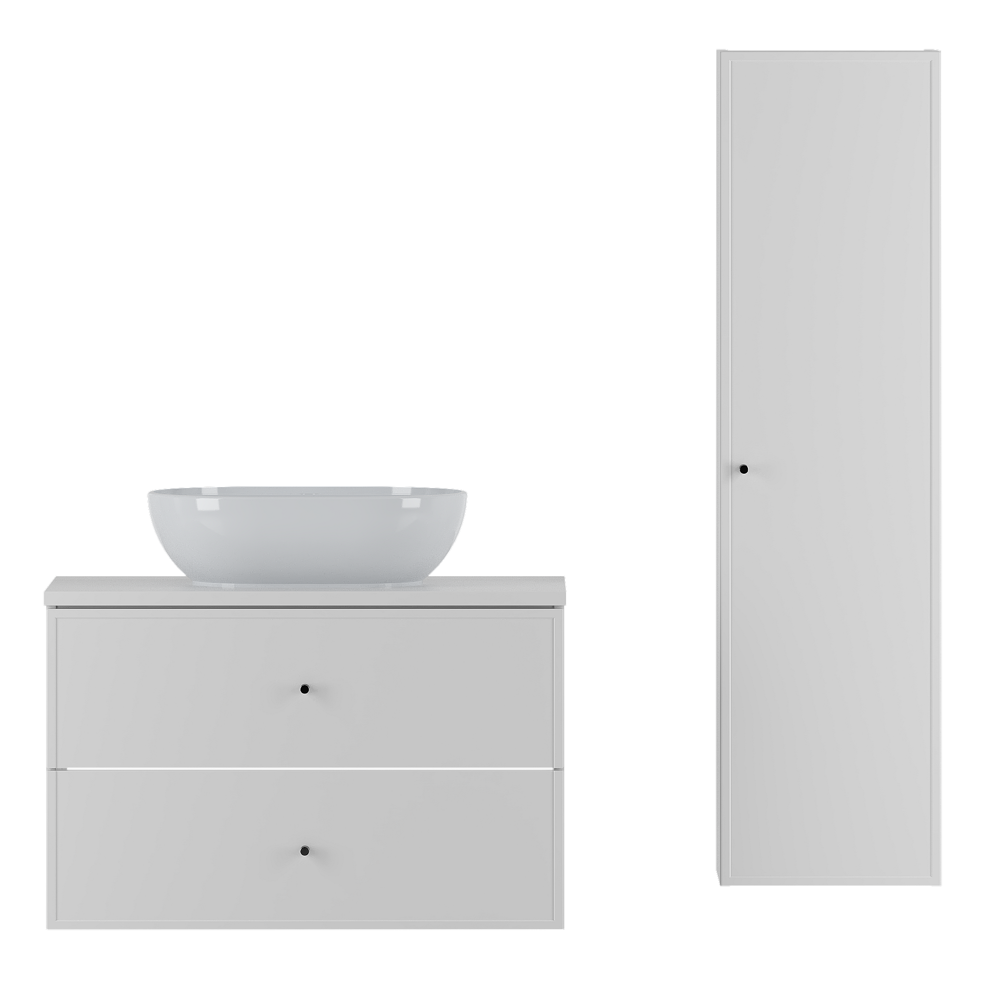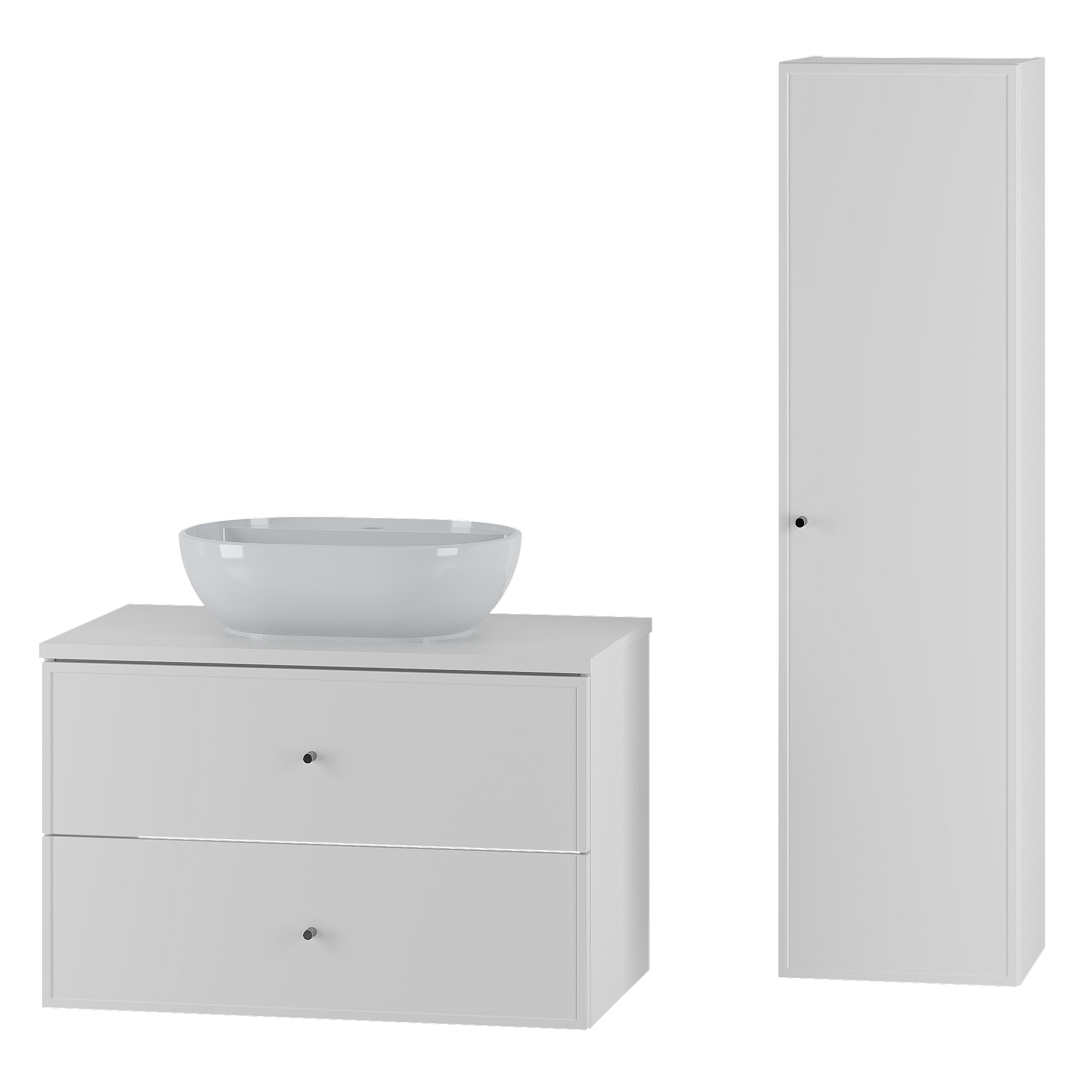 Weißes Badezimmer-Set 80 cm Schrank mit Arbeitsplatte und Waschbecken und Hochschrank Marco