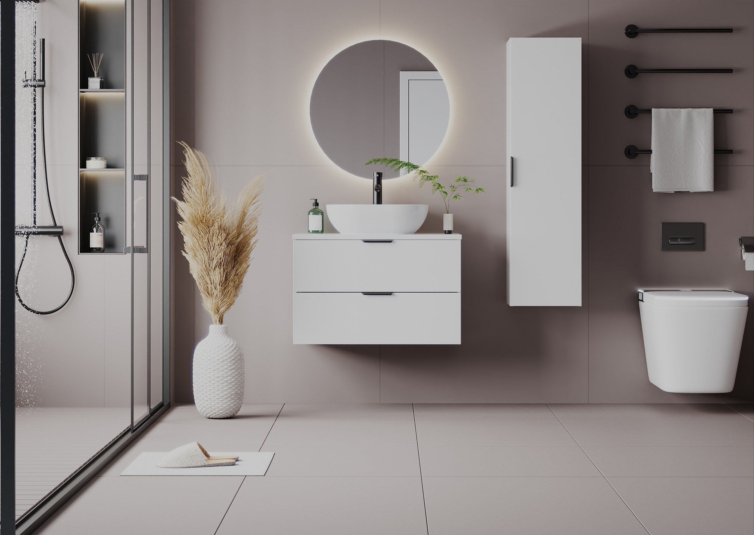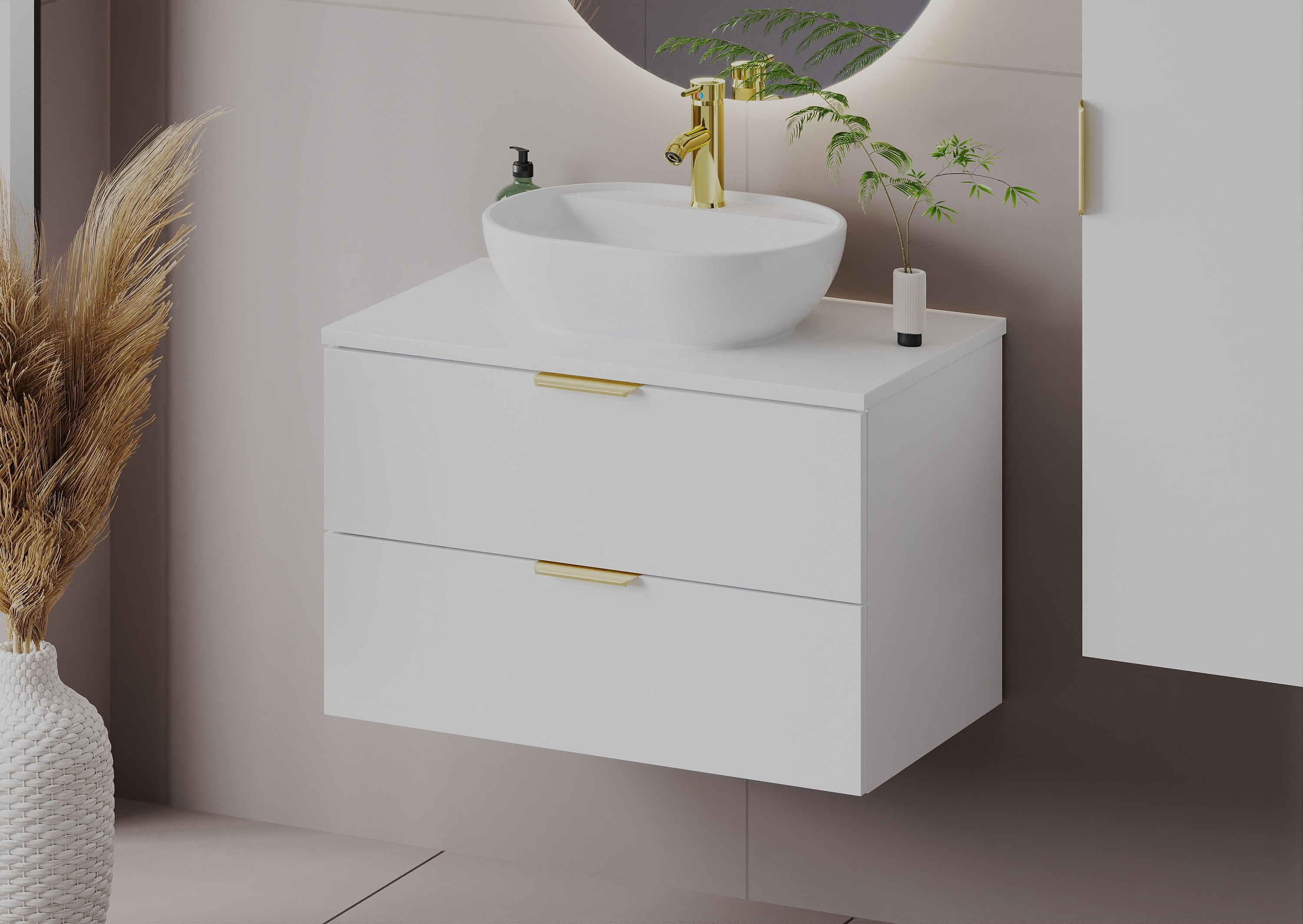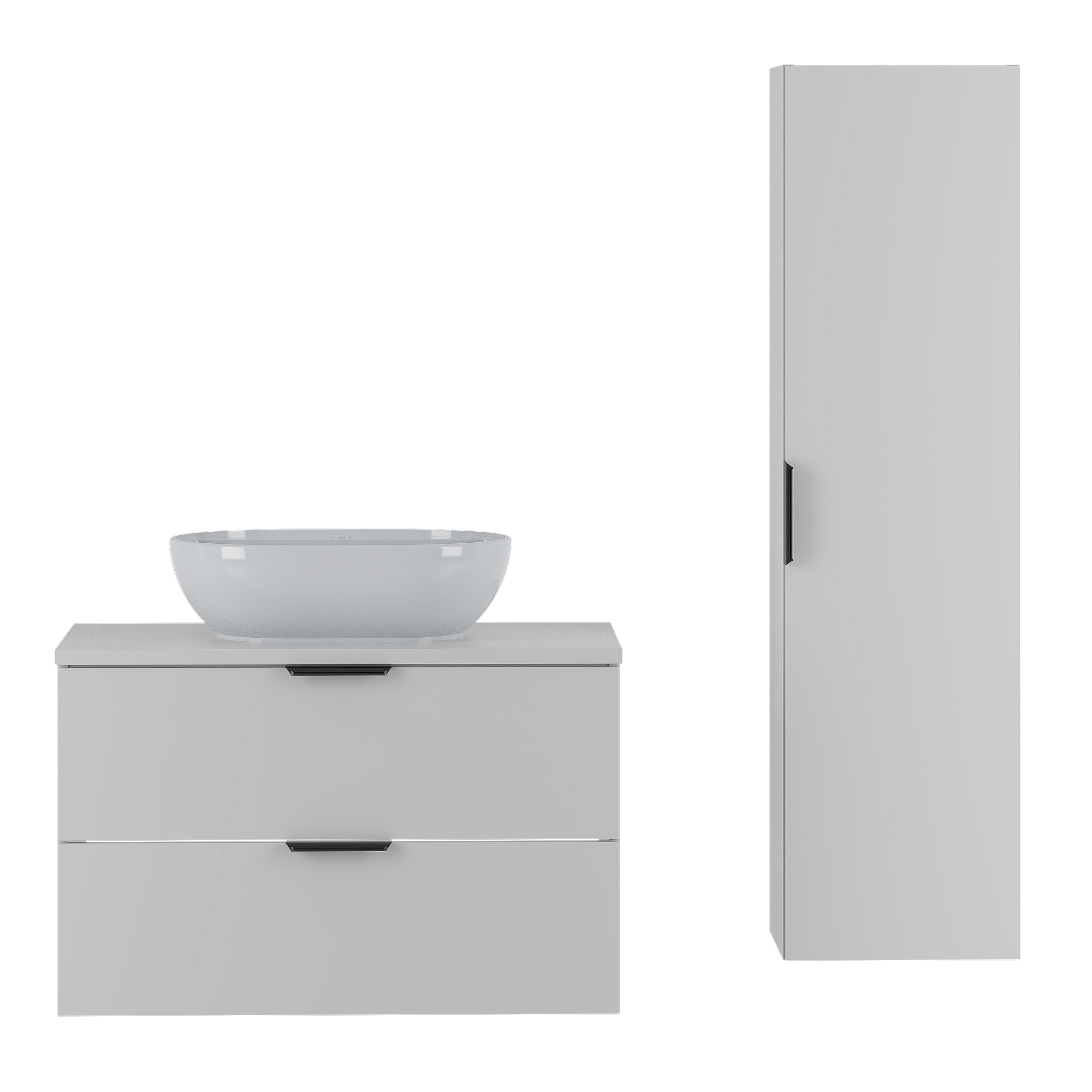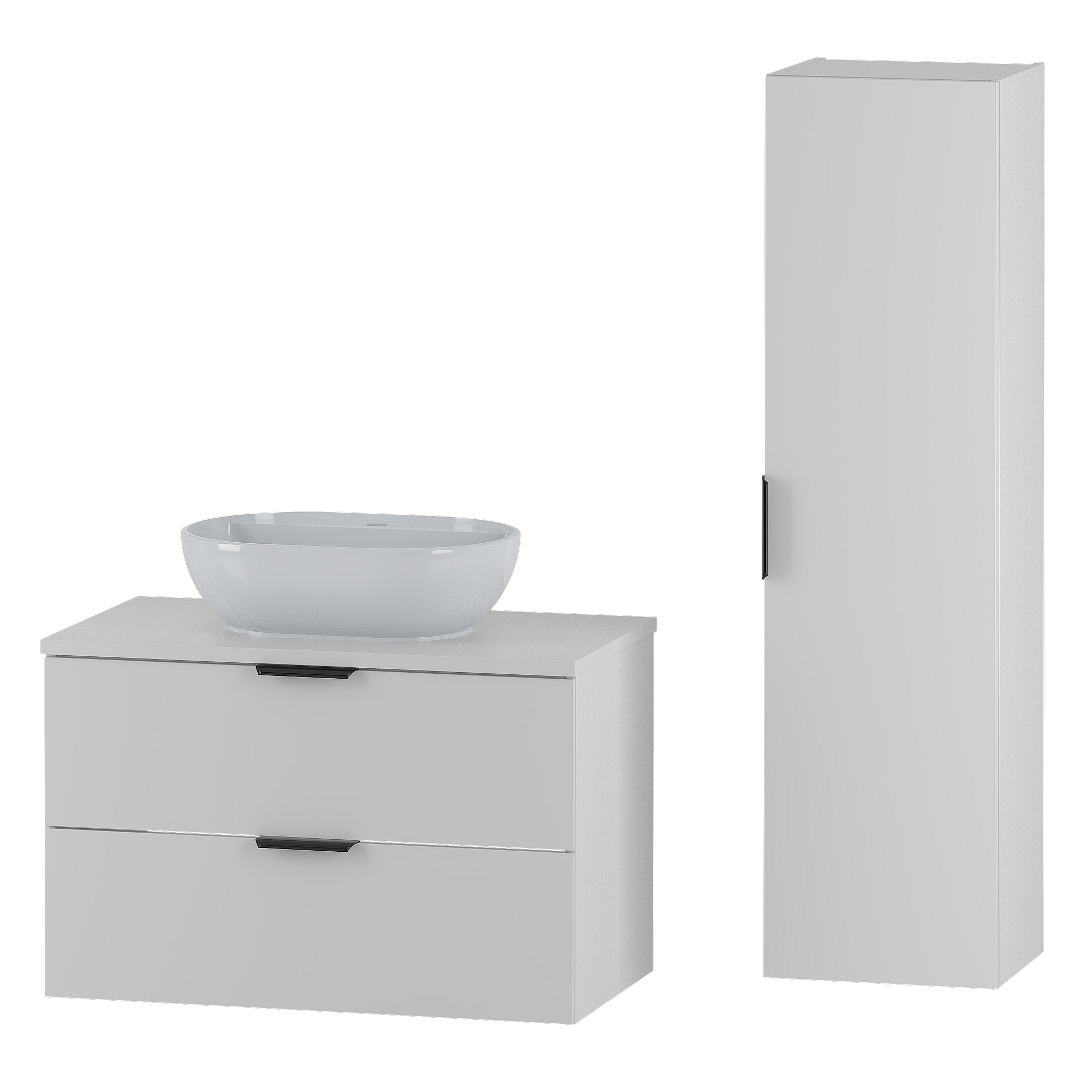 Weißes Badezimmer-Set 80 cm Schrank mit Arbeitsplatte und Waschbecken und Hochschrank Pile