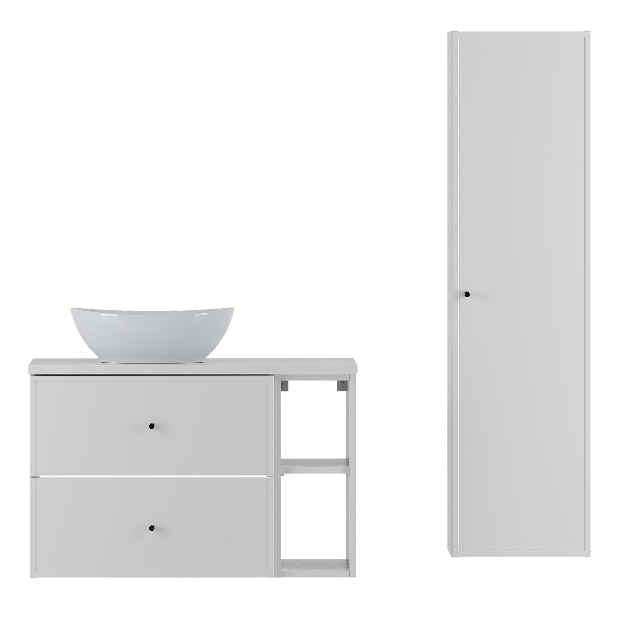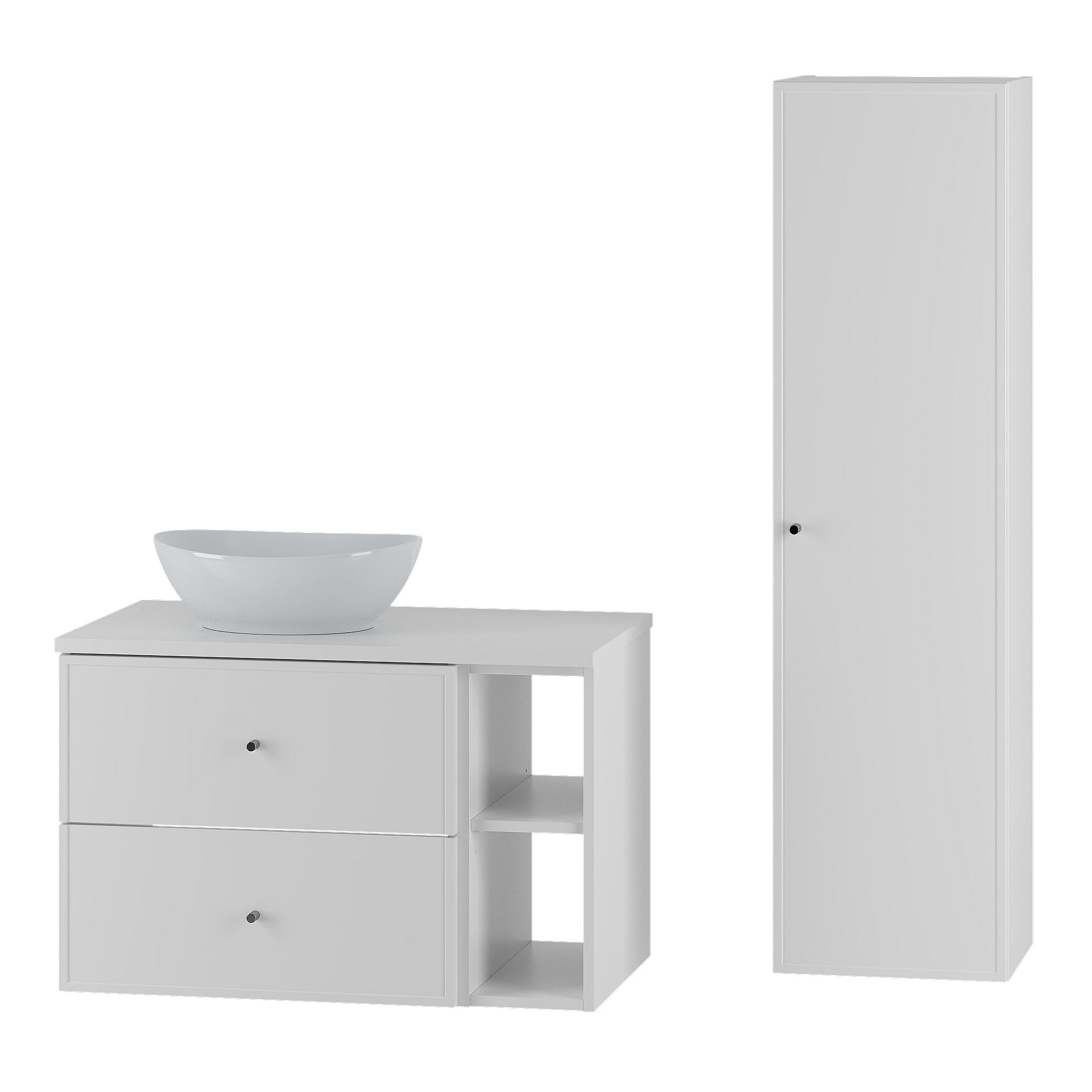 Weißes Badezimmer-Set 80 cm Schrank mit Arbeitsplatte Waschbecken und Regal und Hochschrank Marco