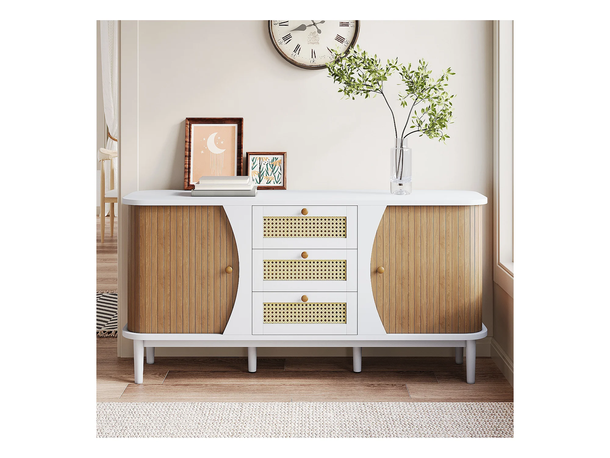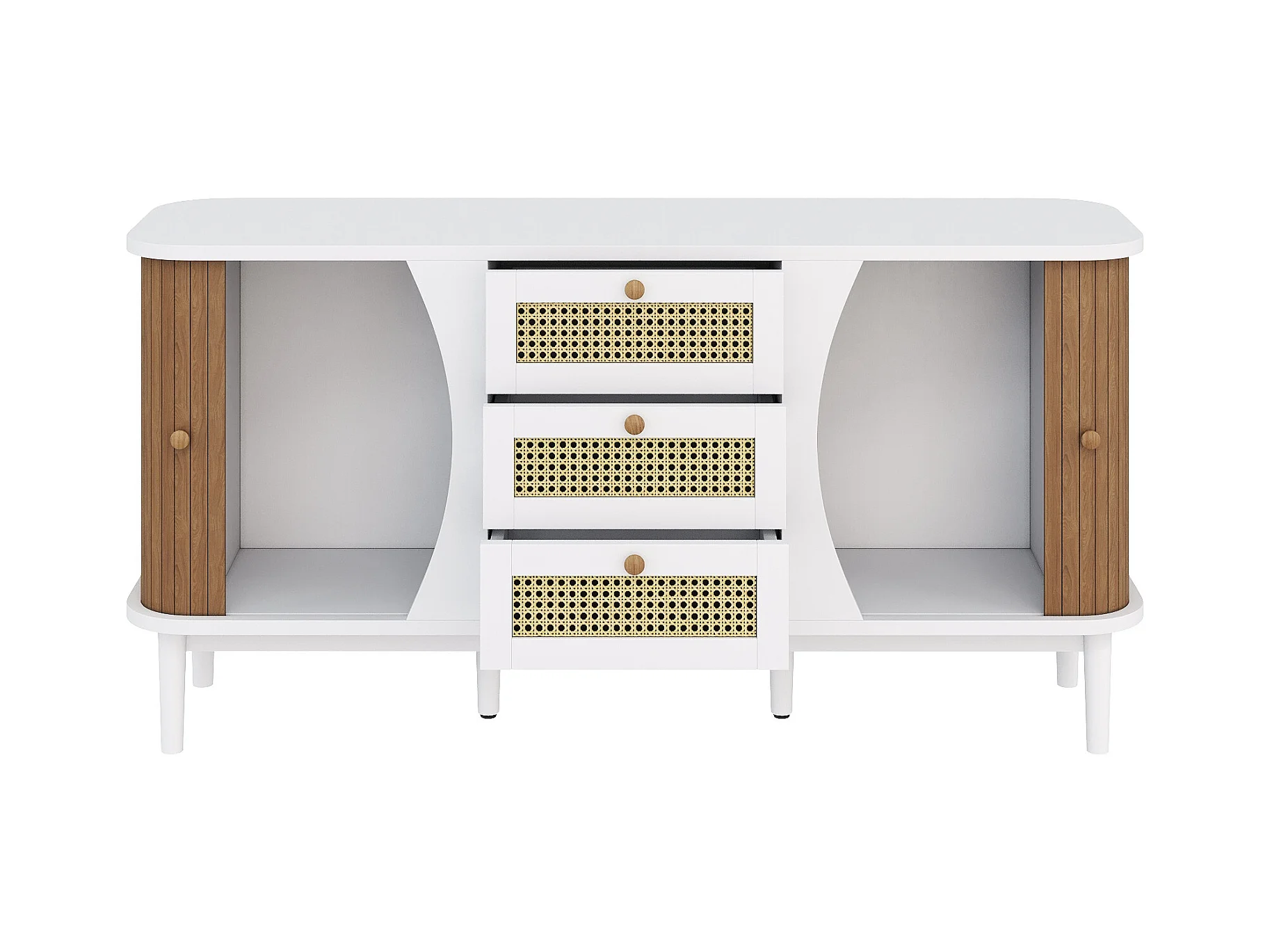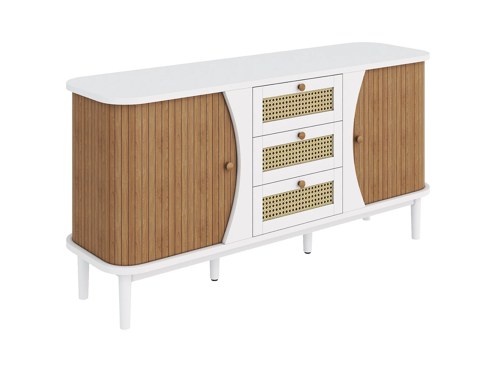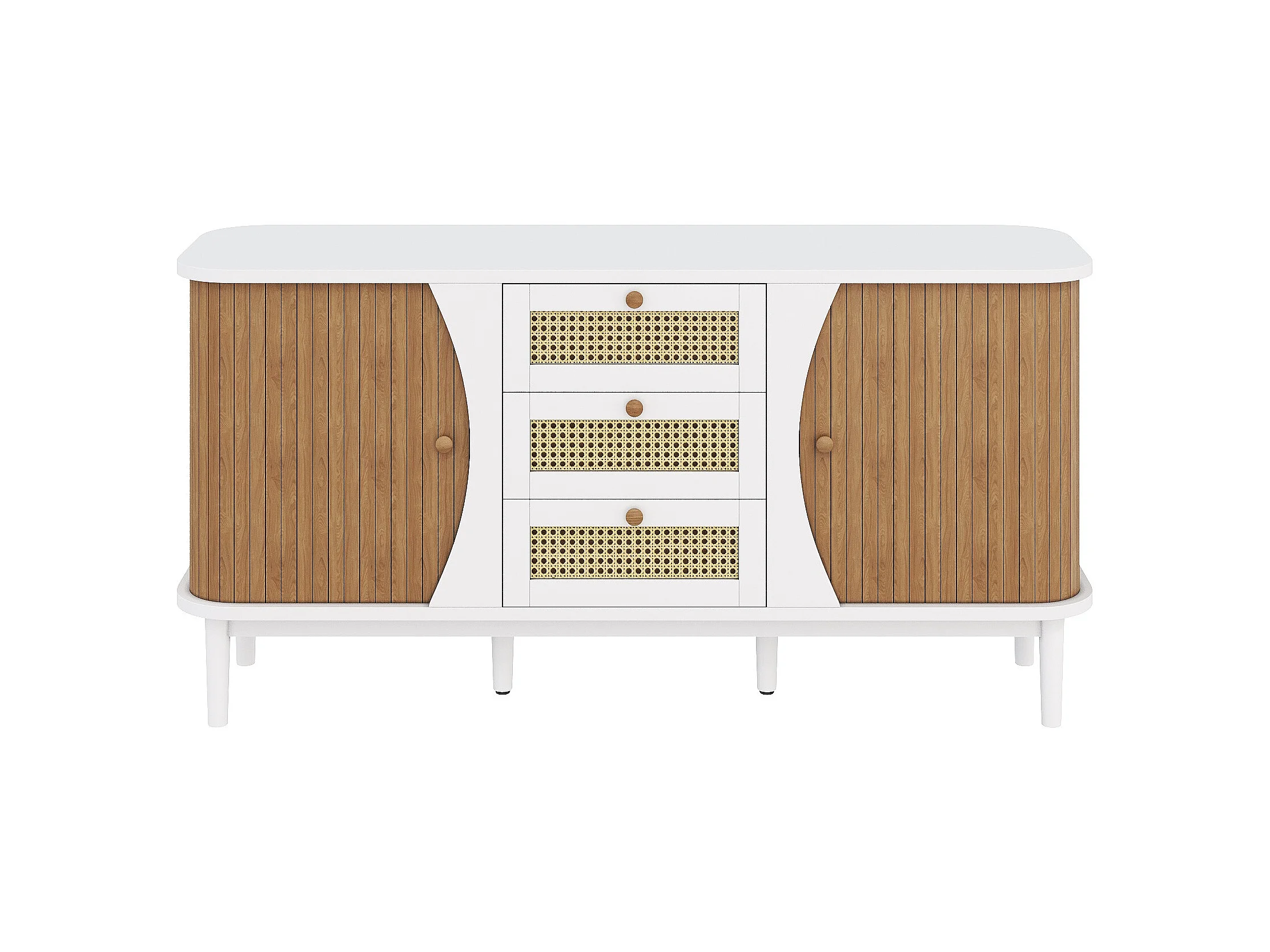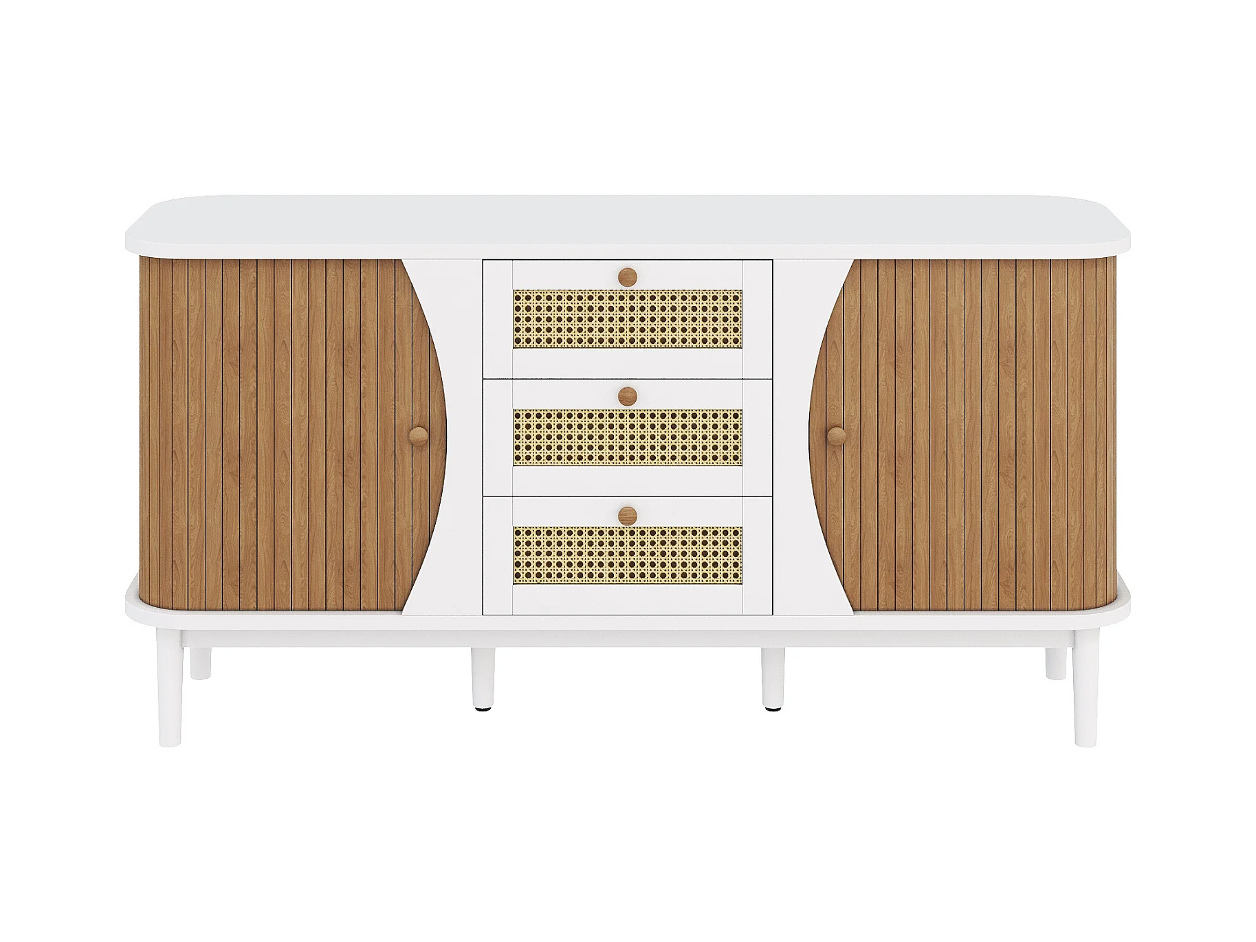 Weißes und naturbelassenes Sideboard mit 2 Türen, 3 Rattanschubladen und verstellbaren Einlegeböden – für Wohn- und Esszimmer