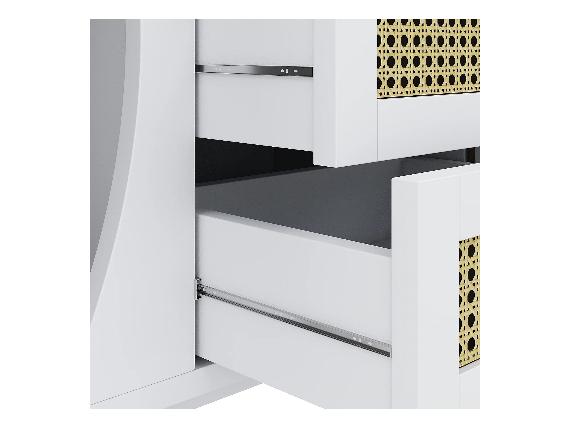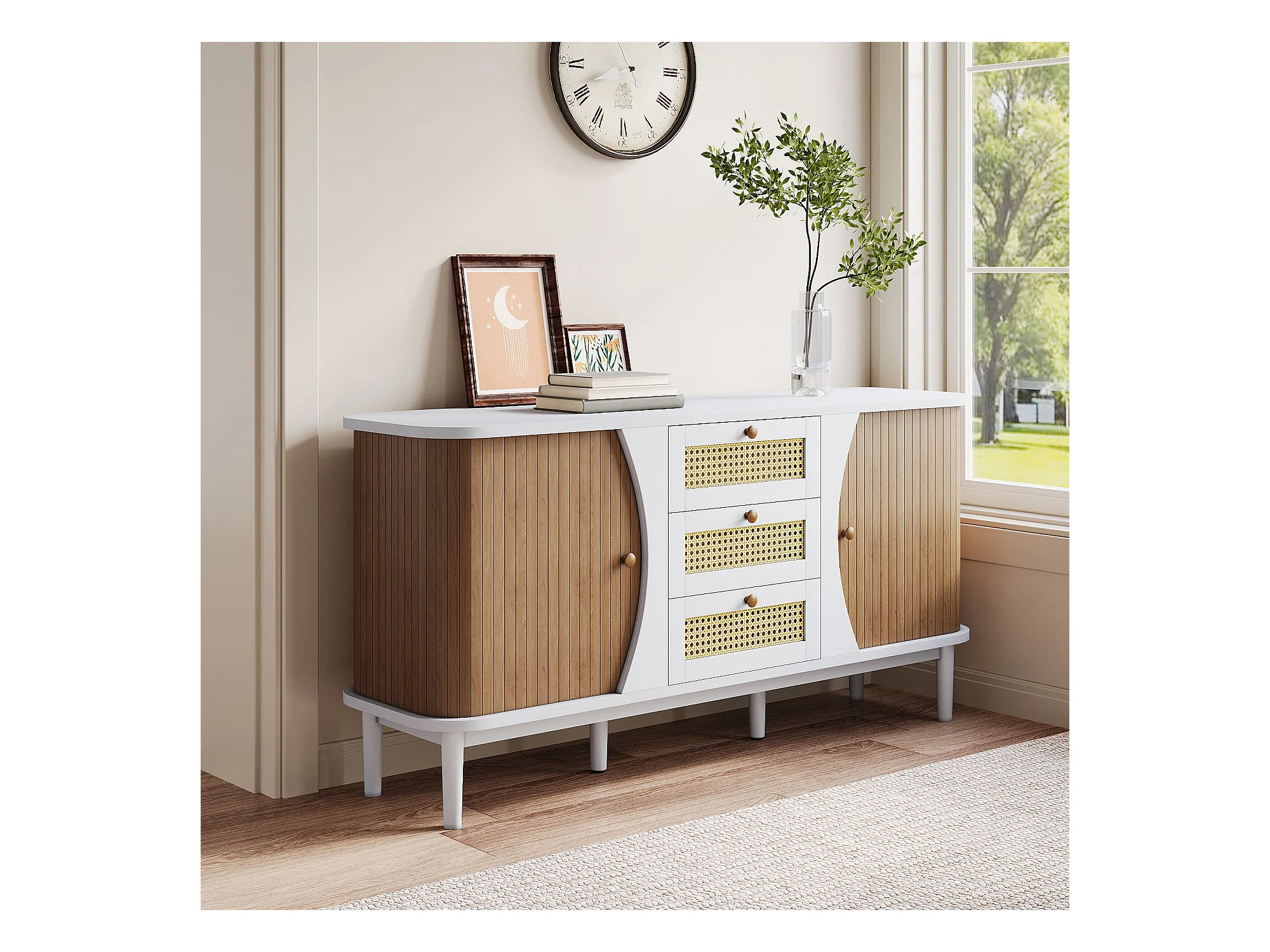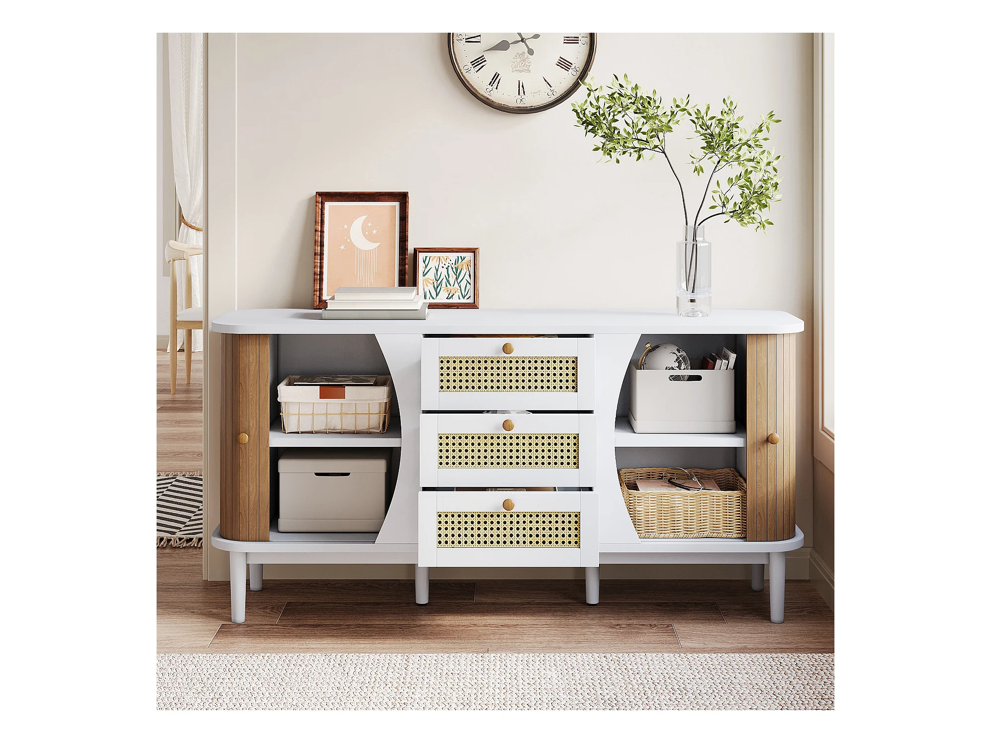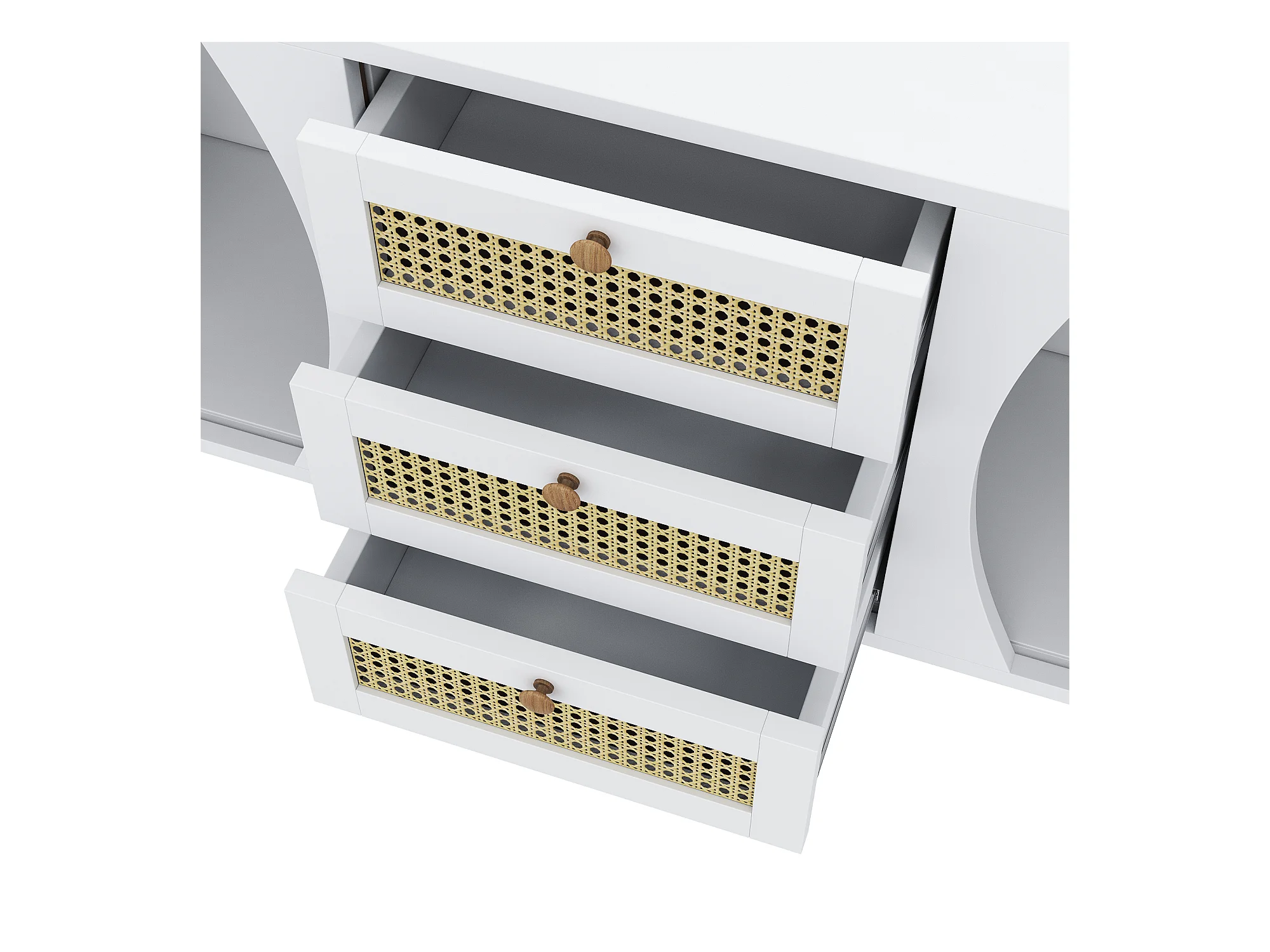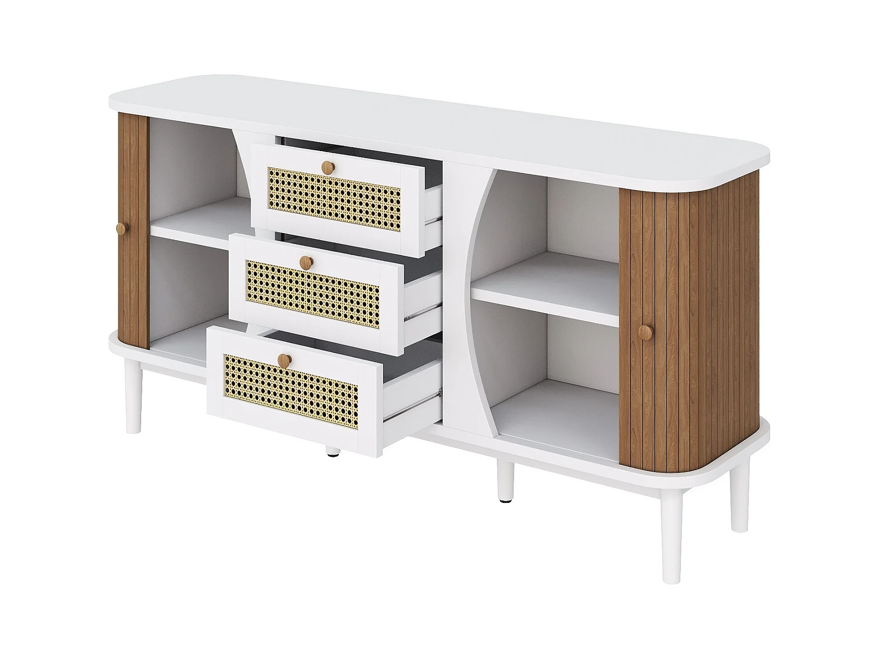 Weißes und naturbelassenes Sideboard mit 2 Türen, 3 Rattanschubladen und verstellbaren Einlegeböden – für Wohn- und Esszimmer