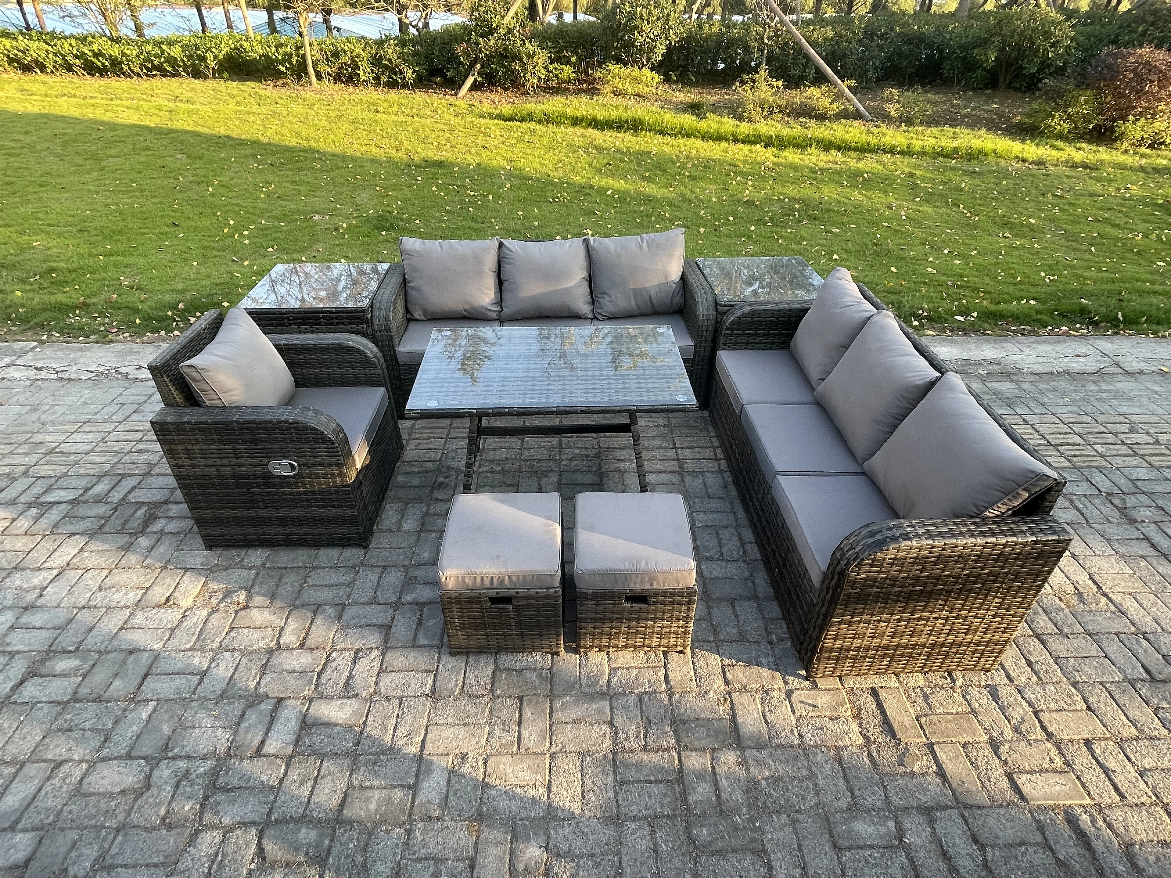 Wicker 8 Stücke Polyrattan Gartenmöbel set mit Rechteckiger Esstisch Sessel 2 kleine Fußhockern 2 Beistelltischen Dunkelgrau Gemischt