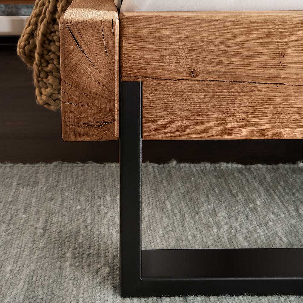 Wildeiche Balkenbett im Industry und Loft Stil Metall Bügelgestell