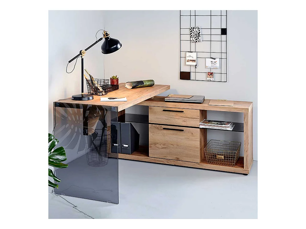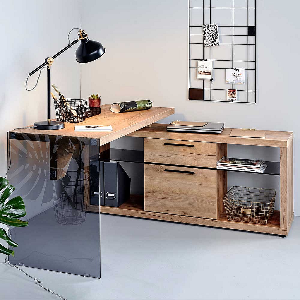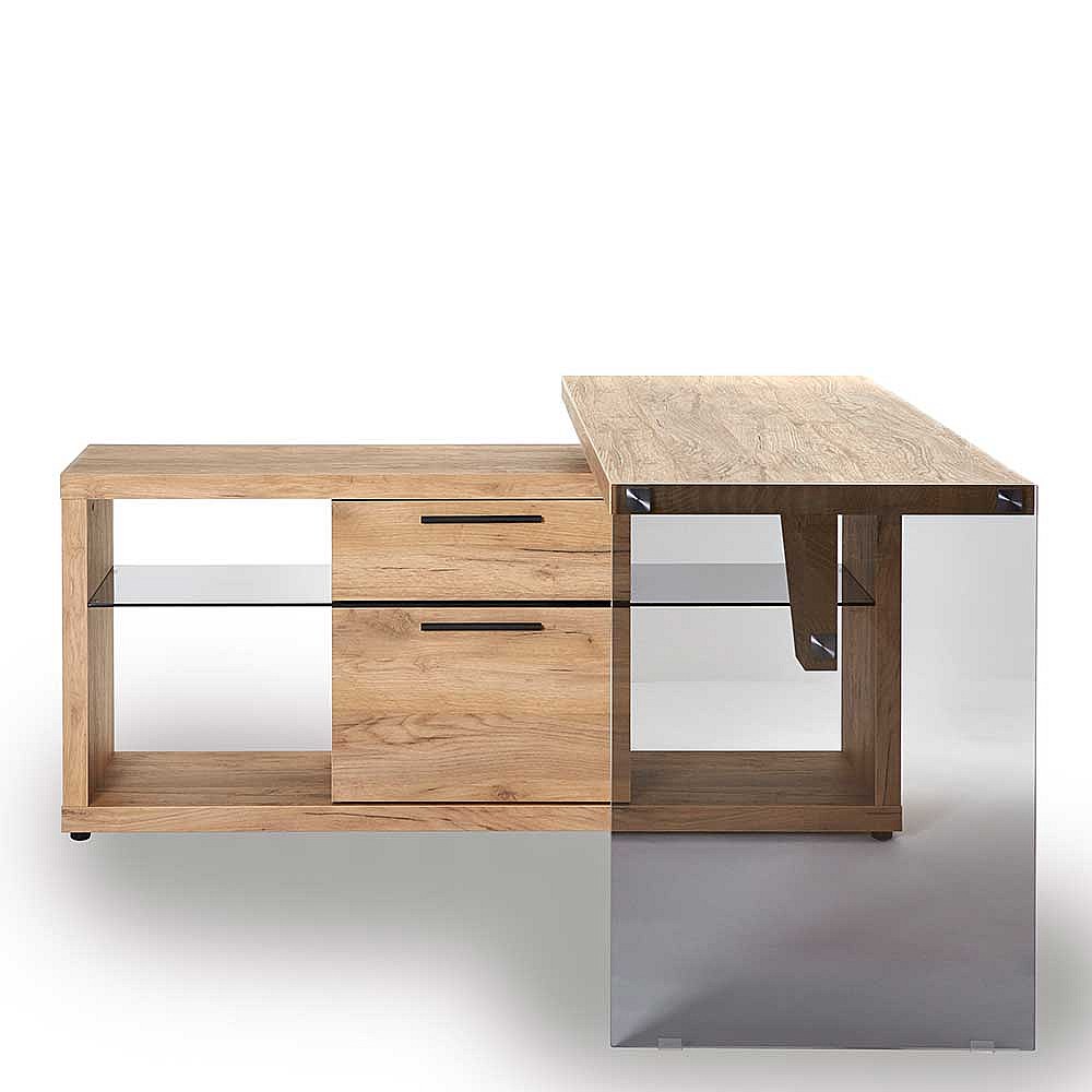 Winkelschreibtisch in Eichefarben Sicherheitsglas