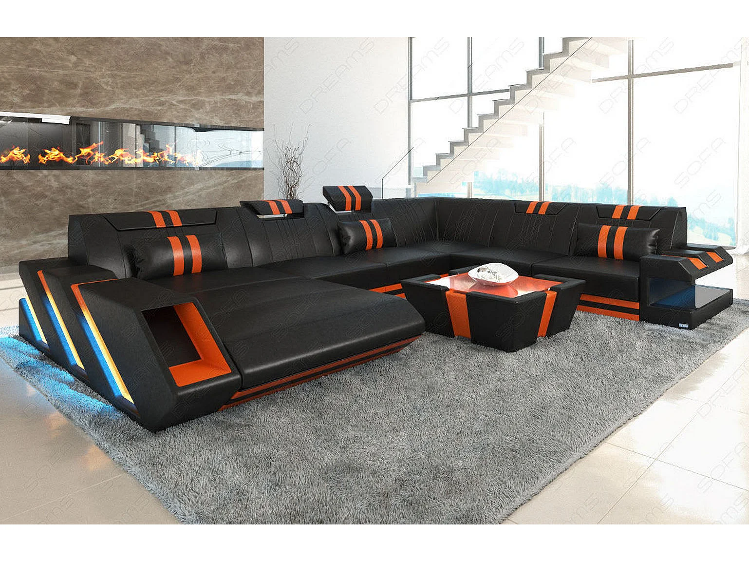 XXL Leder Wohnlandschaft Apollonia EM Schwarz Orange Links