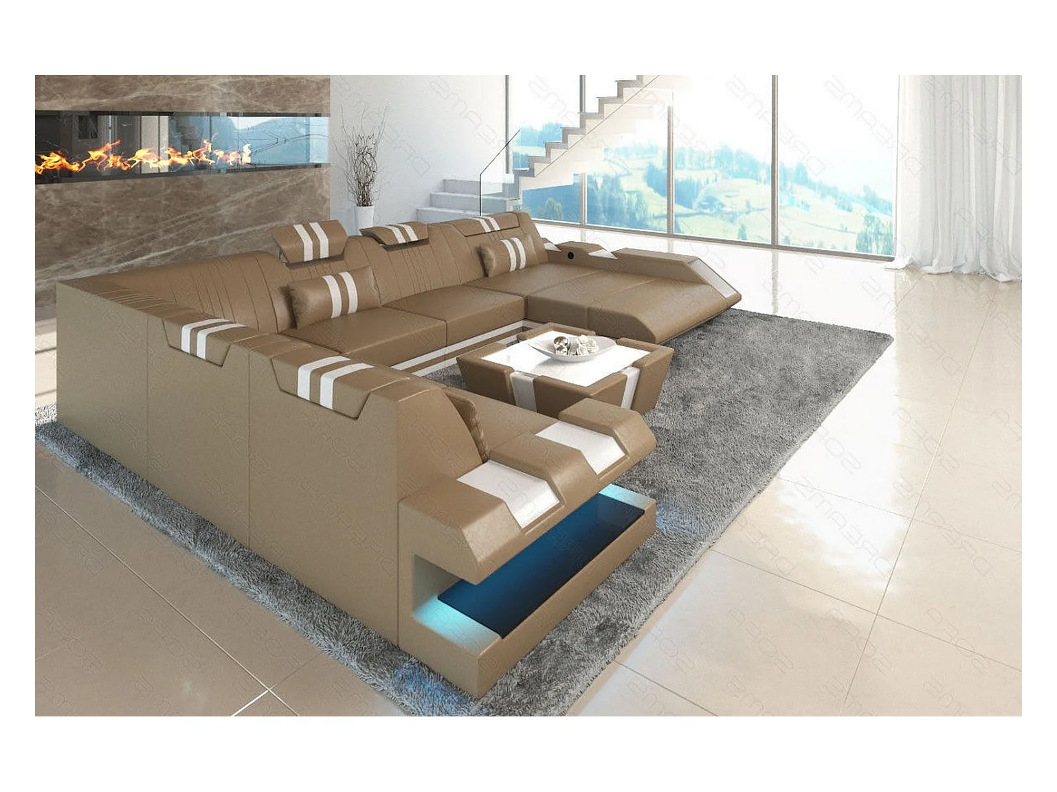 XXL Leder Wohnlandschaft Apollonia KP Sandbeige Weiß Rechts