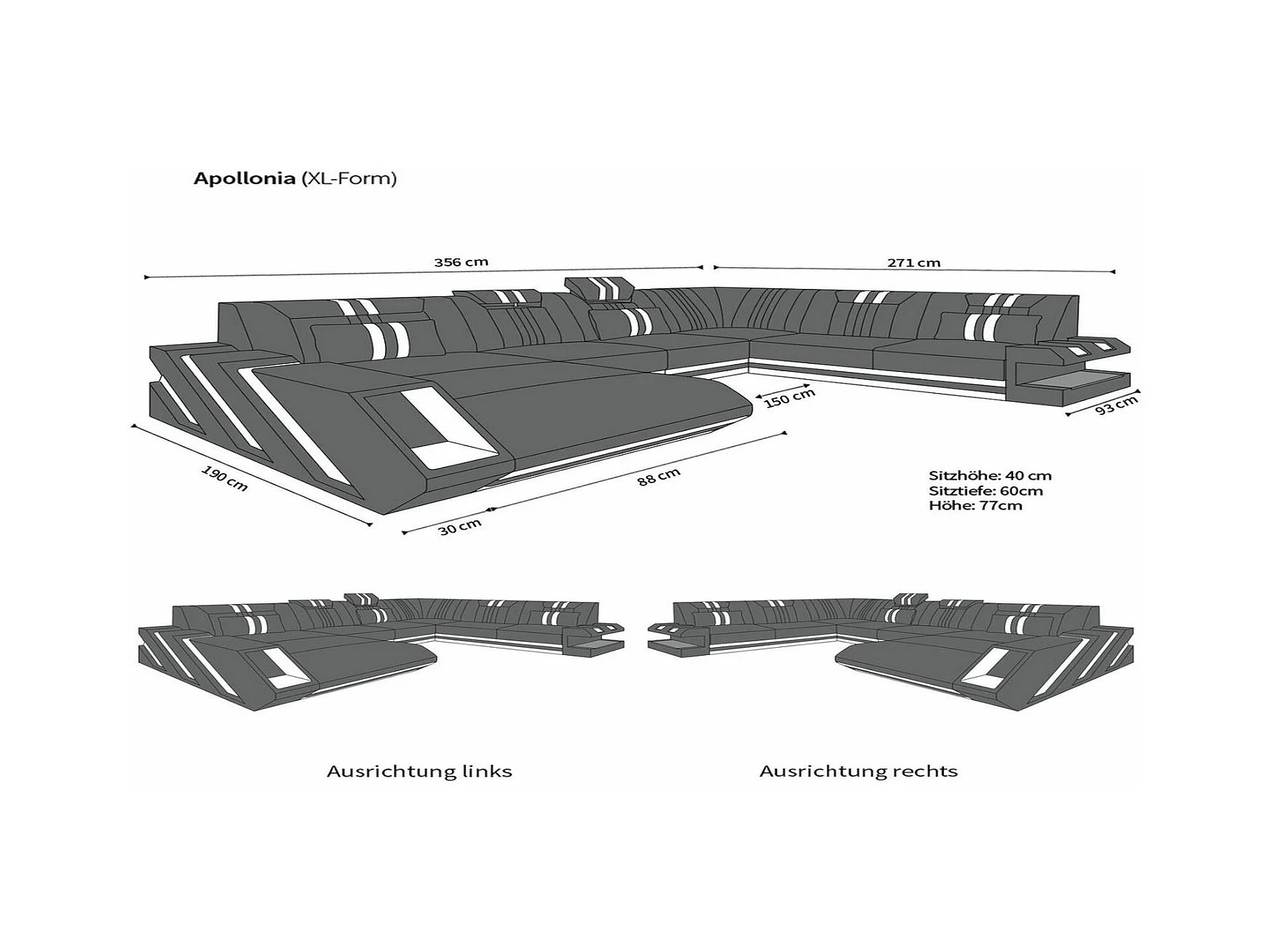 XXL Leder Wohnlandschaft Apollonia KP Weiß Schwarz Links