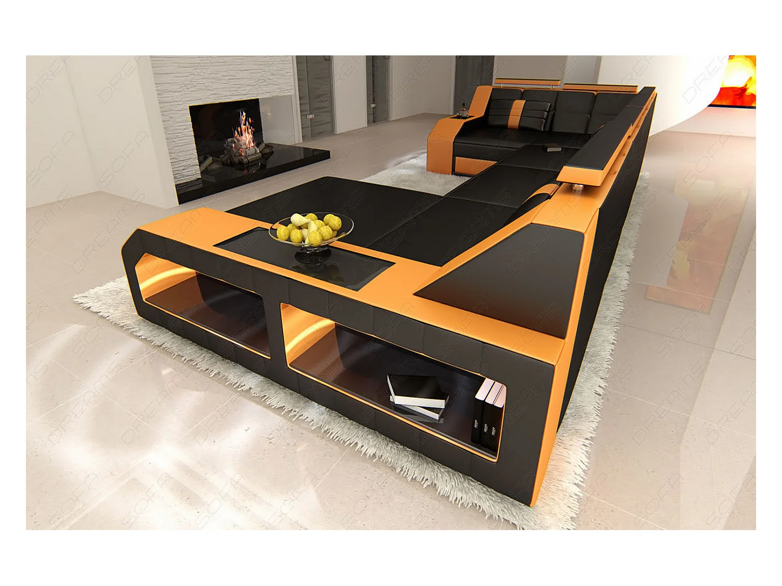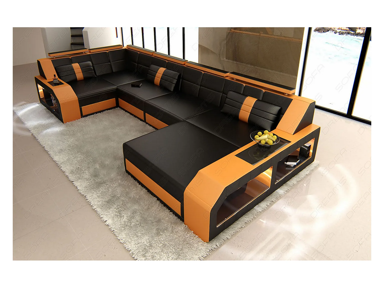 Sofa Arezzo U Leder Kunstleder Schwarz Orange Rechts