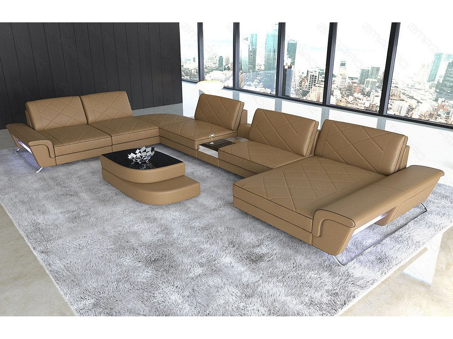Sofa Bari U XXL Leder Kunstleder Sandbeige Braun Rechts