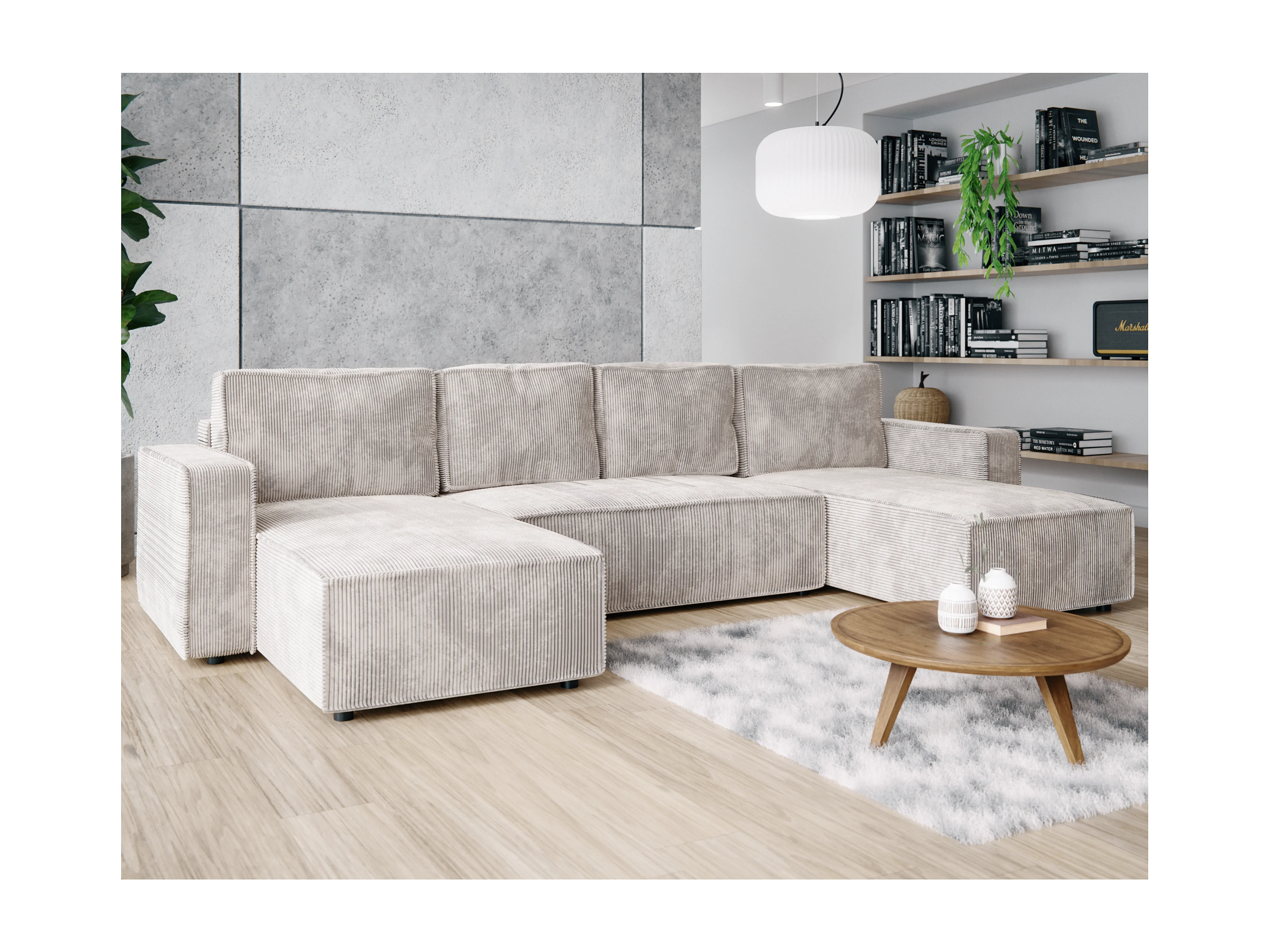 Wohnlandschaft U-Form BRIK XL Cord Poso 100 Cremeweiß mit Schlaffunktion DL und Bettkasten 338x169 cm