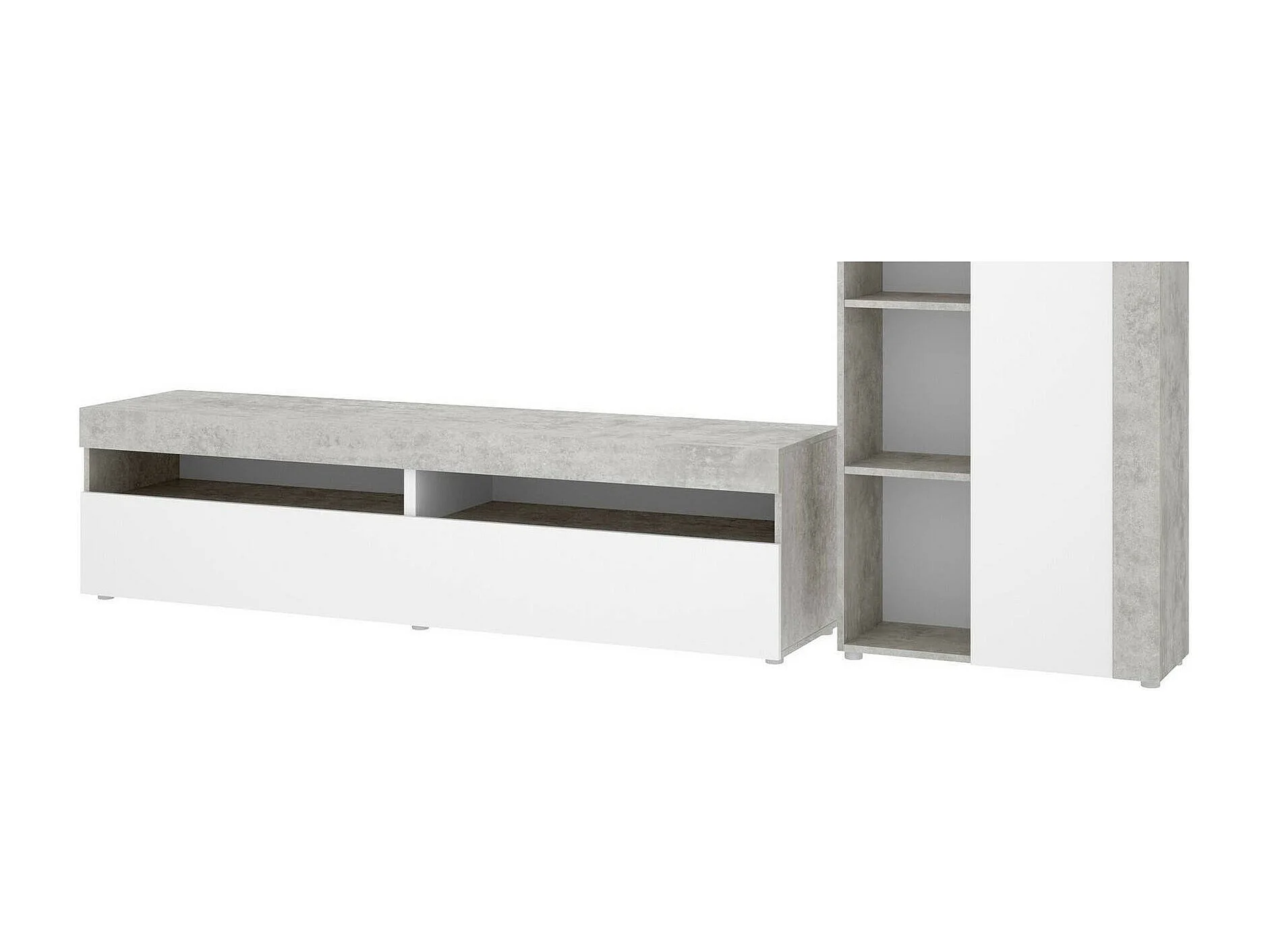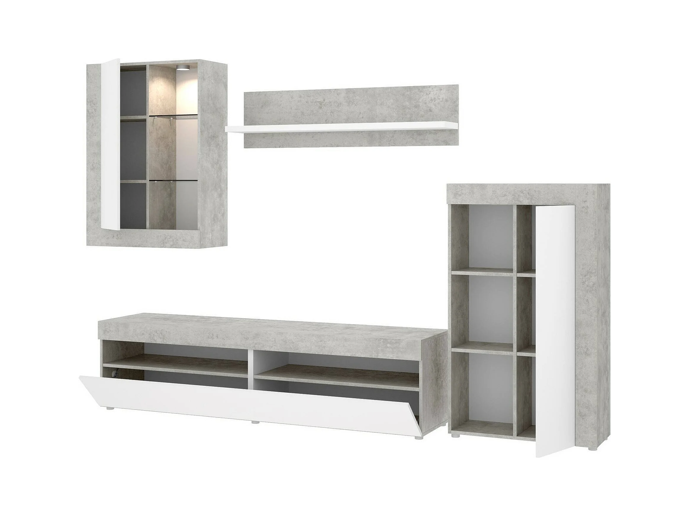 Wohnwand Dament, Modulares Wohnzimmerset, Multipositions-Wohnzimmermöbel, 265x42h180 cm, Weiß und Zement