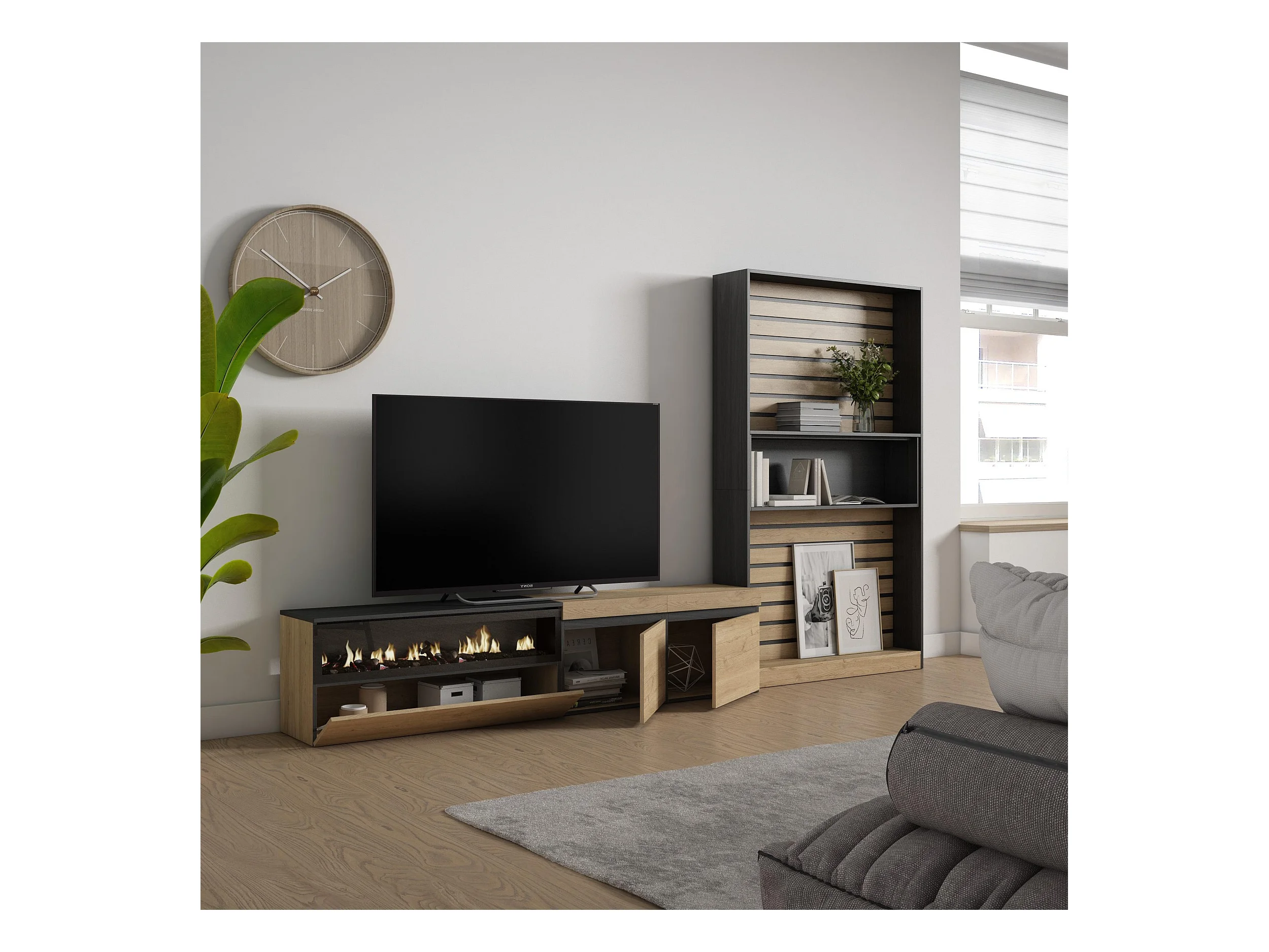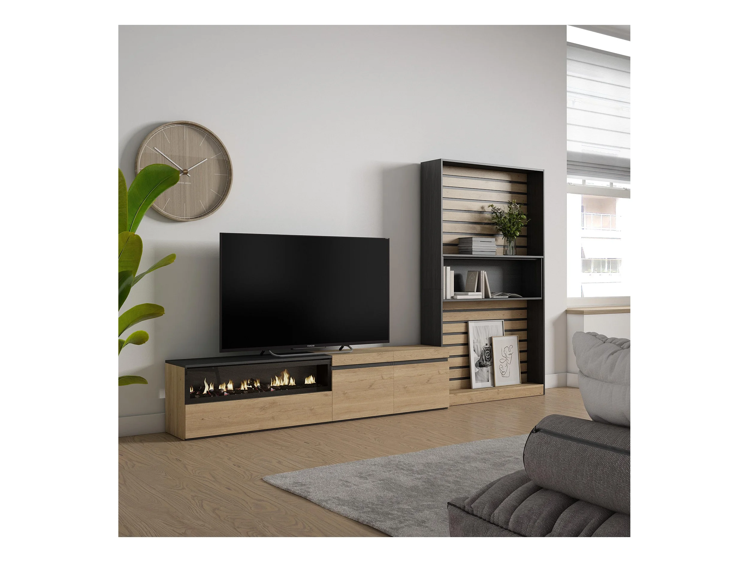 Wohnwand Wohnzimmer, 310x35x186cm, Für TV-Geräte bis zu 80", Elektrokamin. , Eiche Schwarz
