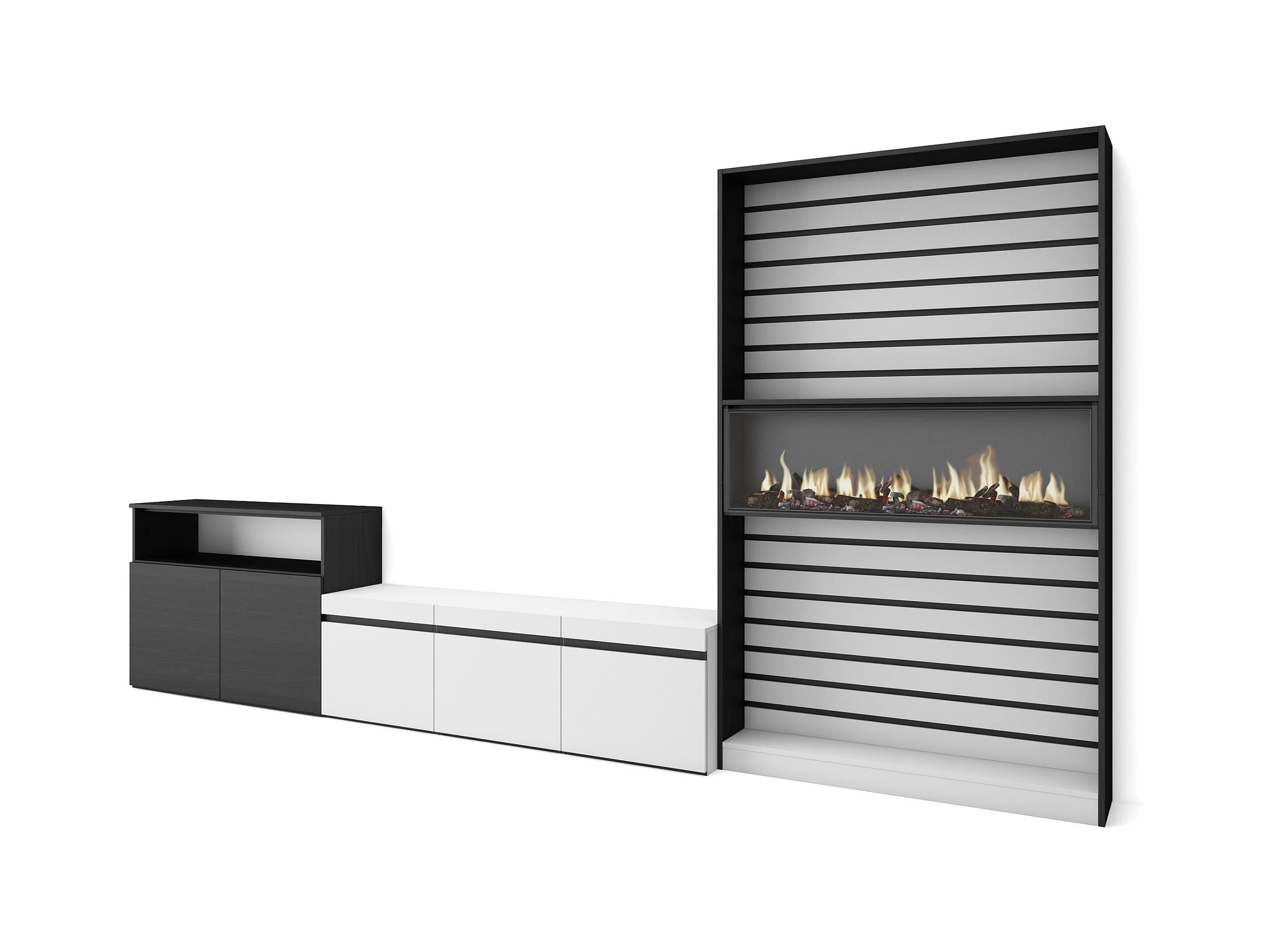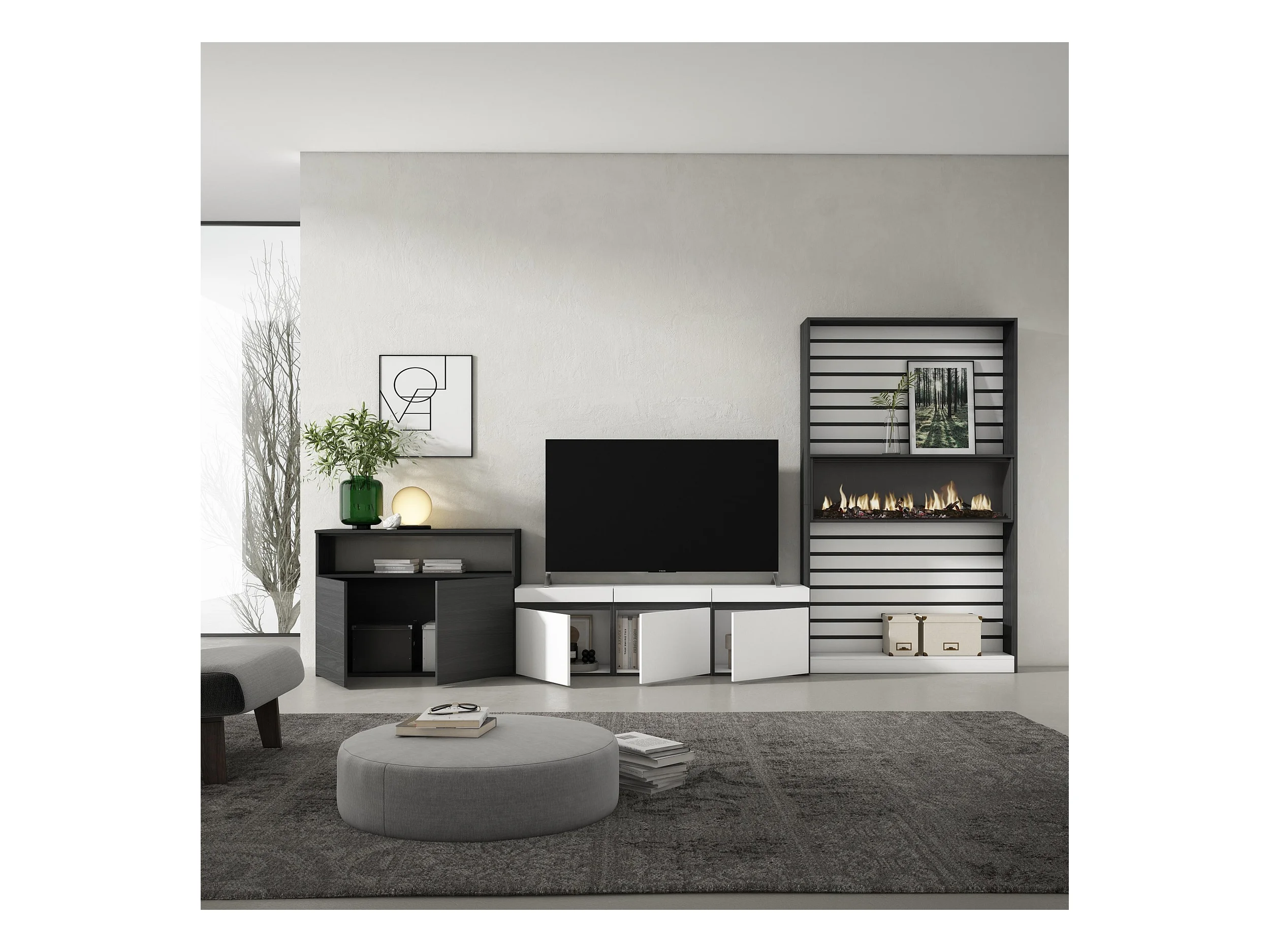 Wohnwand Wohnzimmer, 360x35x186cm, Für TV-Geräte bis zu 65", Elektrokamin, Weiß und Schwarz