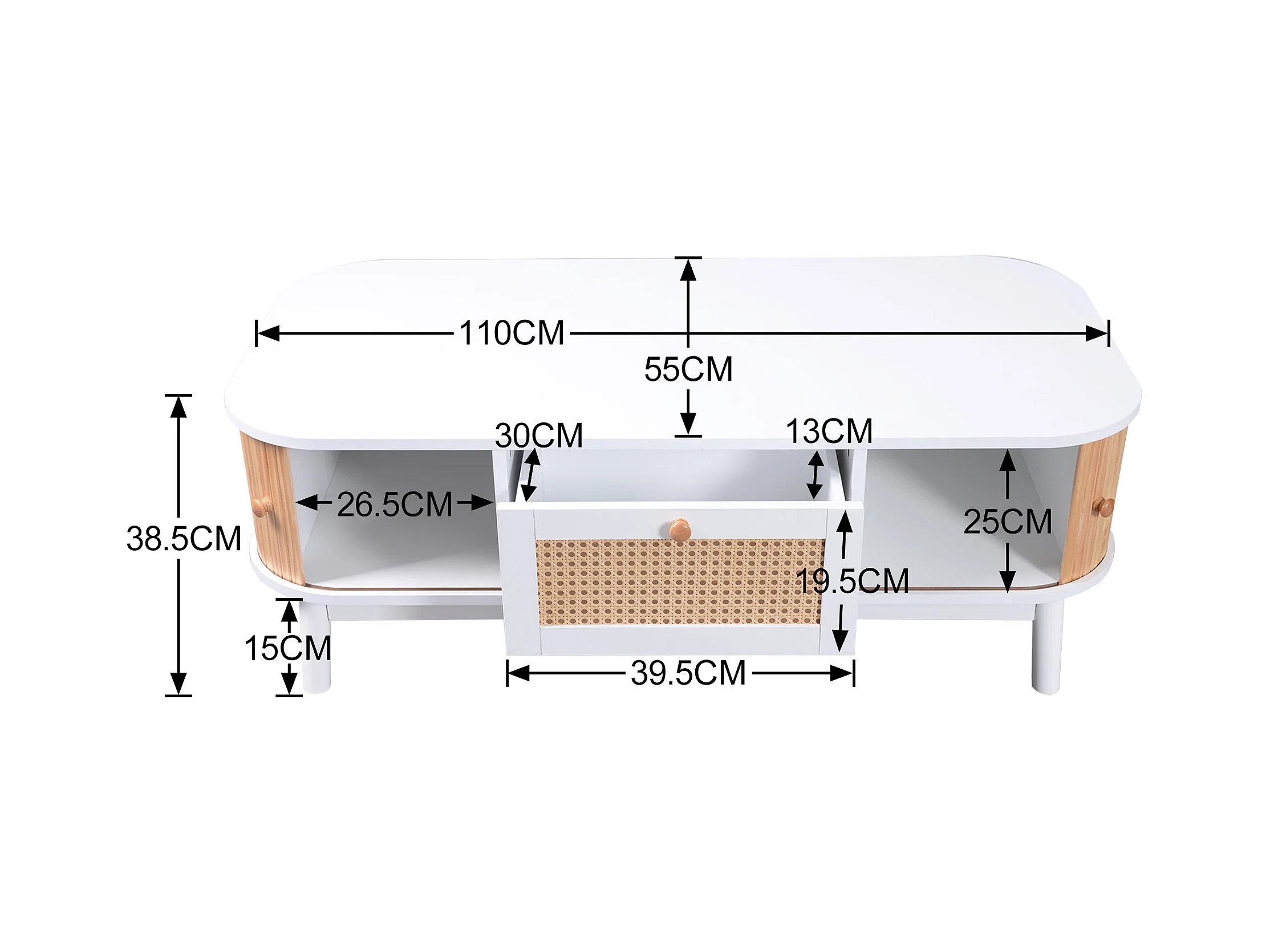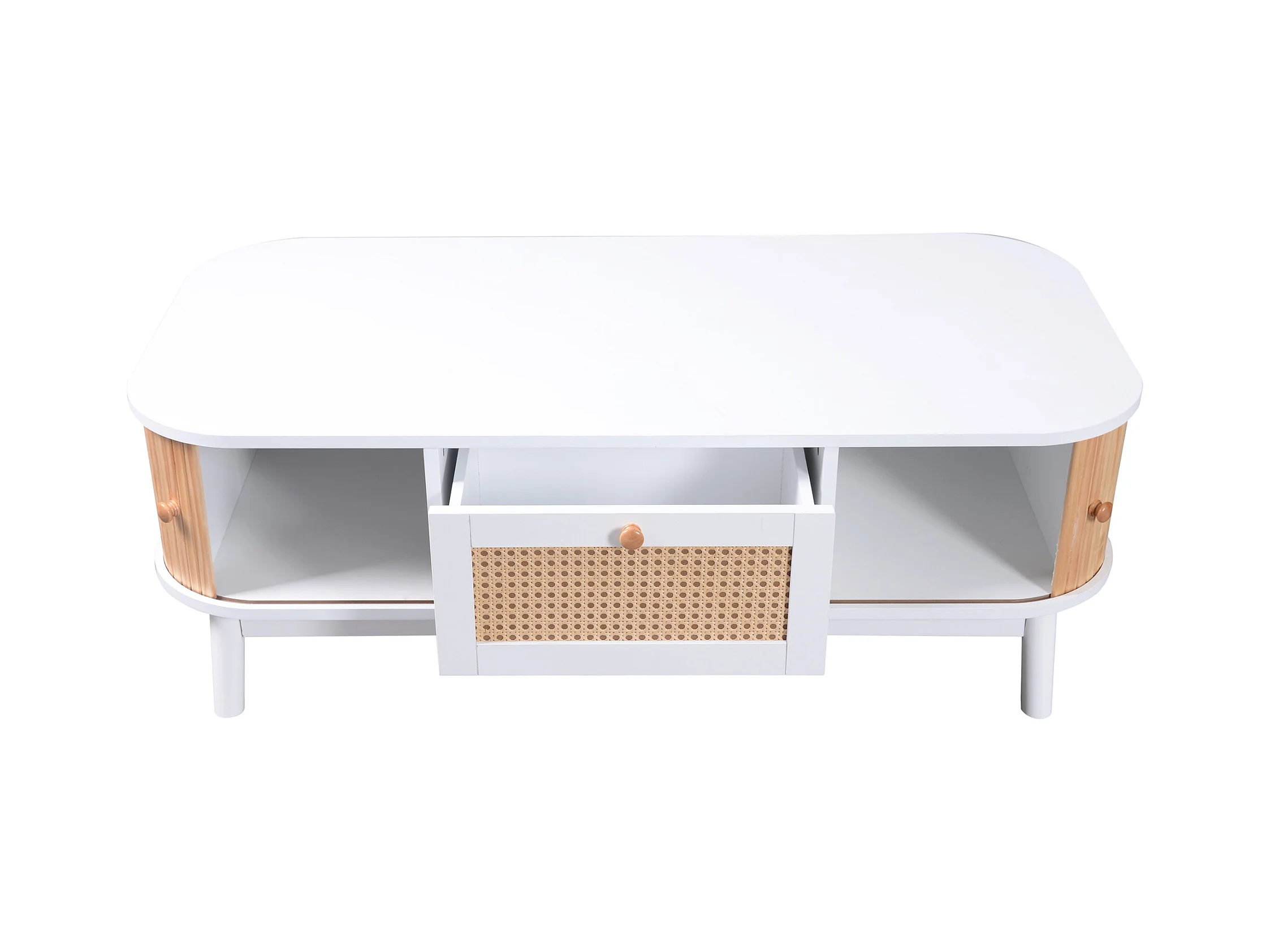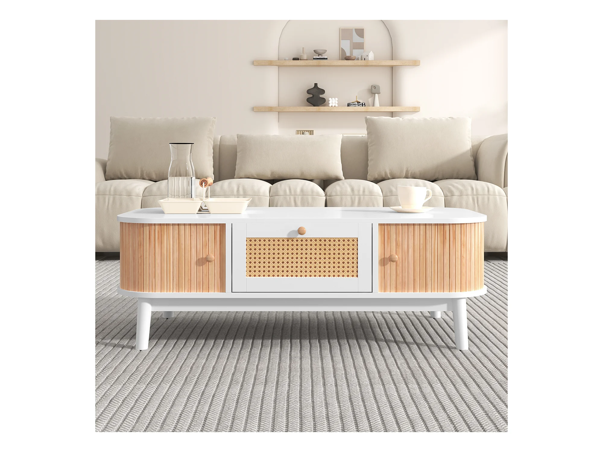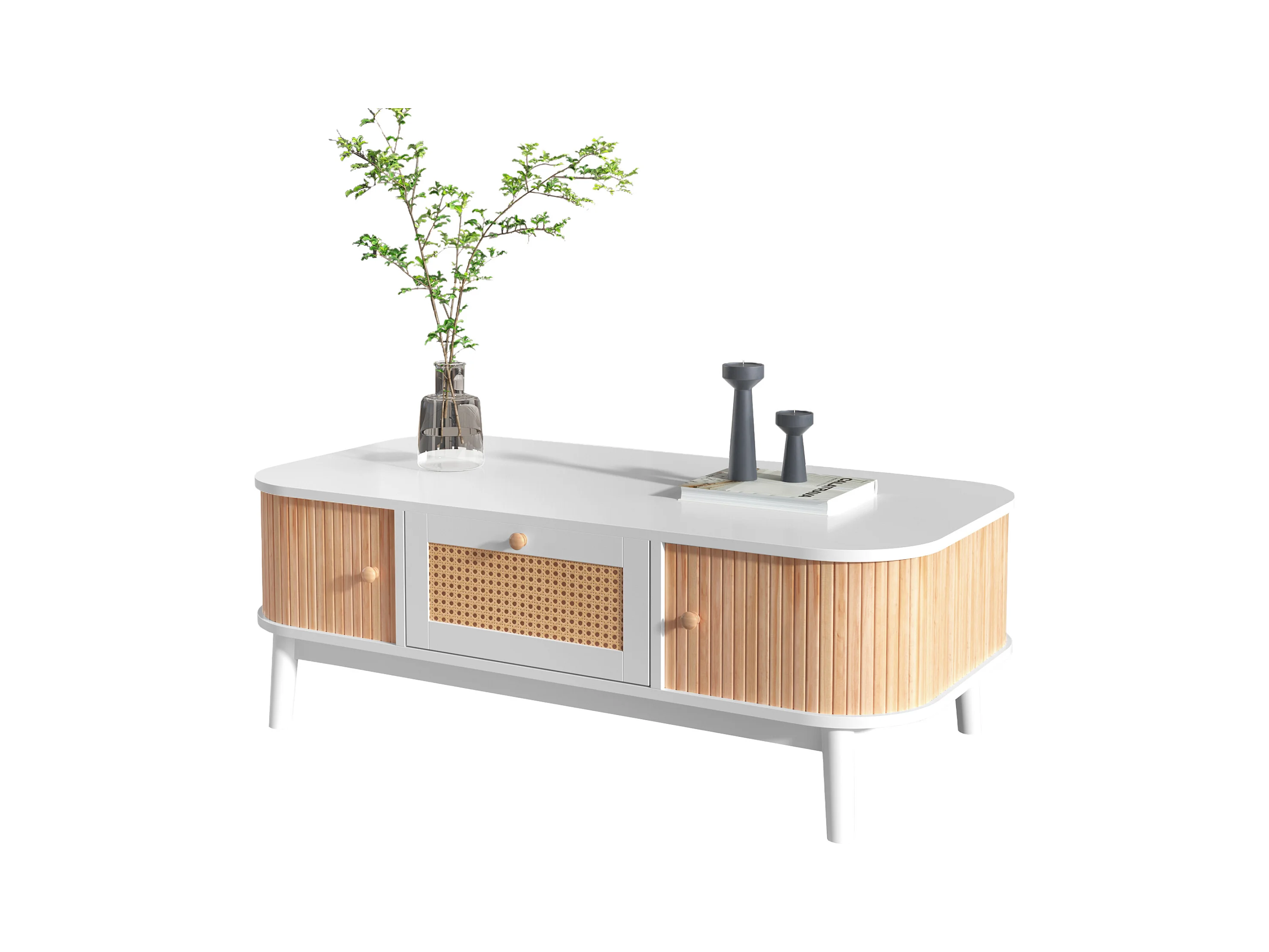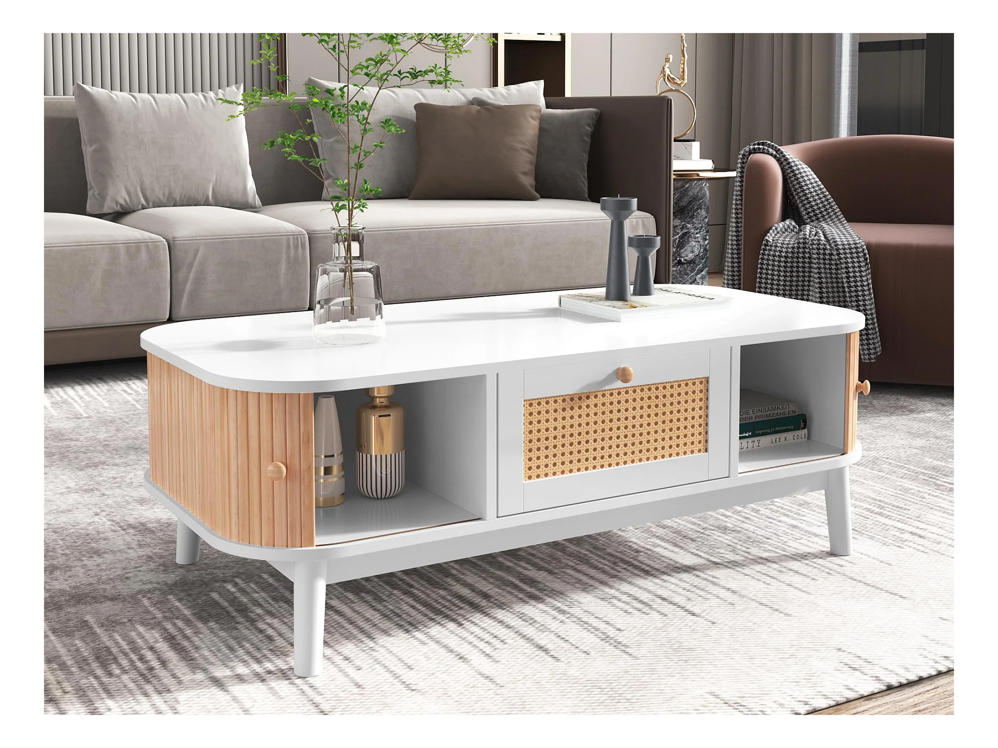 Wohnzimmer-Couchtisch – dekoriert mit Rattan und Massivholz – Landhausstil – weiß