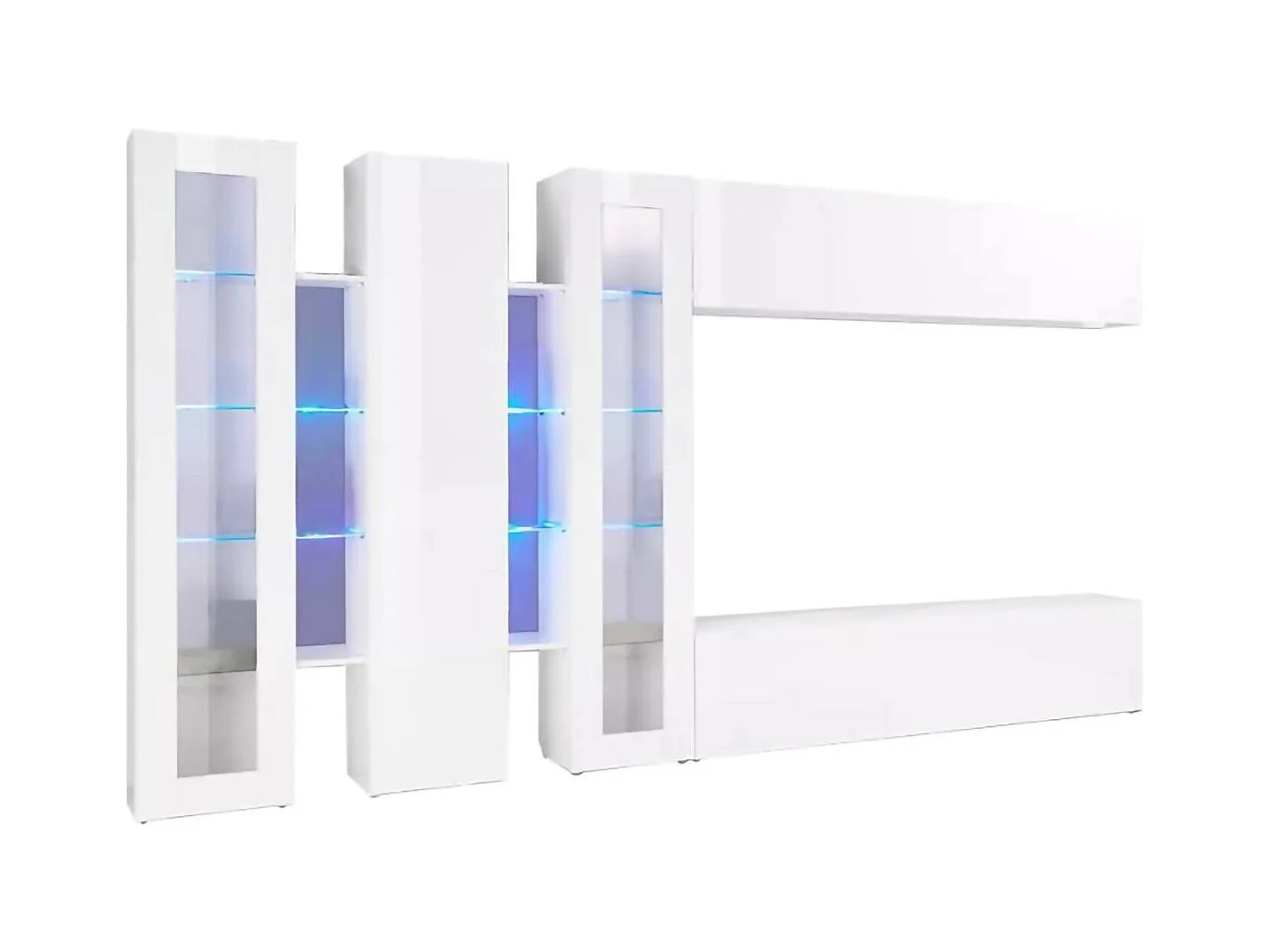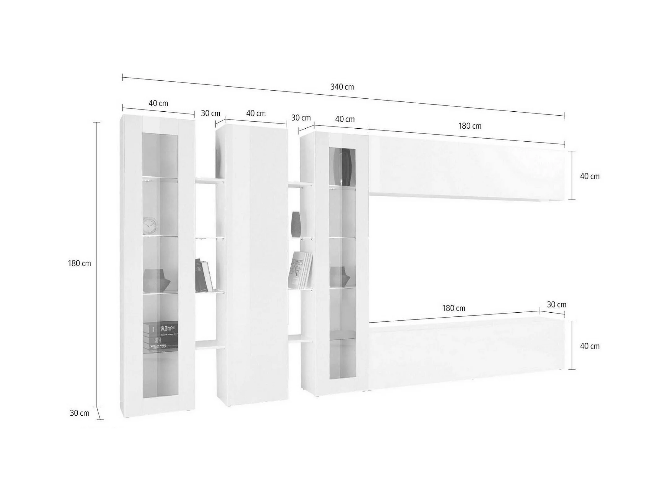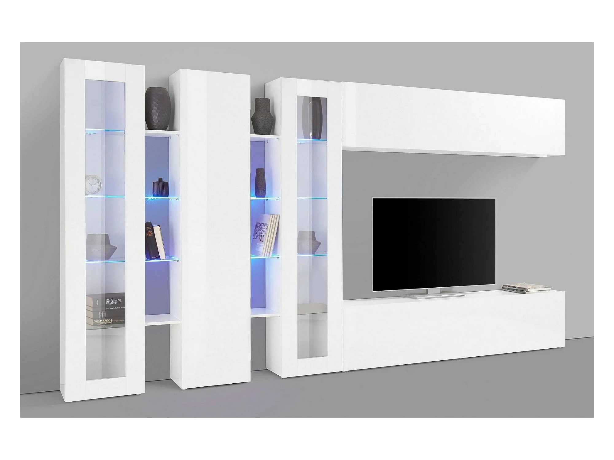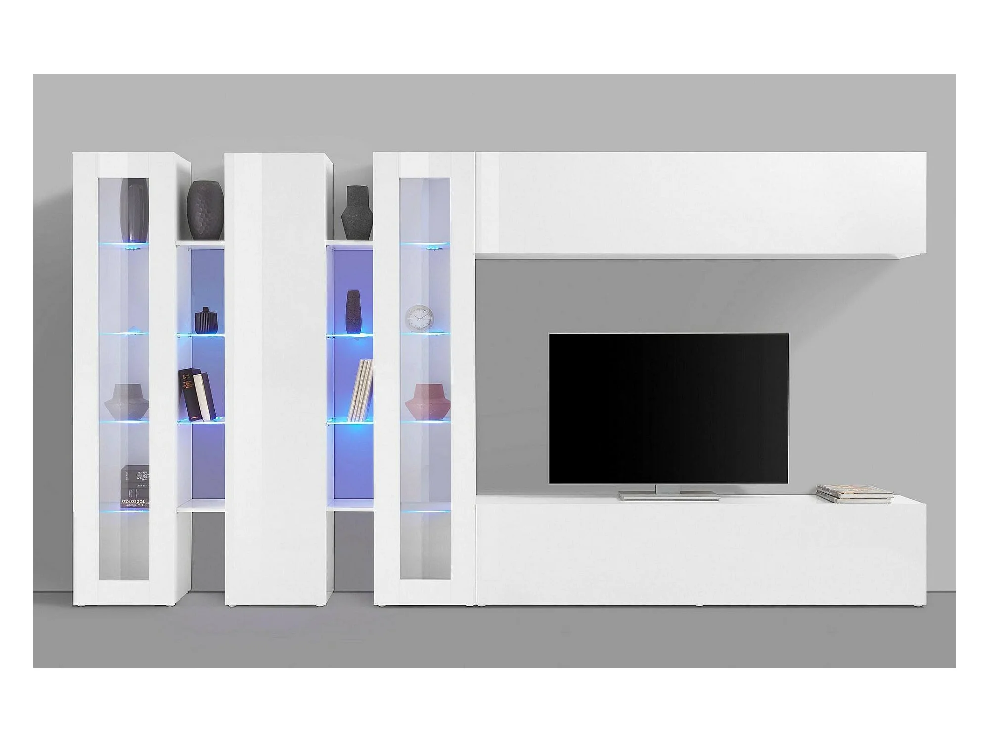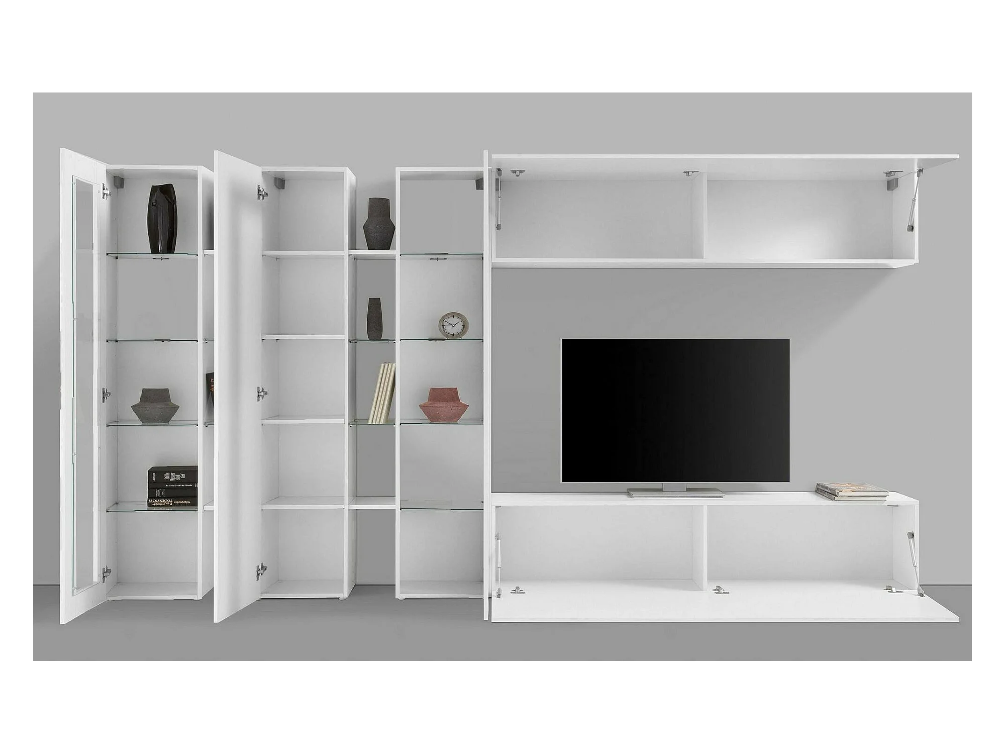 Wohnzimmermöbel Dbenal, Wohnzimmer-Set TV-Möbel mit 5 Türen, Mehrzweck-Wohnmöbel, 100% Made in Italy, cm 340x30h180, glänzend weiß