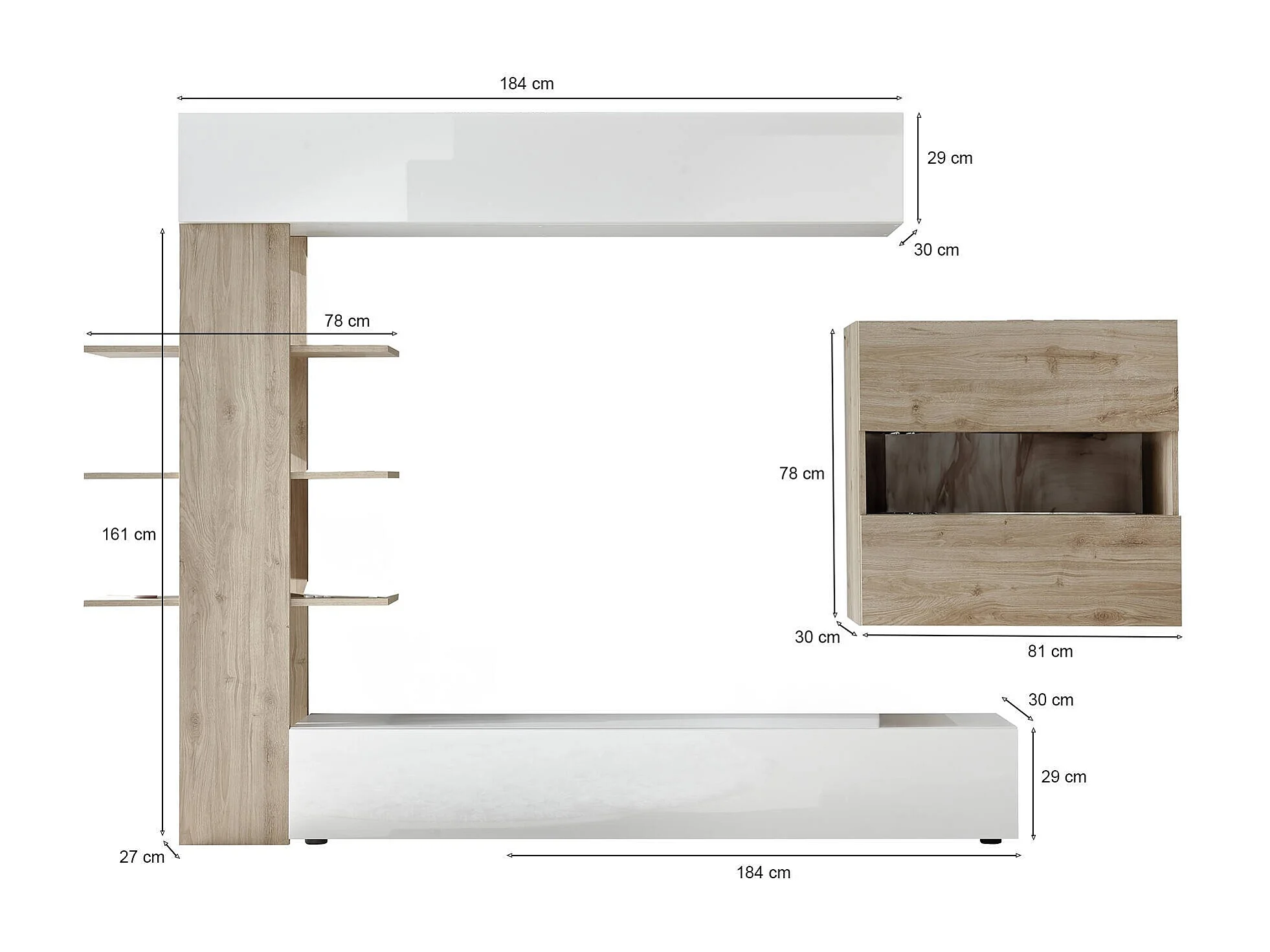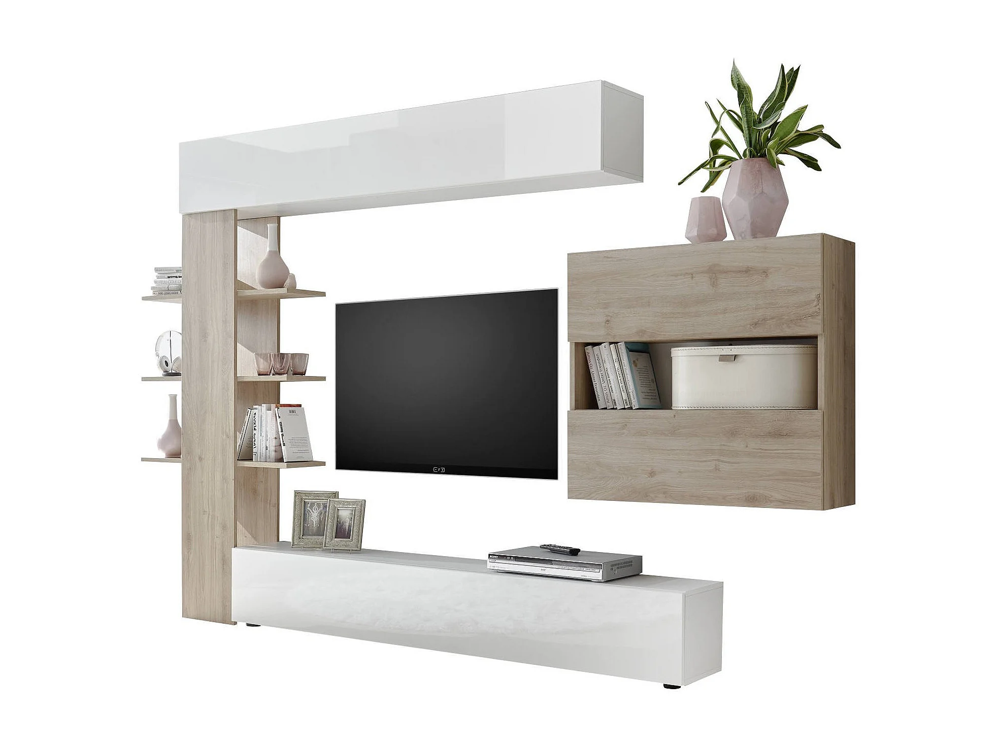 Wohnzimmermöbel Dbogdanovi, Modulares Wohnzimmerset, Mehrzweck-Wohnzimmermöbel, TV-Schrank, Made in Italy, 295x30 h187 cm, Glänzendes Weiß und Eiche