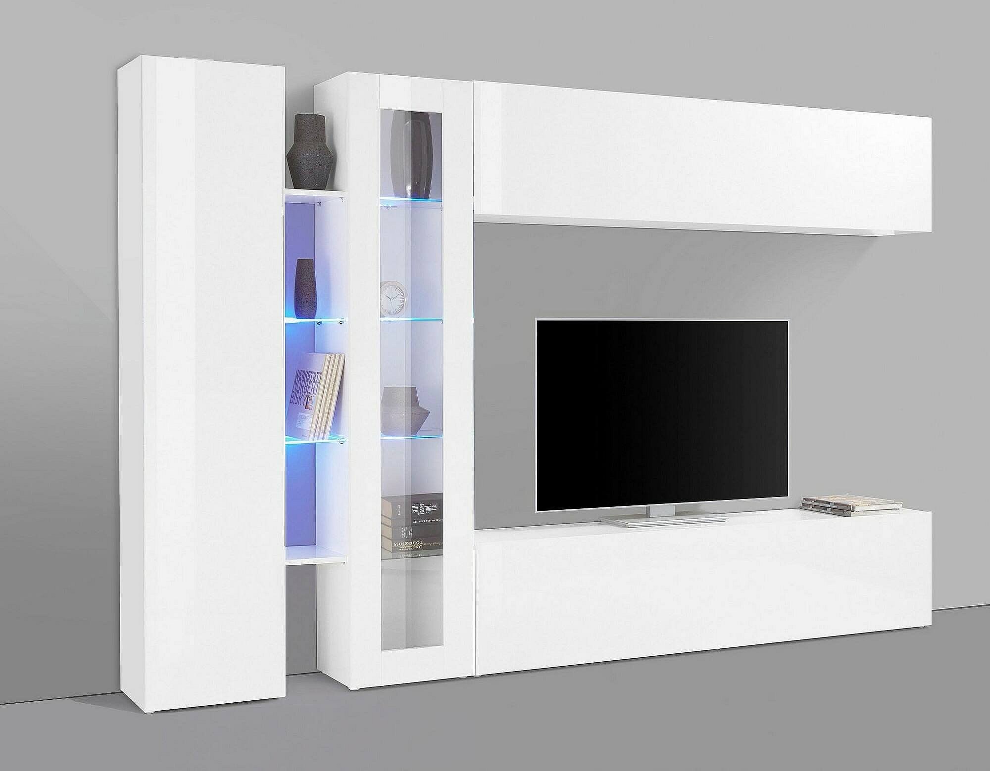 STRUKTUR UND VERWENDUNG - TV-Schrank für das Wohnzimmer, bestehend aus einem Fernsehständer, zwei Schranksäulen, von denen eine mit Glastür und einer Schrankwand mit Klappe und Flügeltüren - Die Auswahl an verschiedenen Möbelstücken, aus denen sich diese Wohnzimmerkomposition zusammensetzt macht das Design dieses modernen, funktionalen und platzsparenden Möbelstücks aus - Integriertes blaues LED-Beleuchtungssystem, das dem Produkt einen Hauch von Klasse verleiht - Neben der Positionierung des Fernsehers können Sie die Wand mit Ihrem Lieblings-Schnickschnack individuell gestalten wird in den Regalen ausgestellt bleiben - Der Raum innerhalb der Türen ist perfekt, um Ihre Bücher, Dokumente, Dekorationsgegenstände oder Geschirr ordentlich und diskret aufzubewahren - Perfektes Wohnzimmer-Set zum Dekorieren eines Wohnzimmers, Esszimmers oder eines offenen Raums Zimmer.