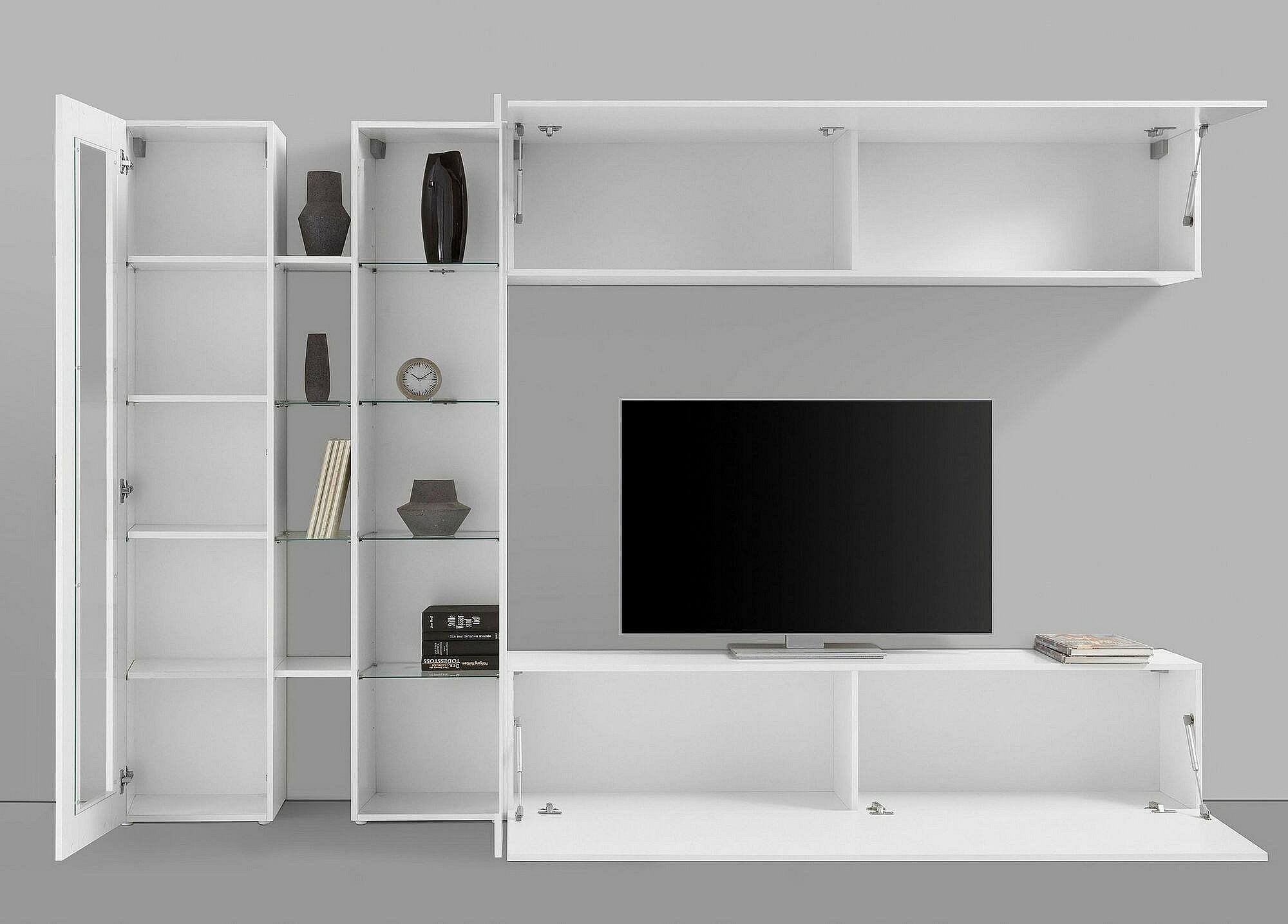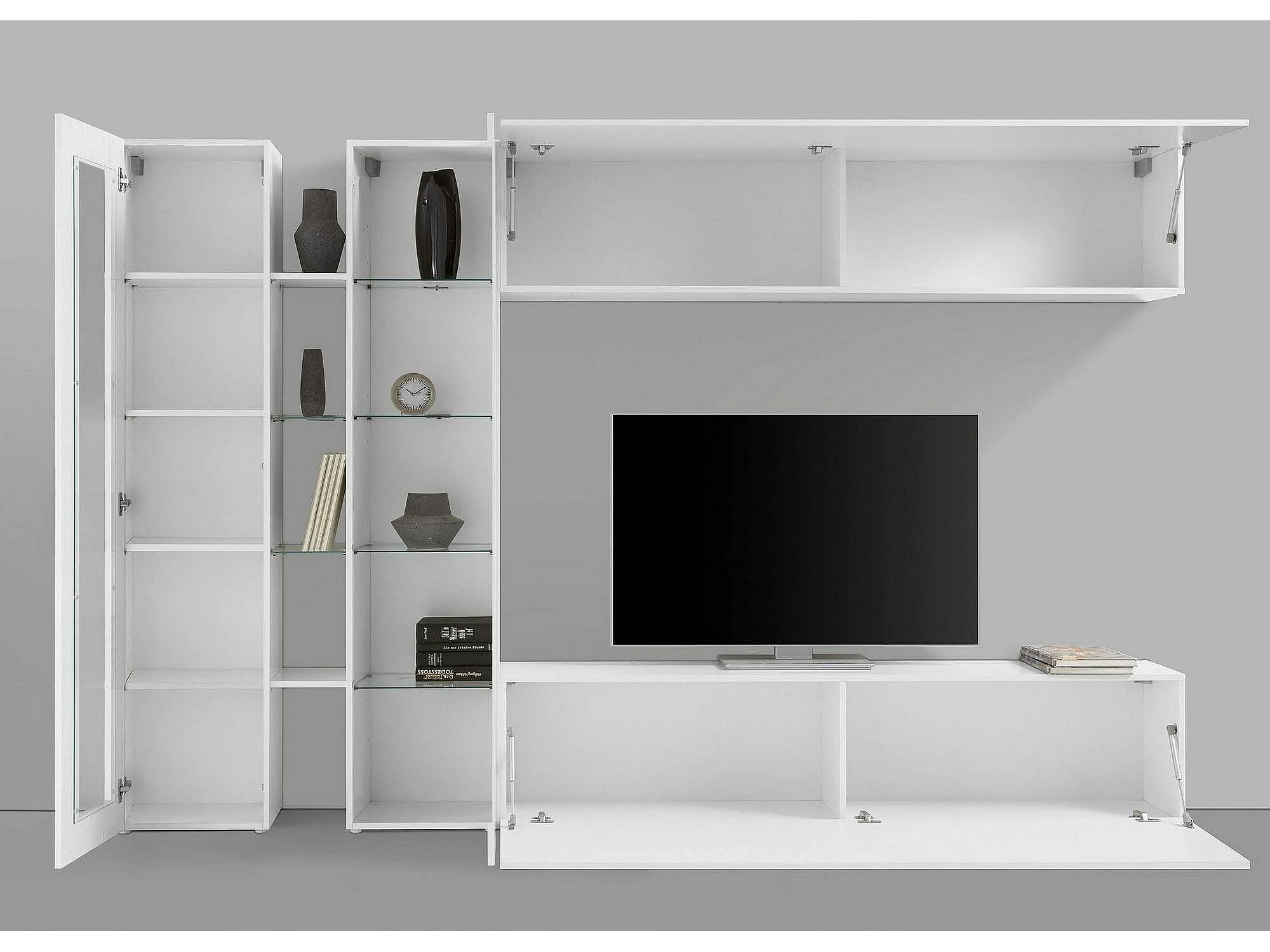 Wohnzimmermöbel Dborin, Wohnzimmer-Set TV-Möbel mit 4 Türen, Mehrzweck-Wohnmöbel, 100 % Made in Italy, cm 280 x 30 x 180, glänzend weiß
