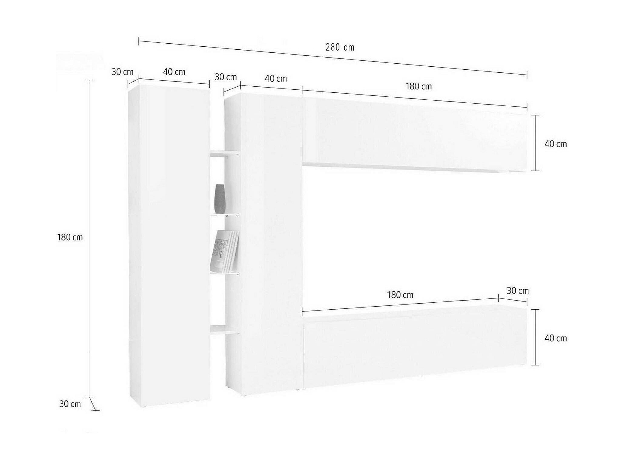 ABMESSUNGEN IN CM - Ausgestattete Wand: Länge: 340 Breite: 30 Höhe: 180 - Säulengarderobe: 40x30h180 - Wohnwand und TV-Unterschrank: 180x30h40