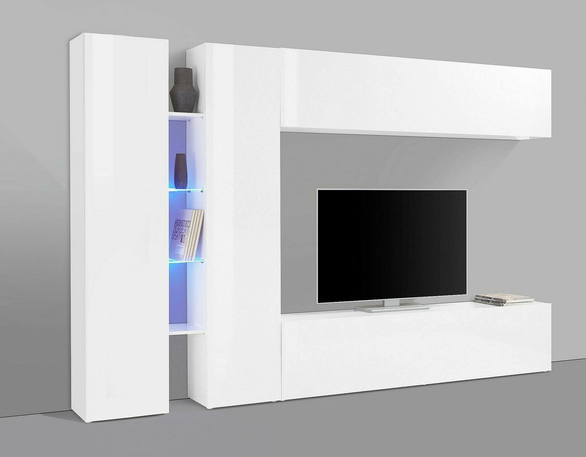 STRUKTUR UND VERWENDUNG - TV-Schrank für Wohnzimmer bestehend aus einem Fernsehständer, zwei Schranksäulen und einer Schrankwand mit Klappe und Flügeltüren - Die Auswahl an verschiedenen Möbelstücken, aus denen diese Wohnzimmerkomposition besteht, macht das Design dieses Stücks aus moderne, funktionale und platzsparende Möbel - Integriertes blaues LED-Beleuchtungssystem, das dem Produkt einen Hauch von Klasse verleiht - Neben der Positionierung des Fernsehers können Sie die Wand mit Ihren Lieblingskrimskrams individuell gestalten, die in den Regalen ausgestellt bleiben - Der Raum innerhalb der Türen ist perfekt, um Ihre Bücher, Dokumente, Dekorationsgegenstände oder Geschirr ordentlich und diskret aufzubewahren - Perfektes Wohnzimmer-Set zum Dekorieren eines Wohnzimmers, Esszimmers oder eines offenen Raums.