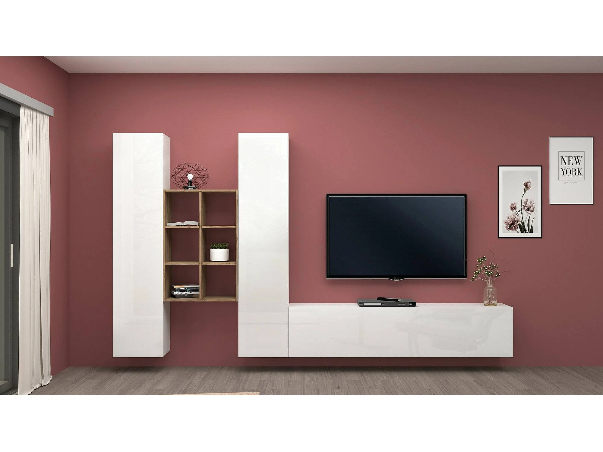Wohnzimmermöbel Dcola, Wohnzimmergarnitur TV-Möbel mit 3 Türen, Mehrzweck-Wohnmöbel, 100 % Made in Italy, cm 320x30h180, glänzend weiß und Ahorn