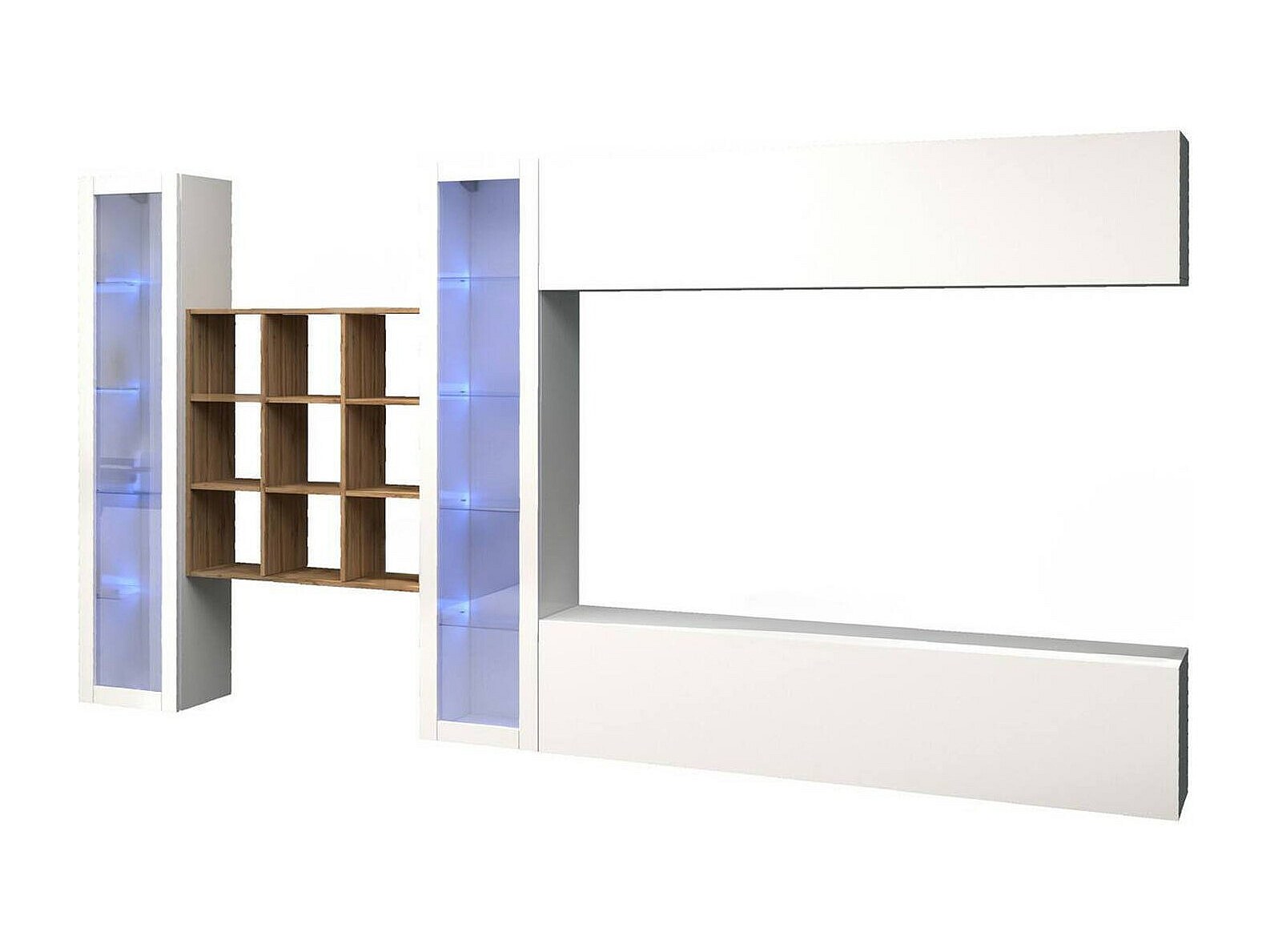 STRUKTUR UND VERWENDUNG - TV-Schrank für Wohnzimmer bestehend aus einem TV-Ständersockel, zwei Vitrinen, einer Wohnwand mit Klappe und Flügeltüren und einem Regal mit mehreren Ablagen - Die Auswahl an verschiedenen Möbelstücken, aus denen sich diese Wohnzimmerkomposition zusammensetzt das Design dieses modernen, funktionalen und platzsparenden Möbelstücks - Integriertes blaues LED-Beleuchtungssystem, das dem Produkt einen Hauch von Klasse verleiht - Zusätzlich zur Positionierung des Fernsehers können Sie die Wand mit Ihrem Lieblings-Schnickschnack individuell gestalten bleiben in den Regalen ausgestellt - Der Raum innerhalb der Türen ist perfekt, um Ihre Bücher, Dokumente, Dekorationsgegenstände oder Geschirr ordentlich und diskret aufzubewahren - Perfektes Wohnzimmer-Set zum Dekorieren eines Wohnzimmers, Esszimmers oder eines offenen Raums Zimmer.