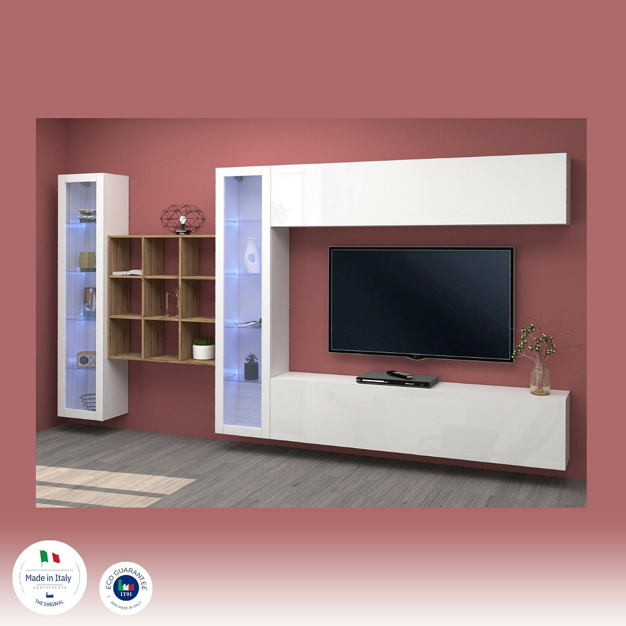 Wohnzimmermöbel Dfancon, Wohnzimmer-Set TV-Möbel mit 4 Türen, Mehrzweck-Wohnzimmermöbel mit Vitrine und LED-Licht, 100 % Made in Italy, cm 350x30h180, glänzend weiß
