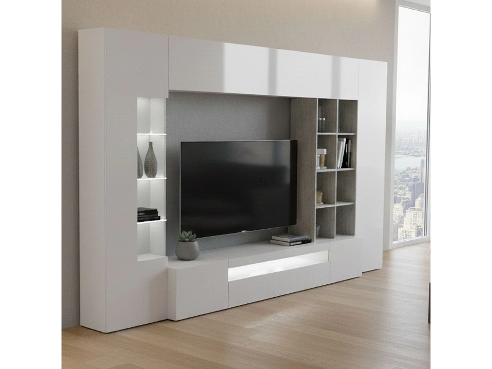 Wohnzimmermöbel Dfazz, TV-Ständer Wohnzimmer-Set, Mehrzweck-Wohnzimmermöbel, 100% Made in Italy, cm 290x40h192, glänzend weiß und Zement