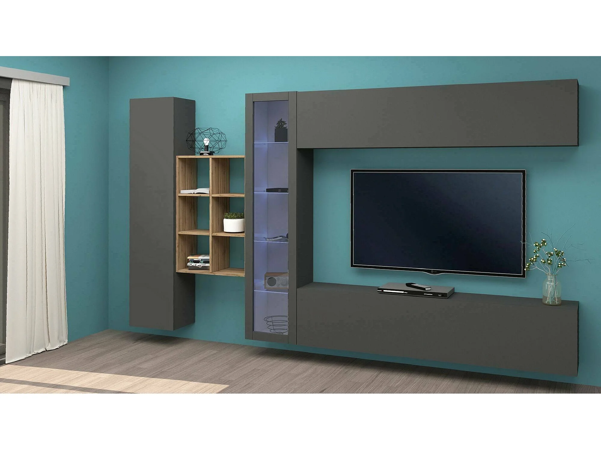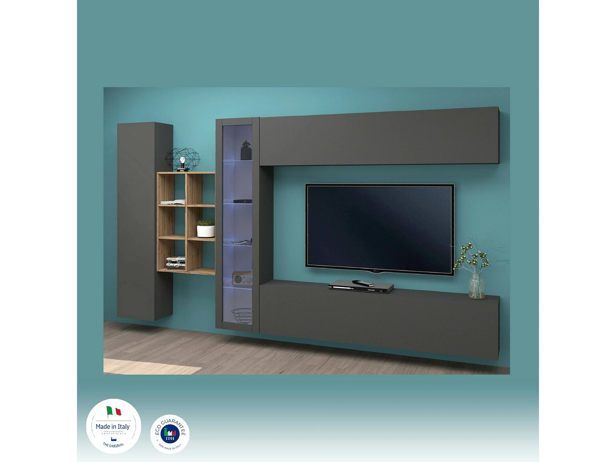 Wohnzimmermöbel Dino, Wohnzimmer-Set TV-Möbel mit 4 Türen, Mehrzweck-Wohnmöbel mit Vitrine und LED-Licht, 100% Made in Italy, cm 280x30h180, Anthrazit und Ahorn