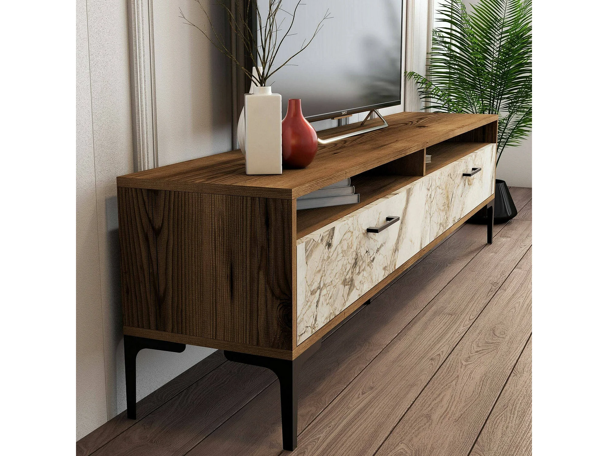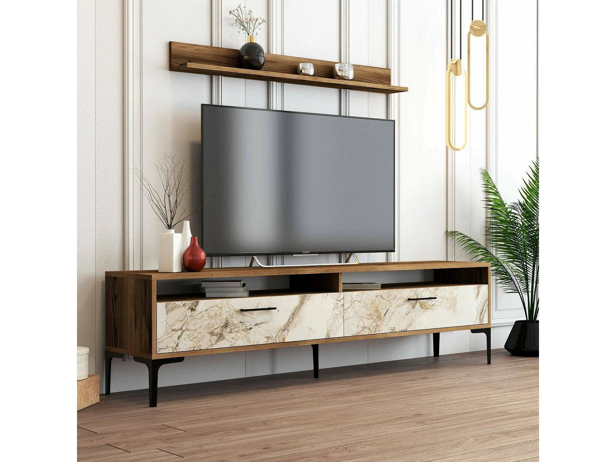 Wohnzimmermöbel Dkatseri, Modulares Wohnzimmerset, Mehrzweck-Wohnzimmermöbel, Moderner TV-Schrank, 180x35h47 cm, Nussbaum und Weißer Marmor