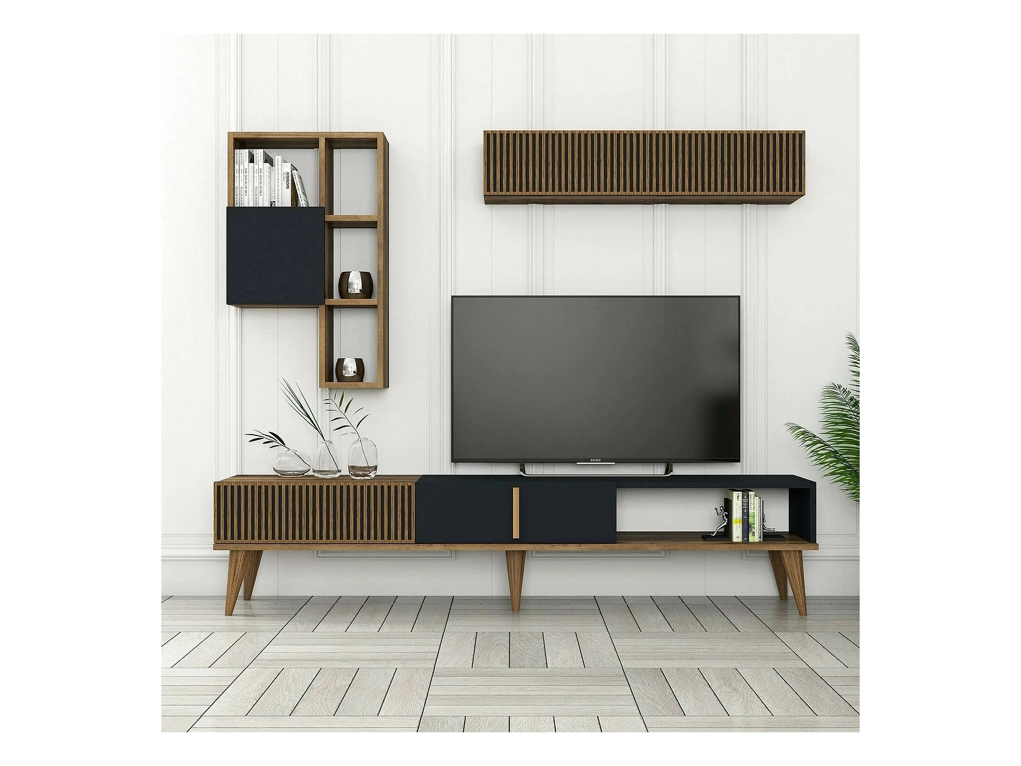 Wohnzimmermöbel Dmalavas, Modulares Wohnzimmerset, Mehrzweck-Wohnzimmermöbel, Moderner TV-Schrank, 180x35h40 cm, Walnuss und Anthrazit