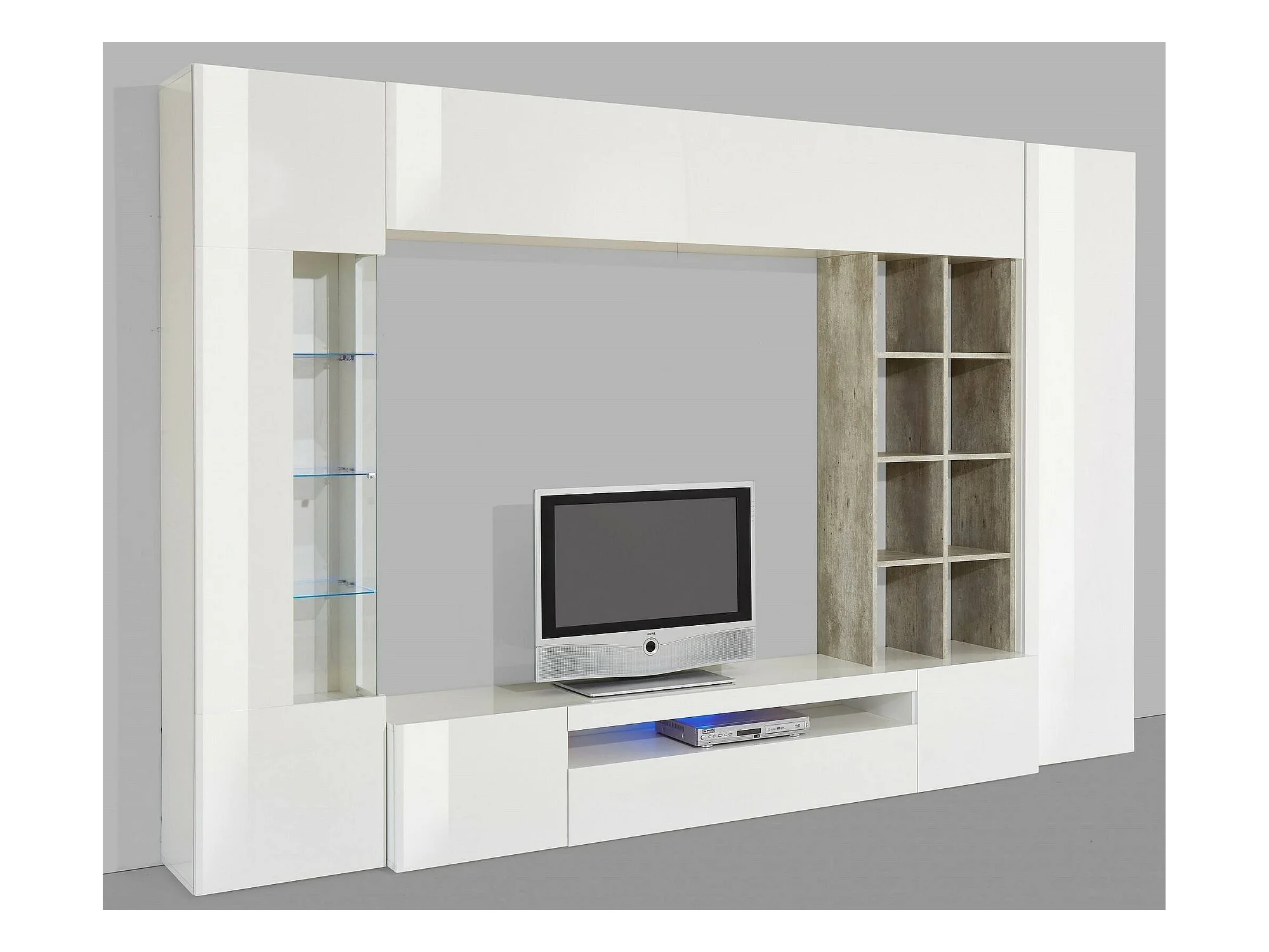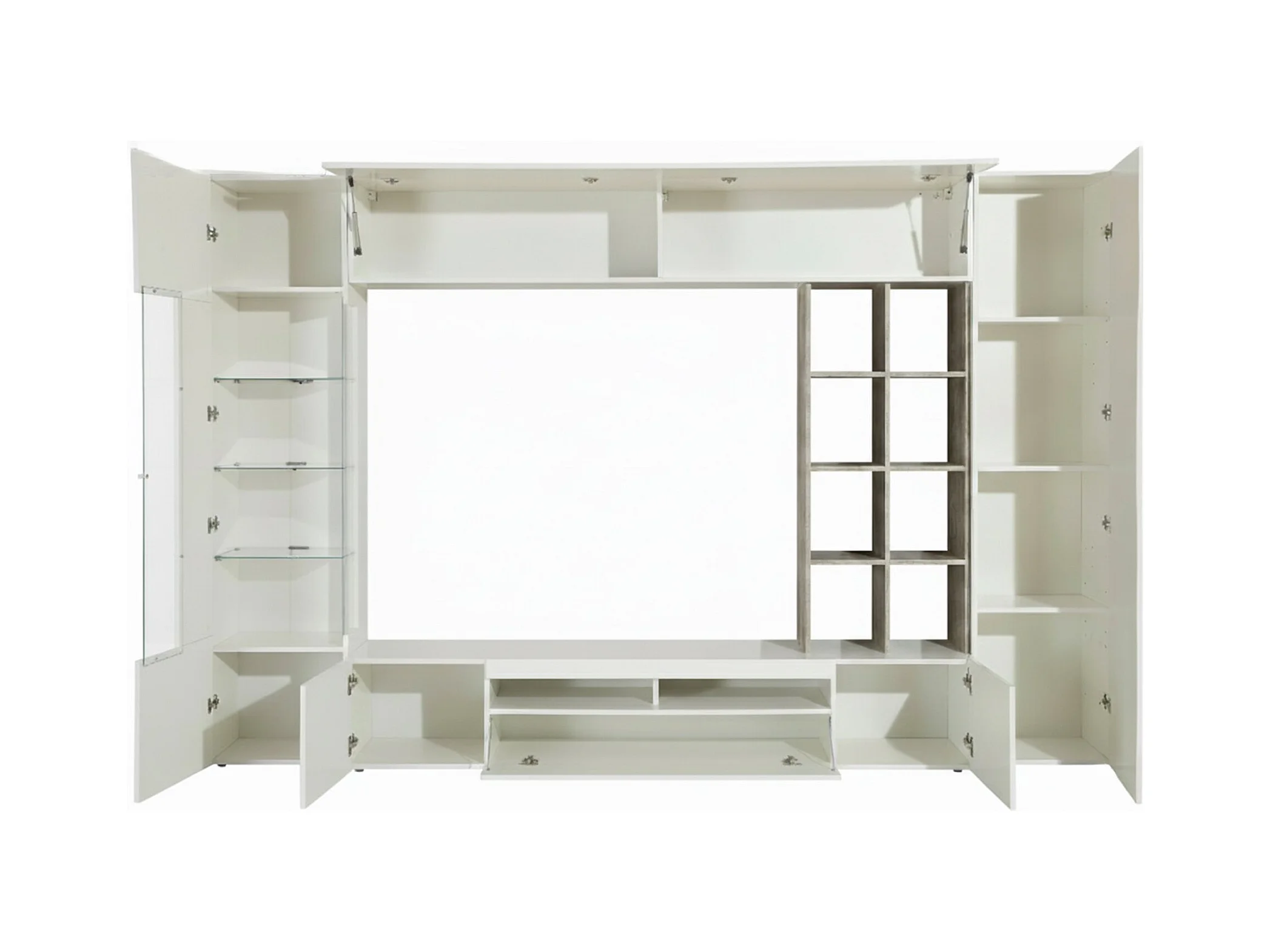 Wohnzimmermöbel Iago, TV-Ständer Wohnzimmer-Set, Mehrzweck-Wohnzimmermöbel, 100% Made in Italy, cm 290x40h192, glänzend weiß und Zement