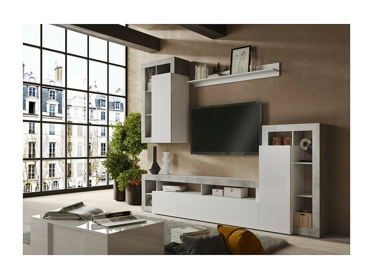Wohnzimmermöbel-Set, Kollektion BURA, Länge 280 cm. Farben Beton und glänzend weiß lackiert.