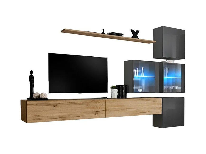 Wohnzimmermöbel-Set SWITCH XIX im Design, Farbe Wotan-Eiche und glänzend Grau.