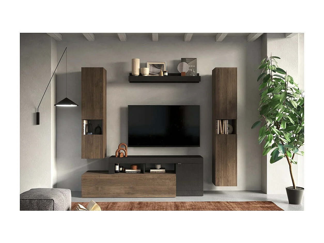 Wohnzimmermöbelset aus der FREDO-Kollektion mit Schublade und 3 Türen. Farbe Schwarz und dunkle Eiche.