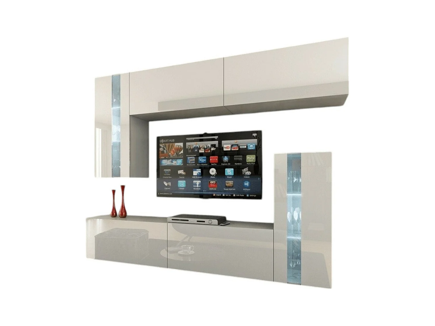 Wohnzimmermöbelset in Weiß, hängende Kollektion CEPTO XXX. 203cm, 6 Möbelstücke, LED, modular.