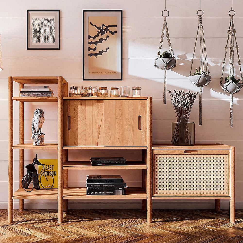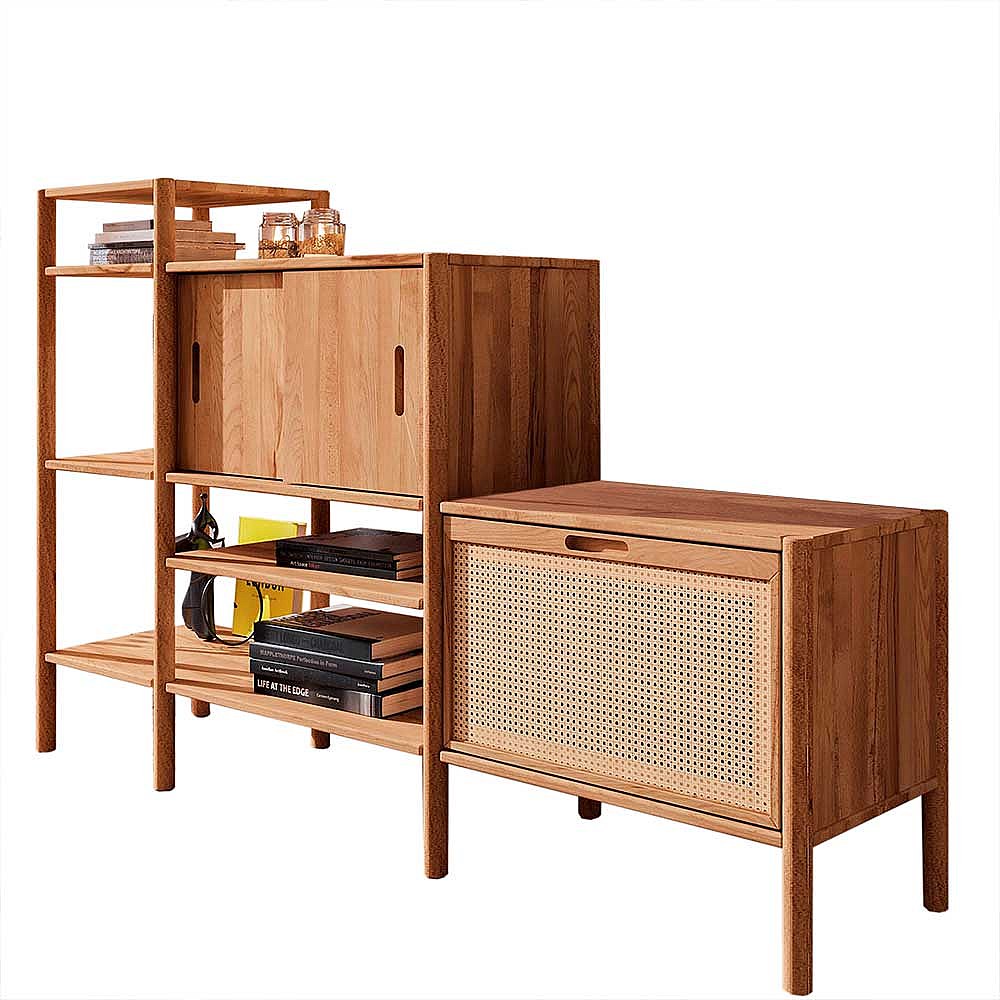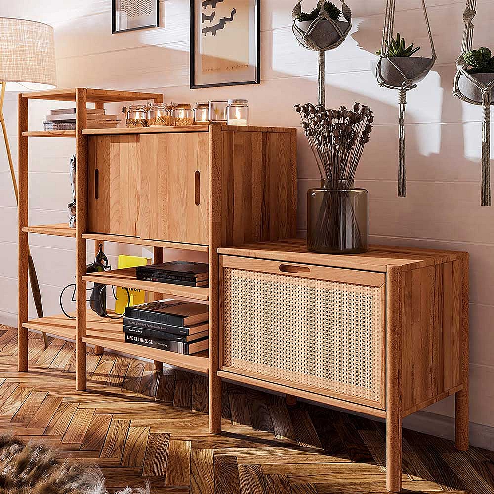 Wohnzimmerregal mit Geflecht aus Wildbuche Massivholz Rattan
