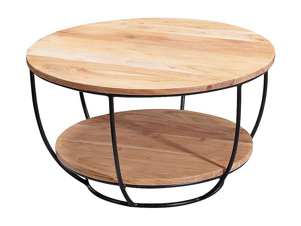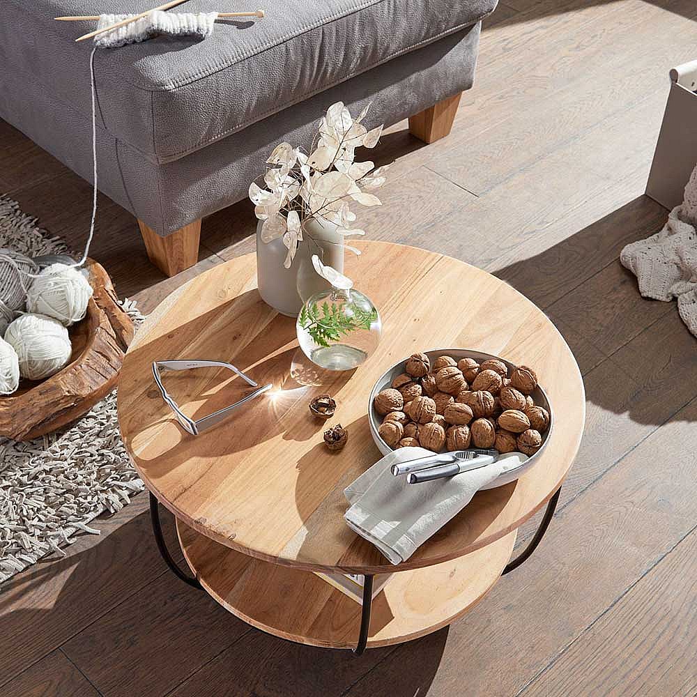 Wohnzimmertisch aus Akazie Massivholz und Edelstahl rund