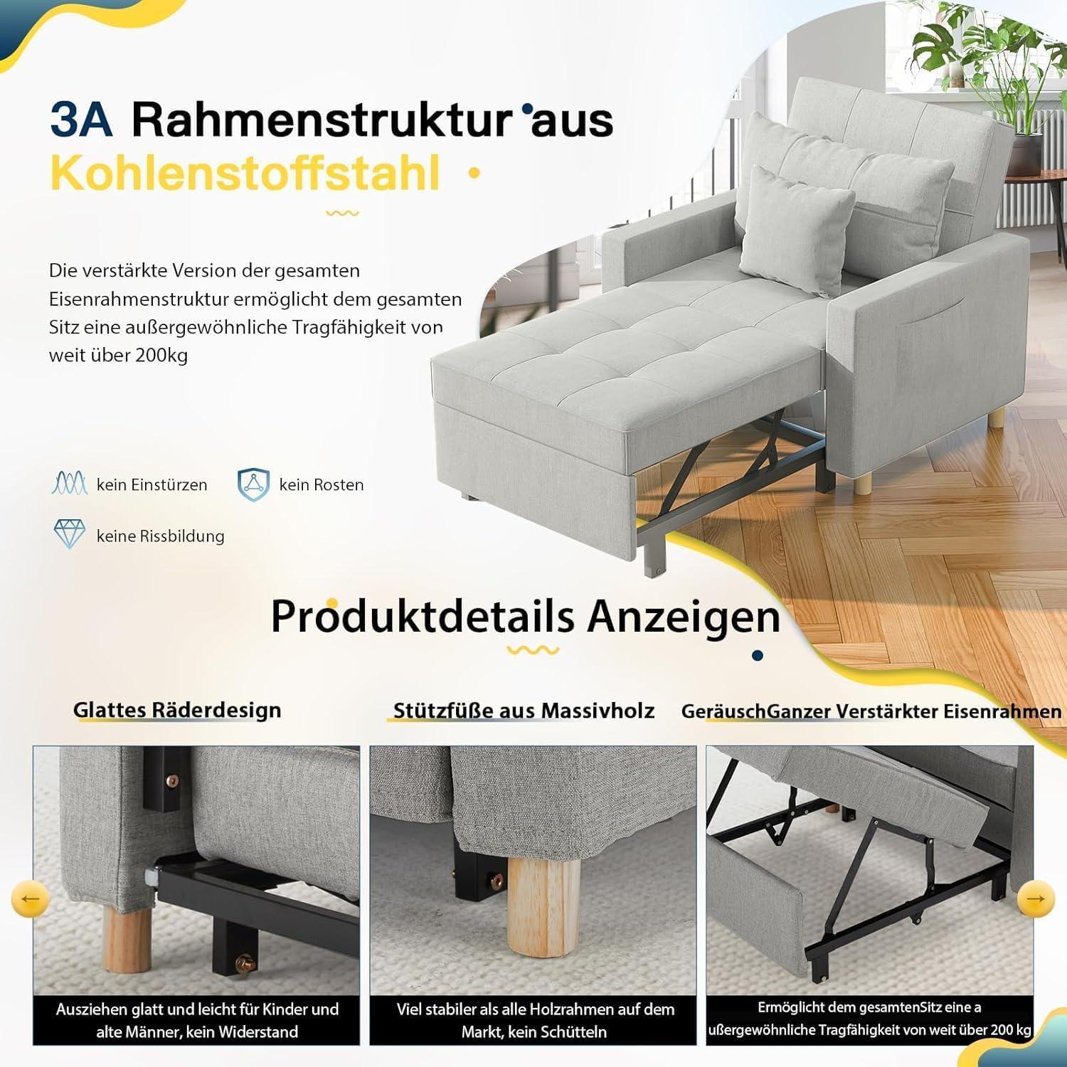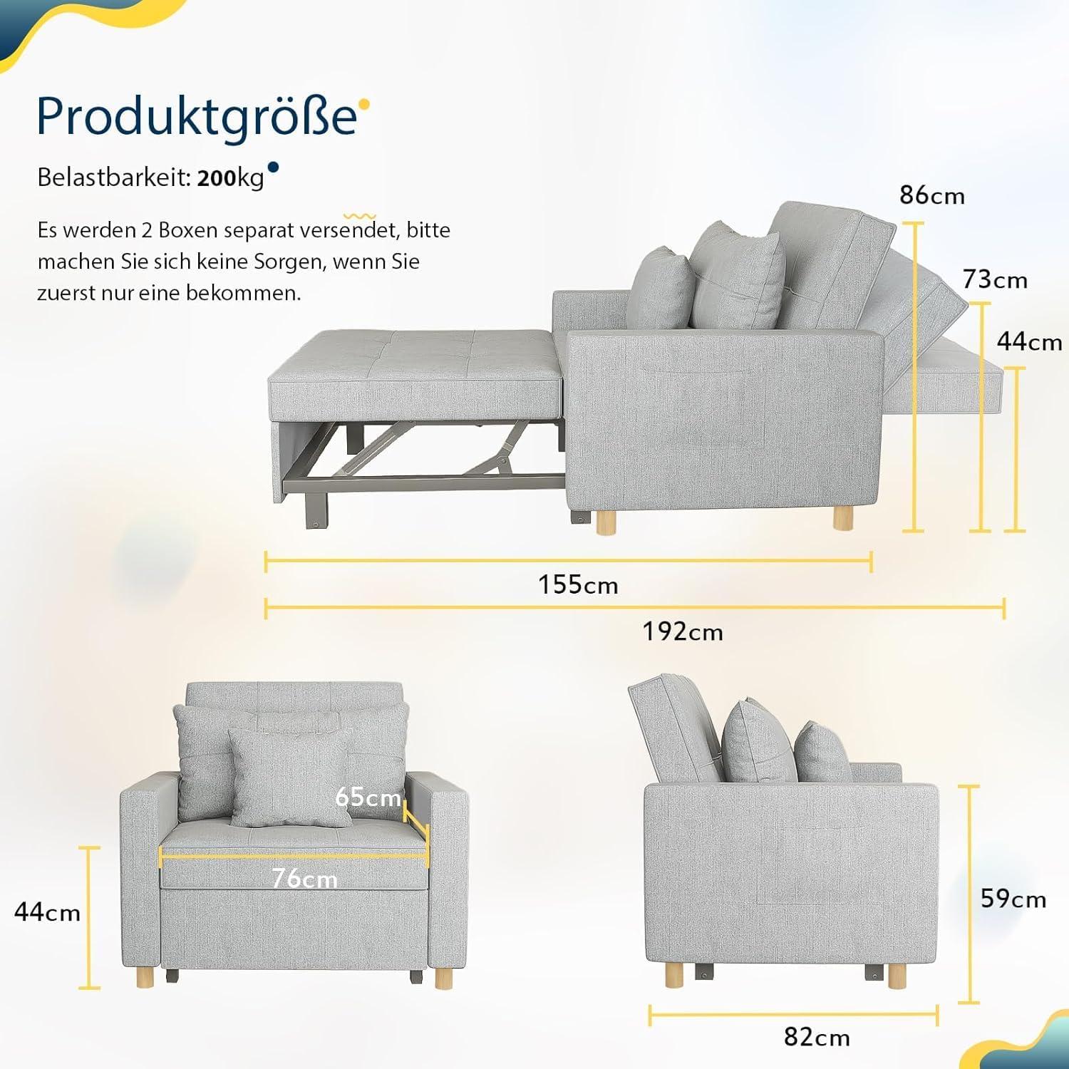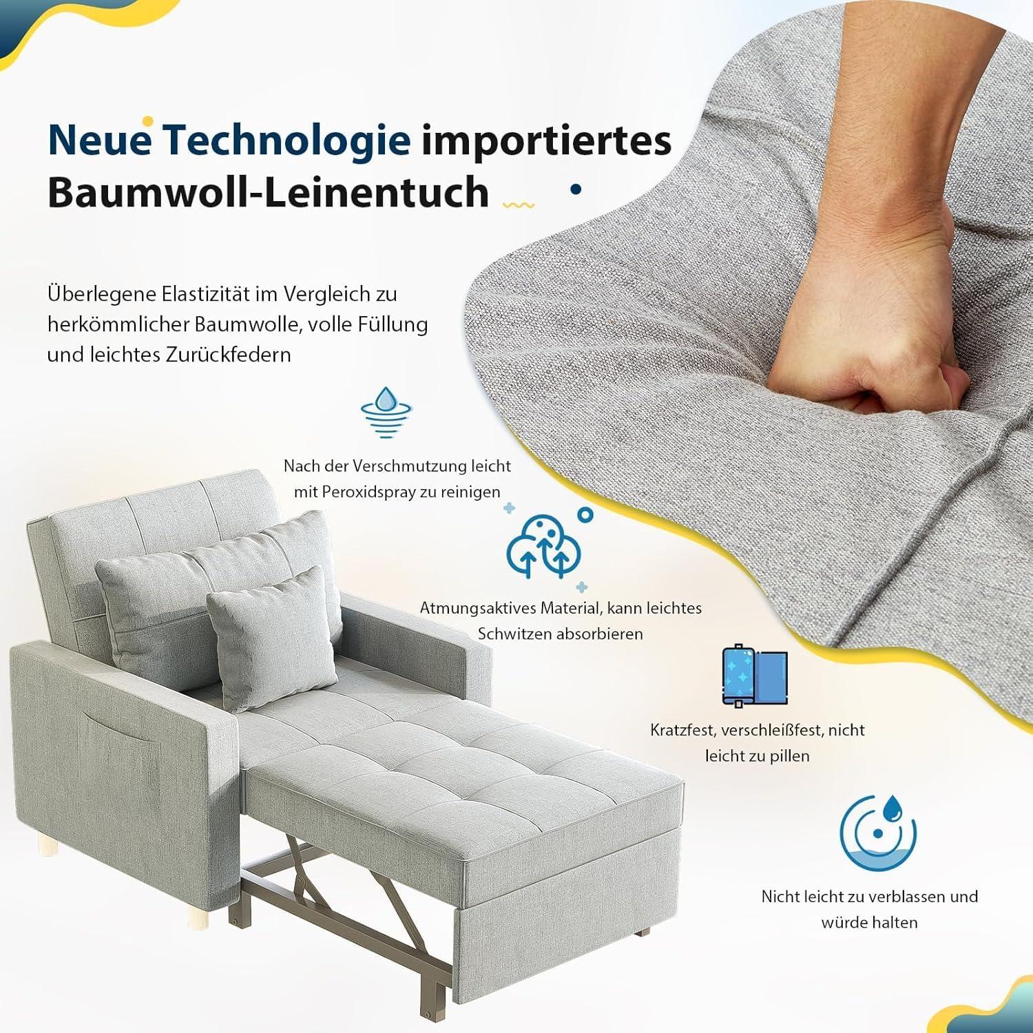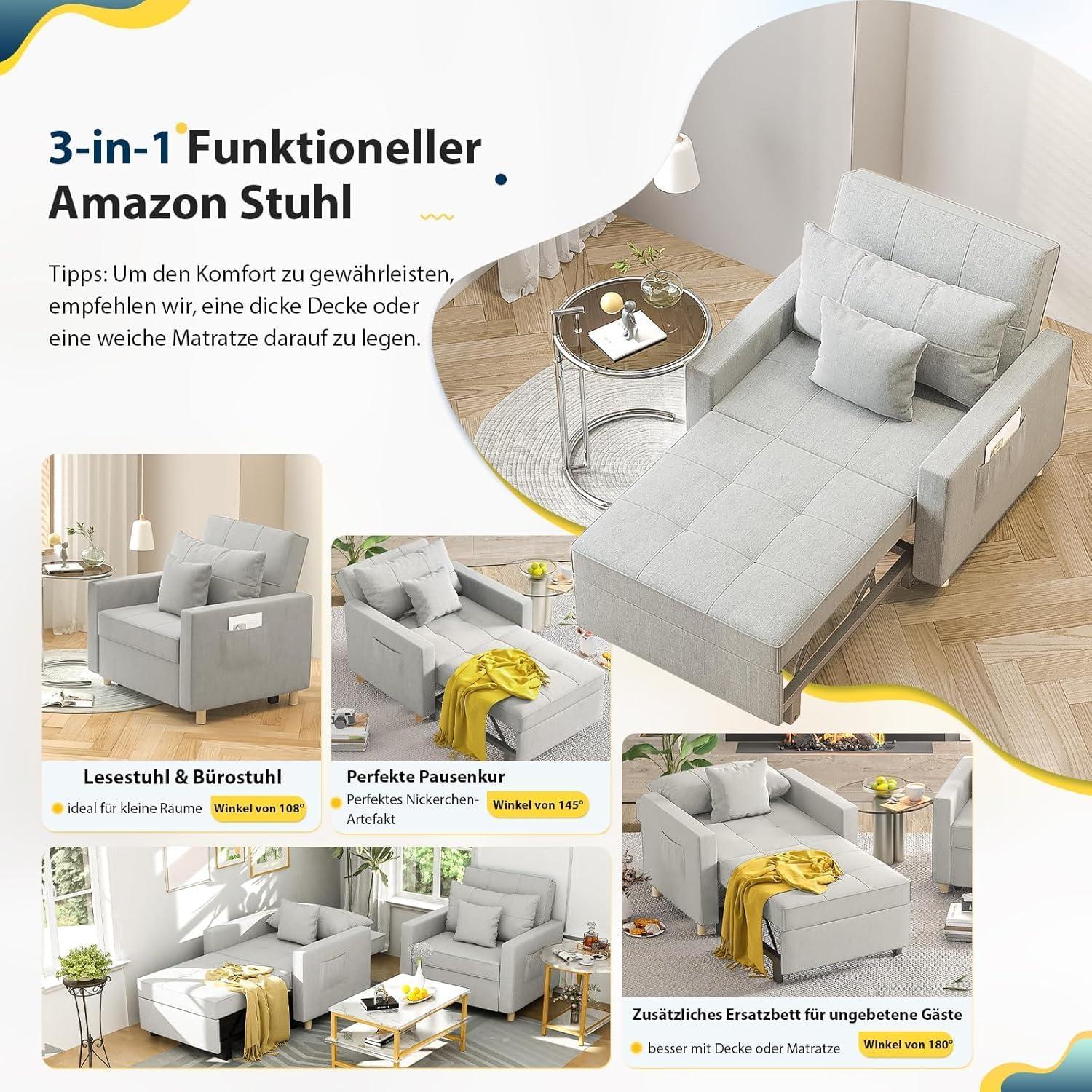 YODOLLA 192cm schlafsessel, 3-in-1 Schlaferstuhl ausziehbar mit Bettfunktion, Seitentasche & verstellbarer Rückenlehne für Gästezimmer, Hellgrau