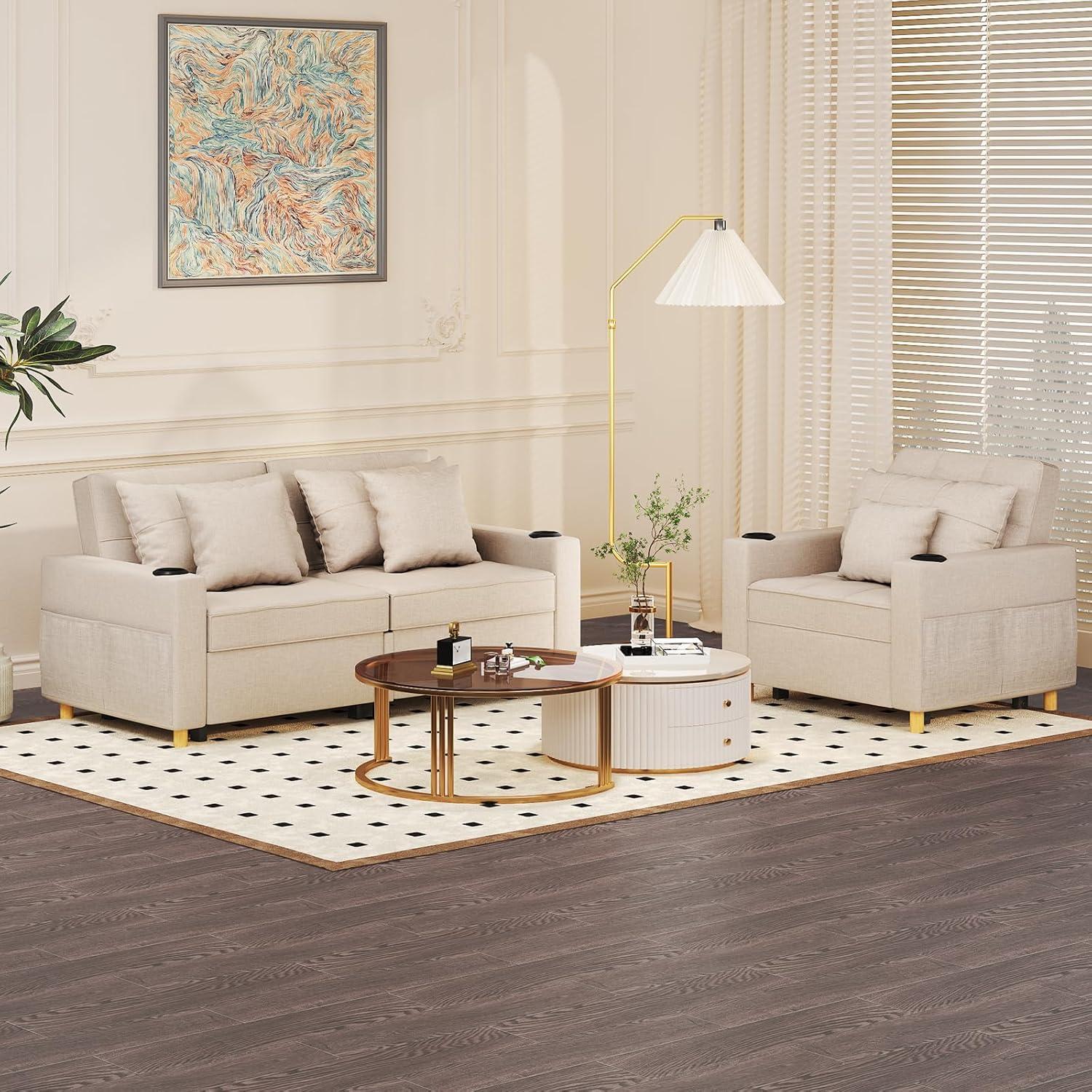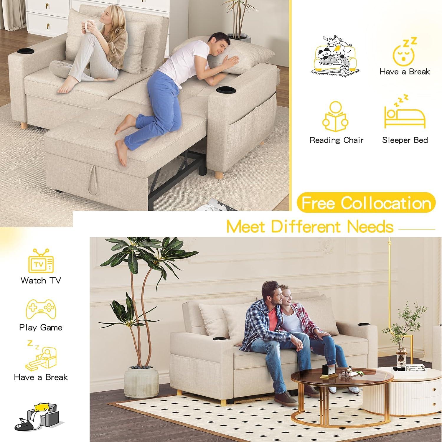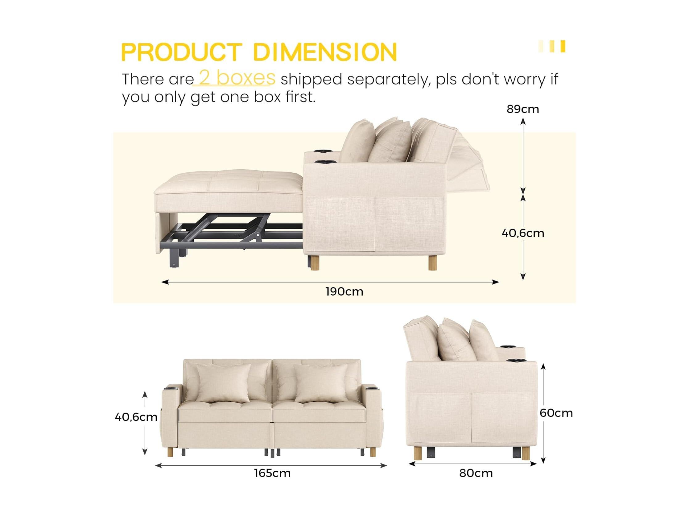 YODOLLA 2-Sitzer Schlafsessel,196x175x92 cm, mit verstellbarer Rückenlehne, ausziehbares Schlafsofa für Erwachsene, Beige