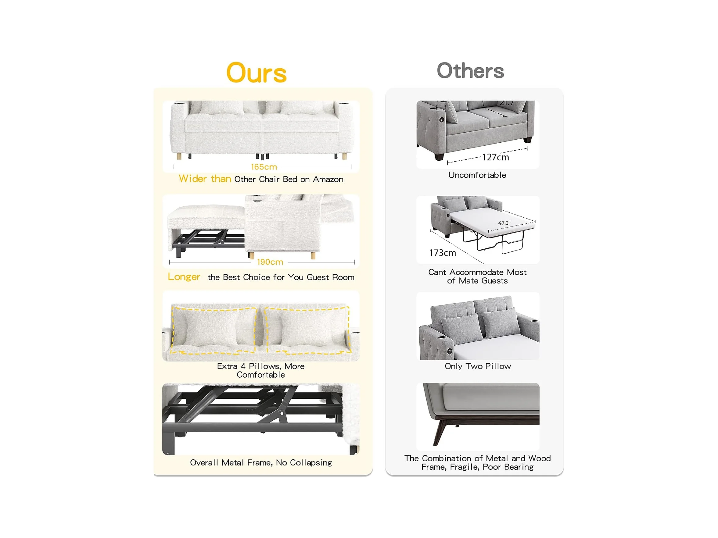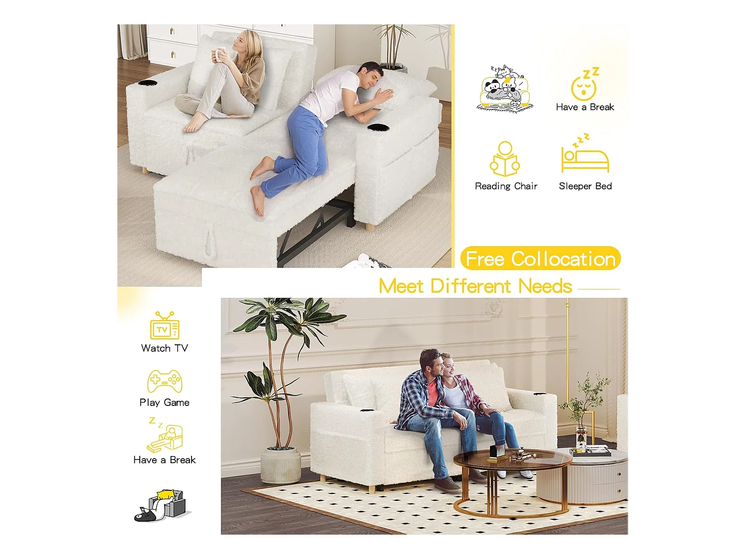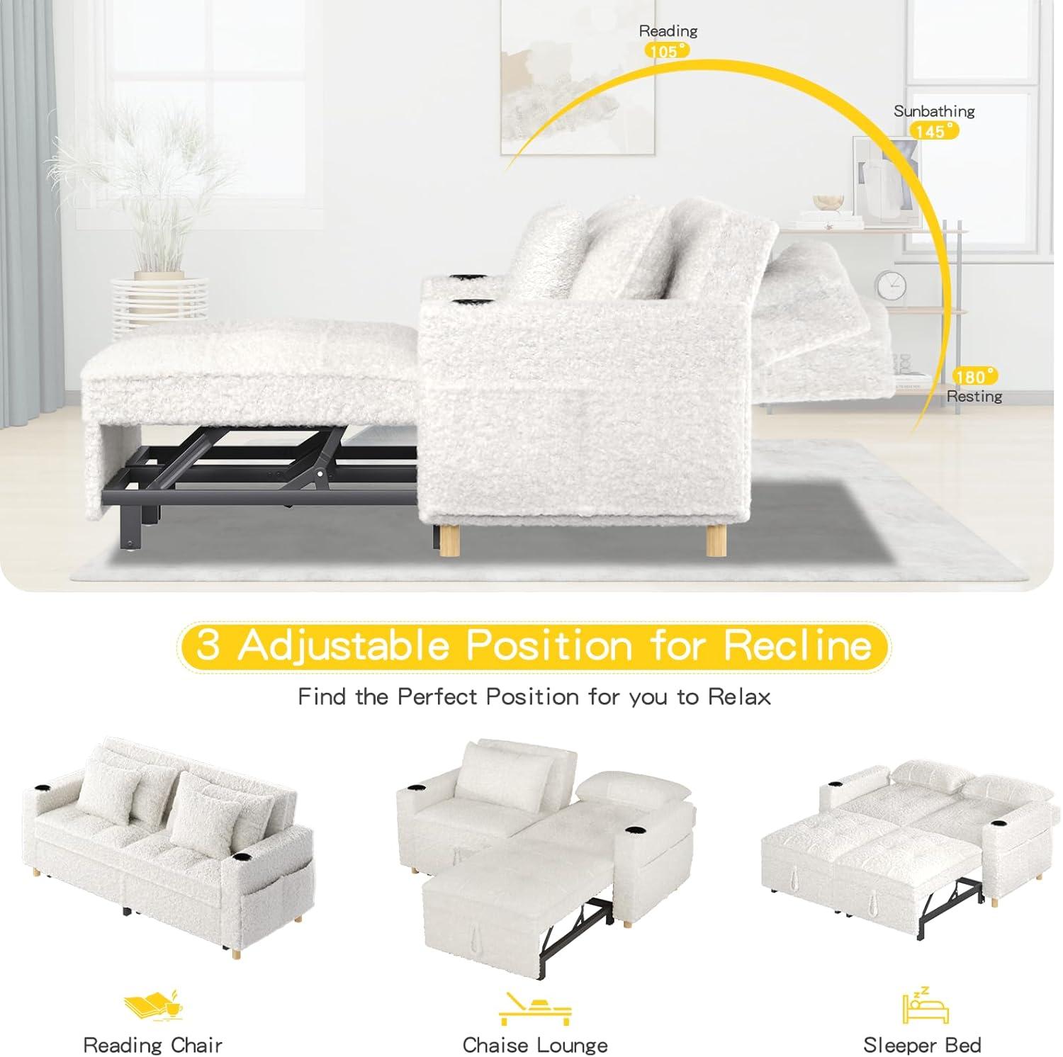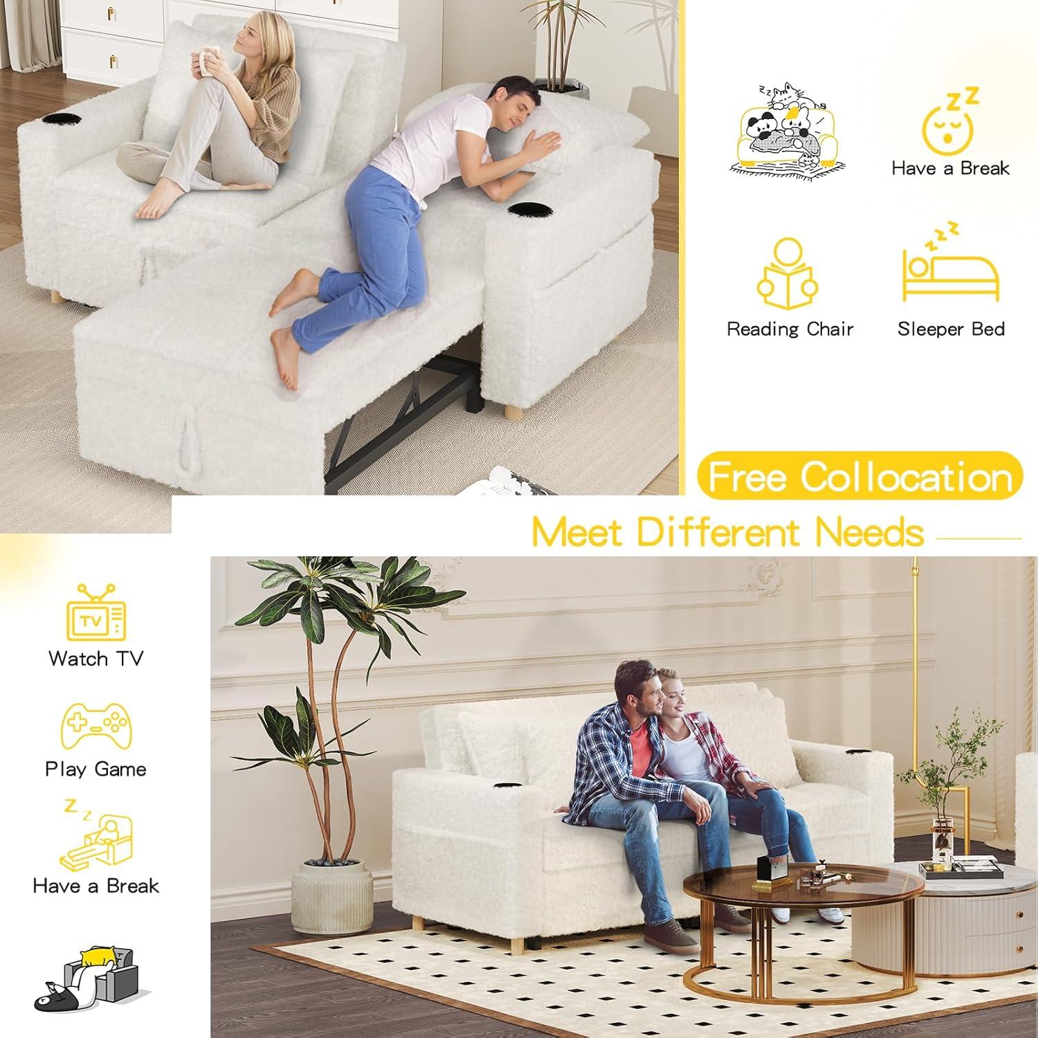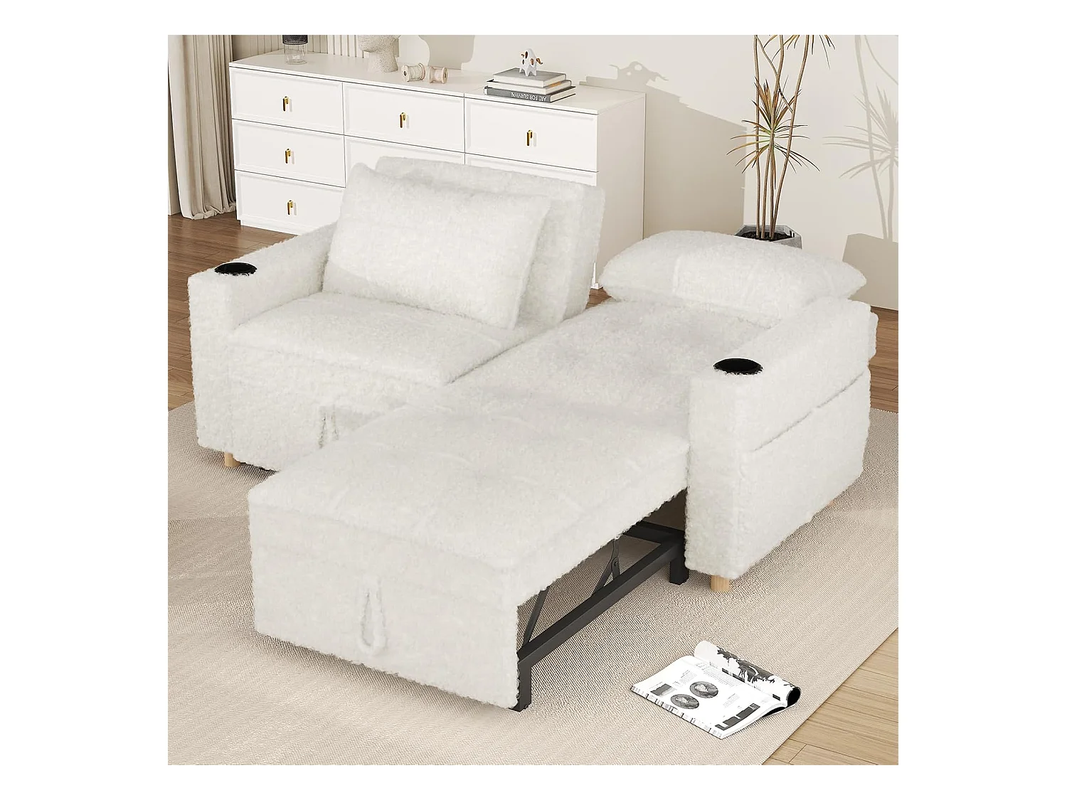 YODOLLA 3-in-1 Schlafsessel mit verstellbarer Rückenlehne, ausziehbares Doppelbett mit Bettfunktion für Erwachsene, Teddy Weiß