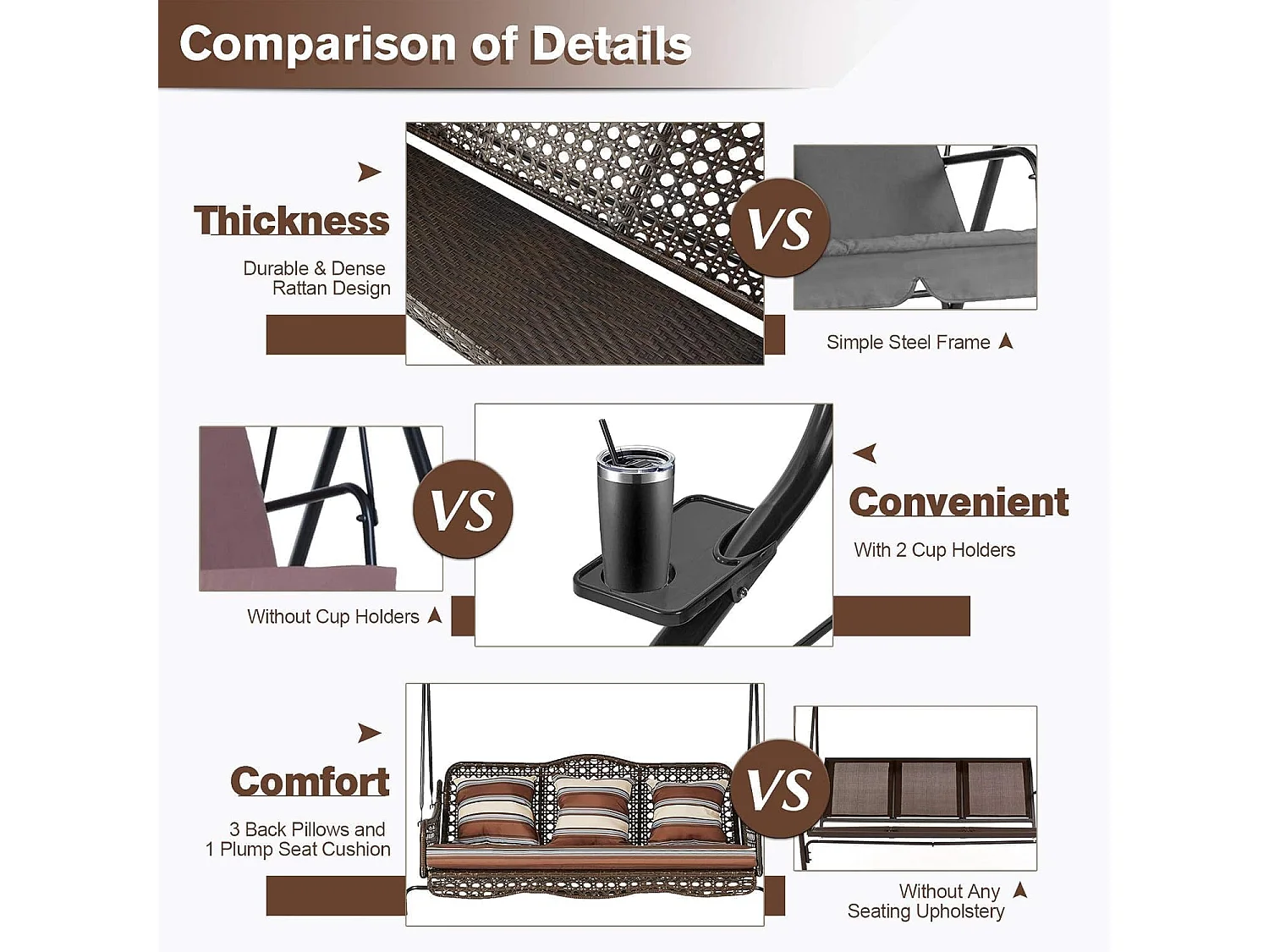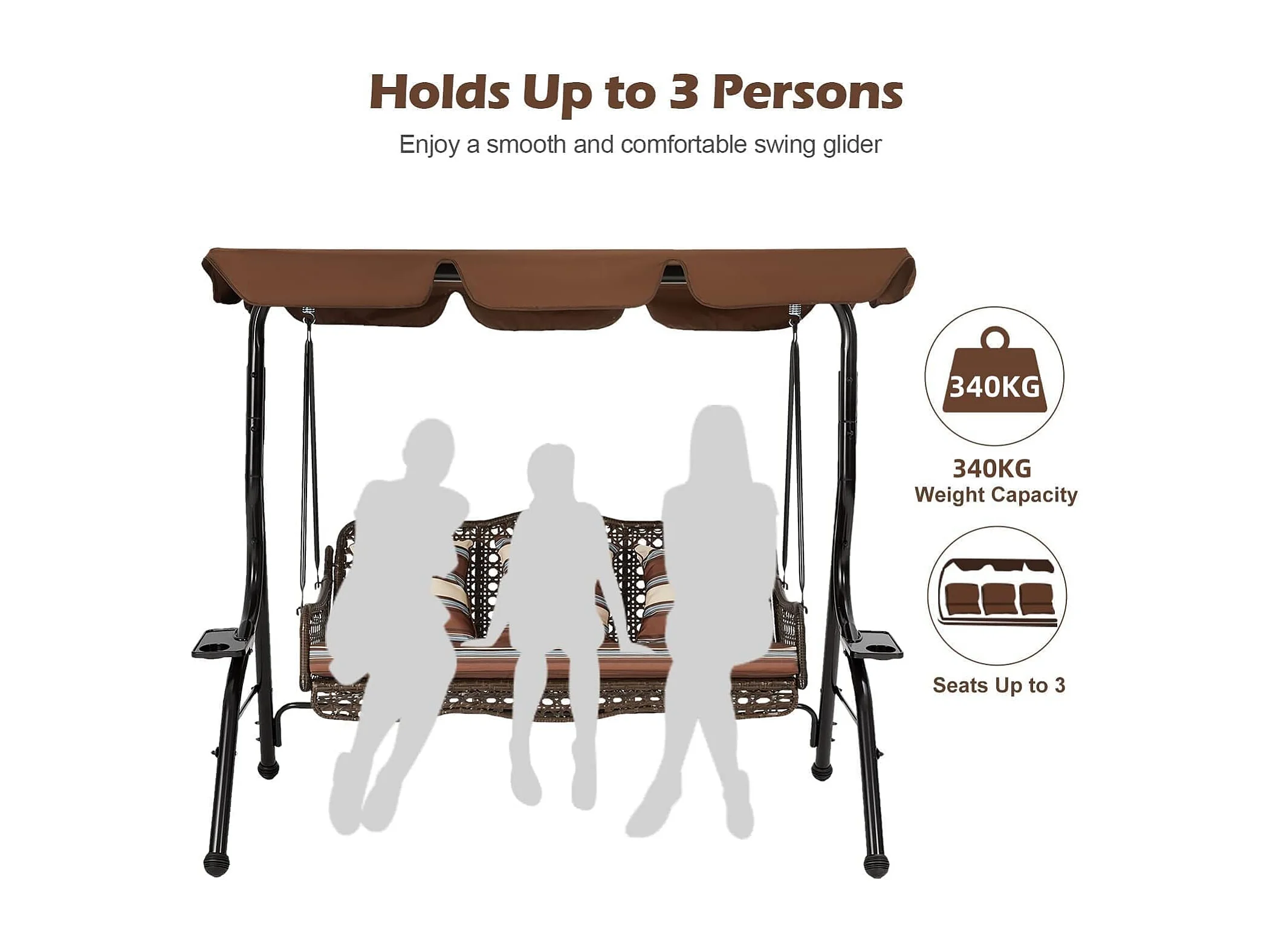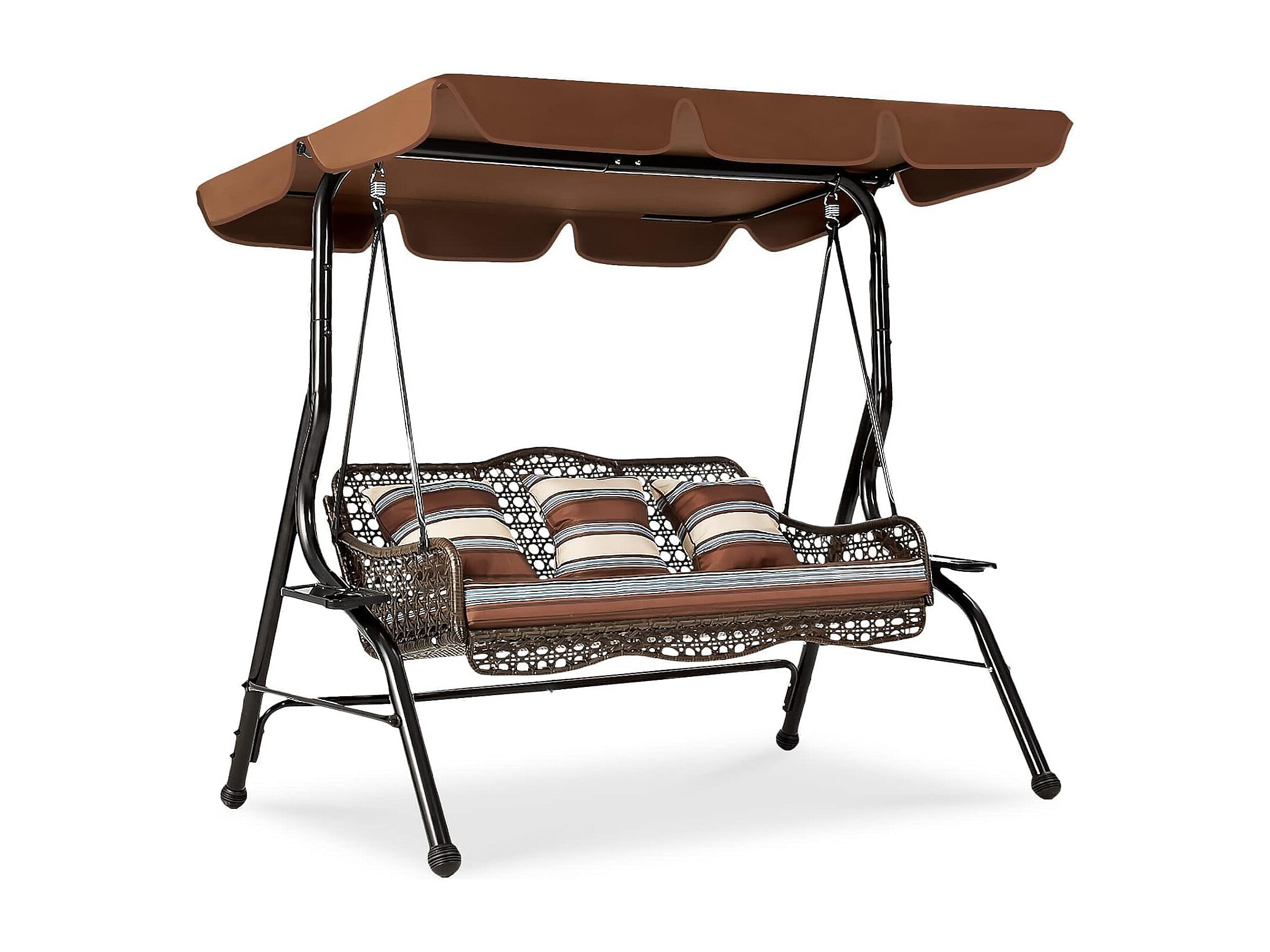 YODOLLA 3-Sitzer Hollywoodschaukel mit verstellbarem Baldachin, 2 Seitentabletts & Kissen - Rattan-Gartenschaukel mit Ständer für Balkon, Terrasse und Garten