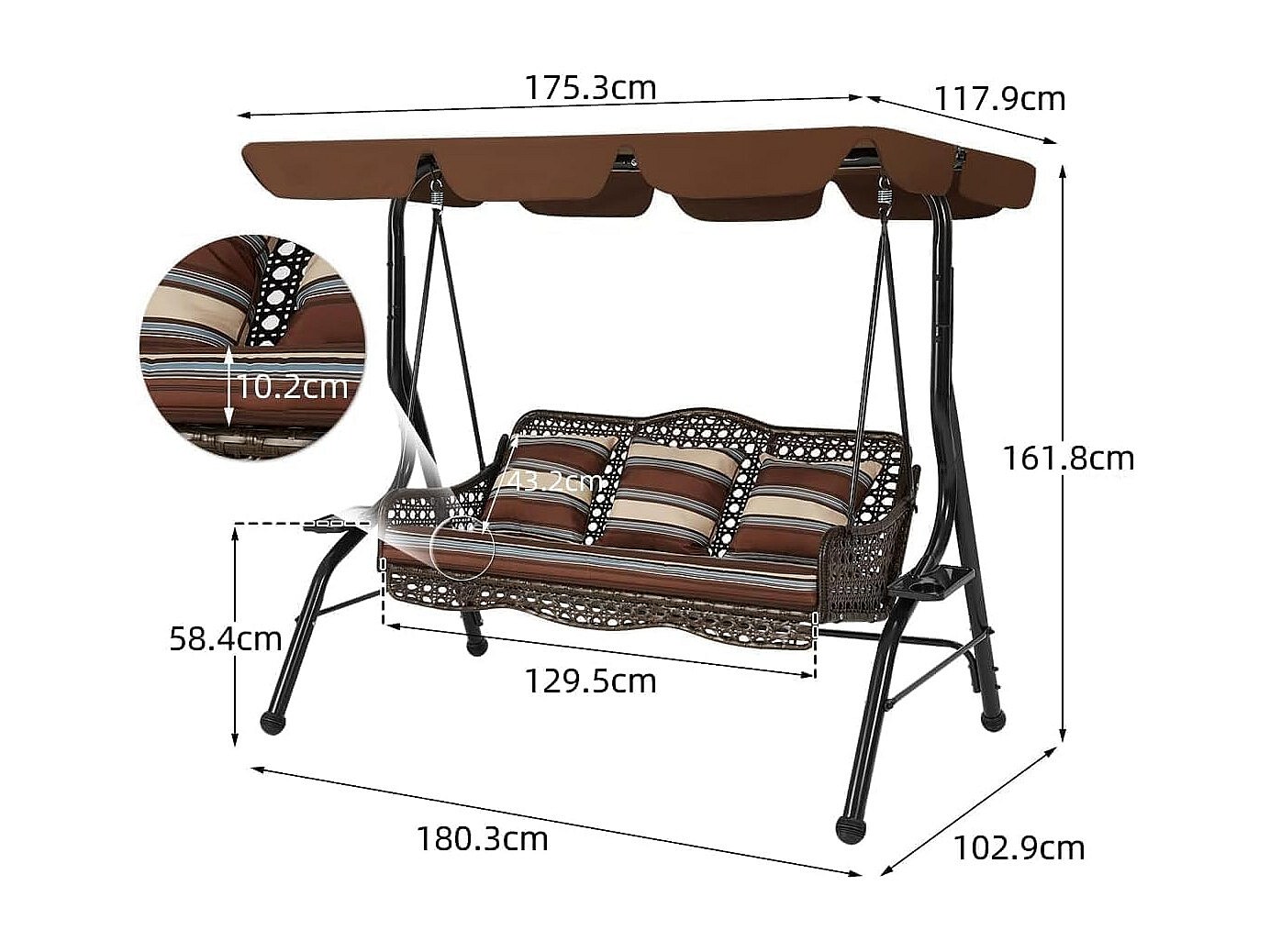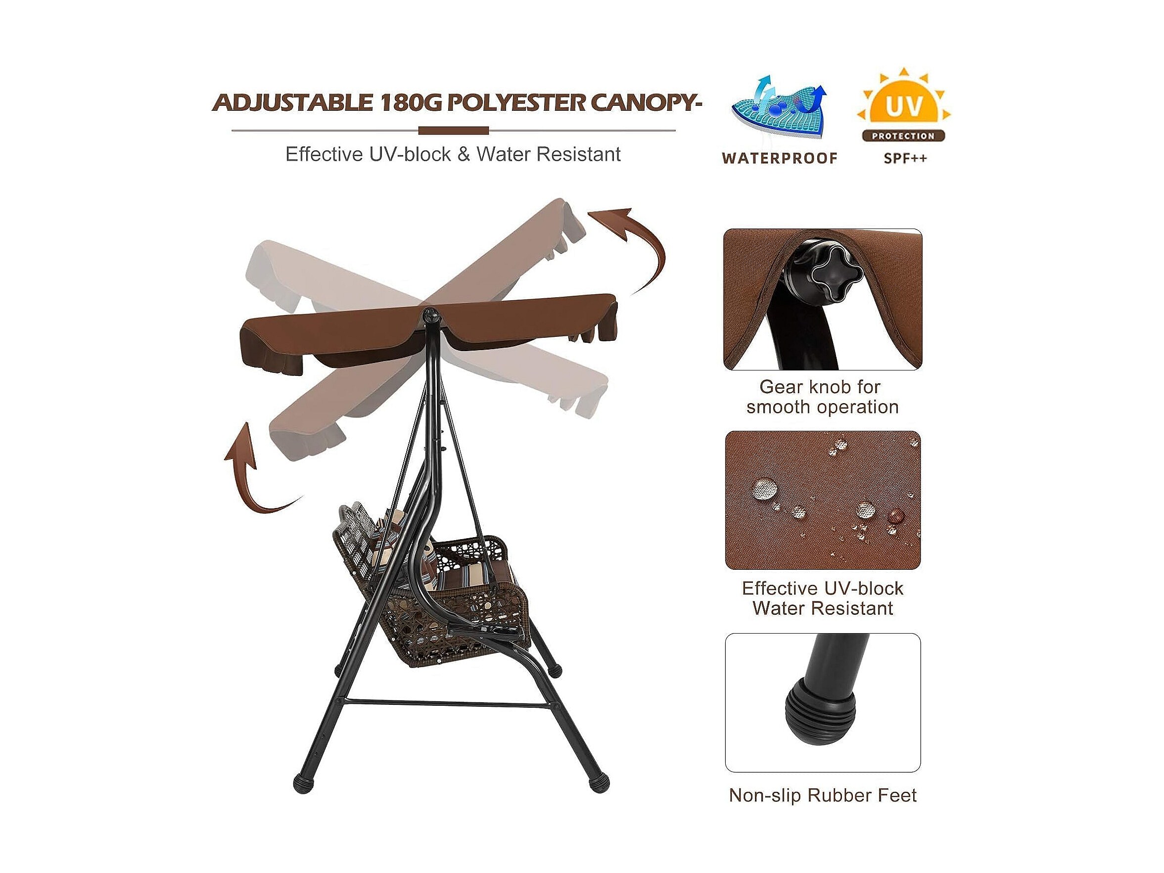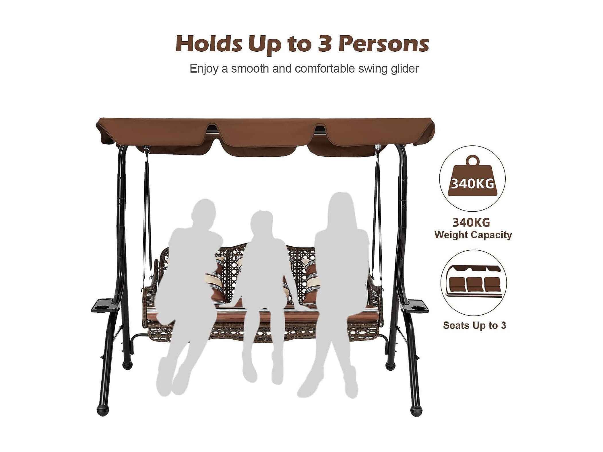 YODOLLA 3-Sitzer Hollywoodschaukel mit verstellbarem Baldachin, 2 Seitentabletts & Kissen - Rattan-Gartenschaukel mit Ständer für Balkon, Terrasse und Garten