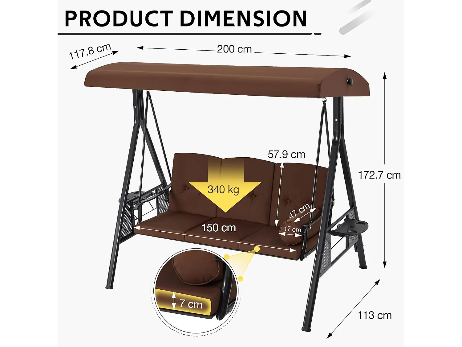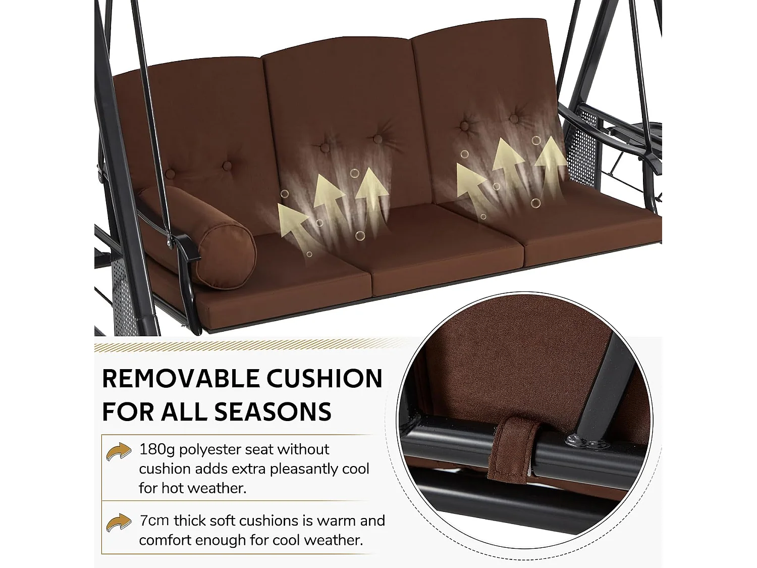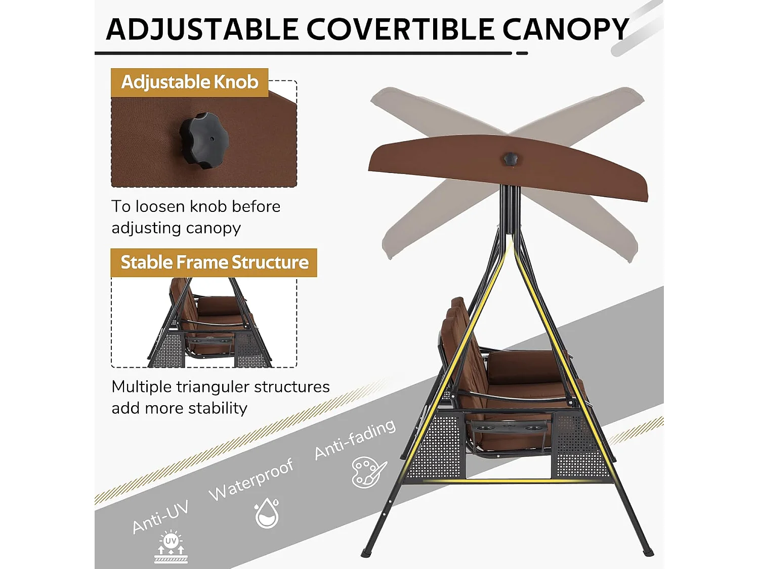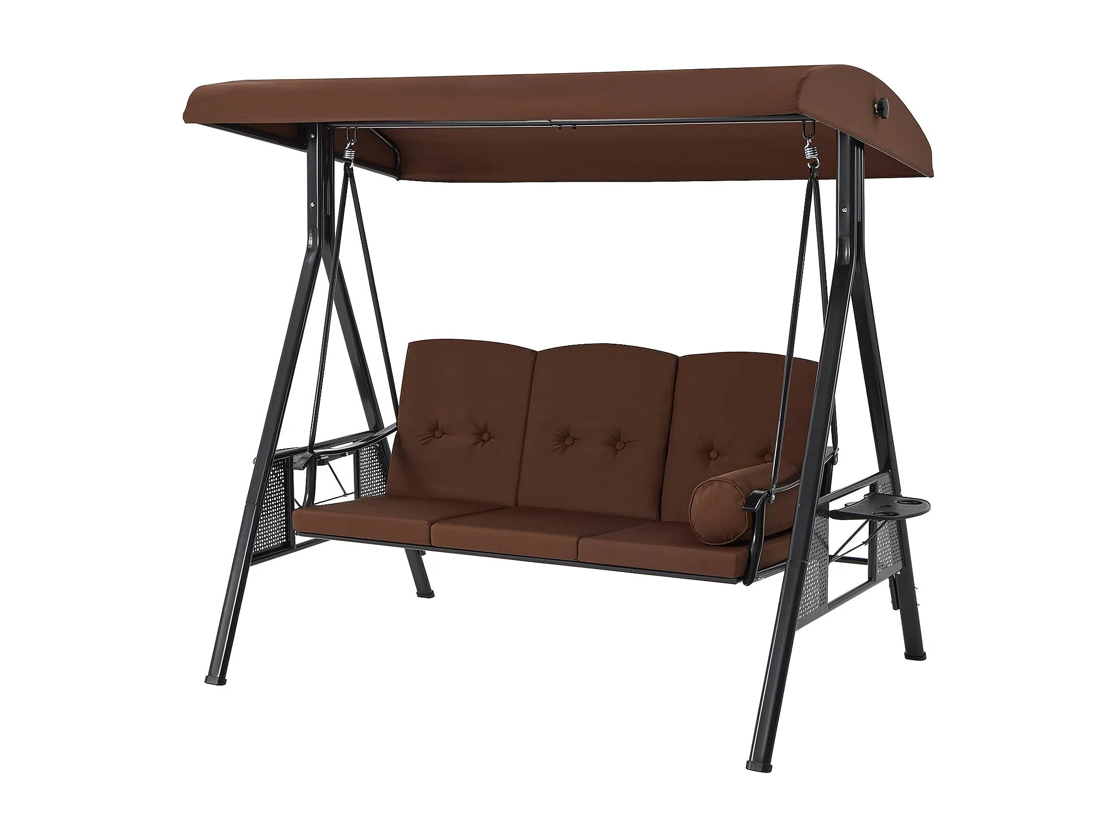 YODOLLA 3-Sitzer Hollywoodschaukel mit verstellbarem Baldachin & abnehmbarem Kissen, für Hinterhof, Garten, Hof, Pool, Balkon, Braun